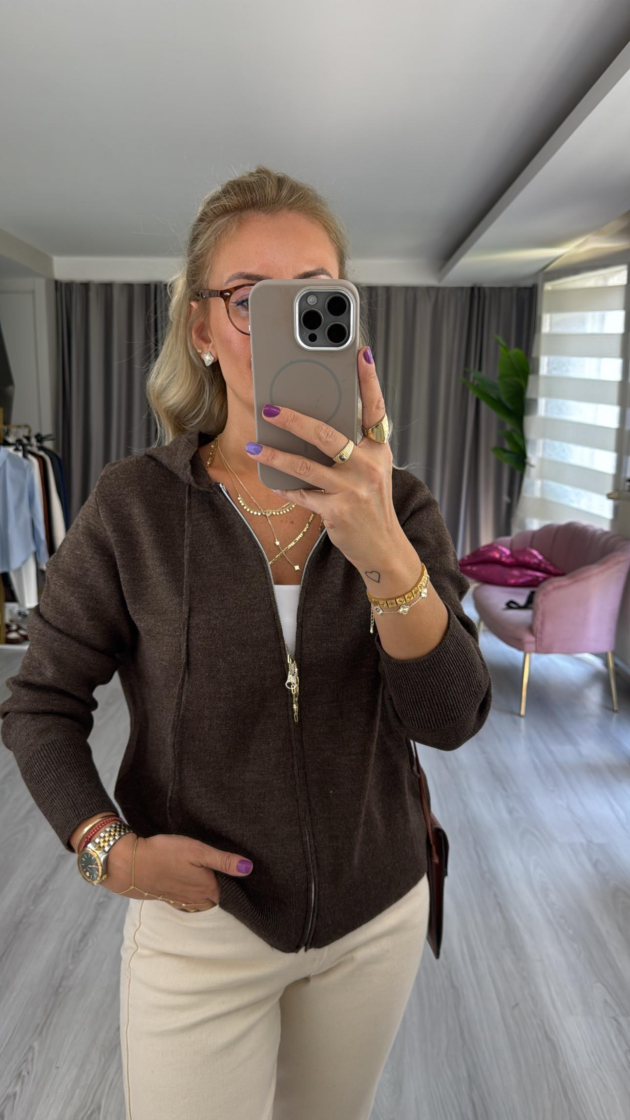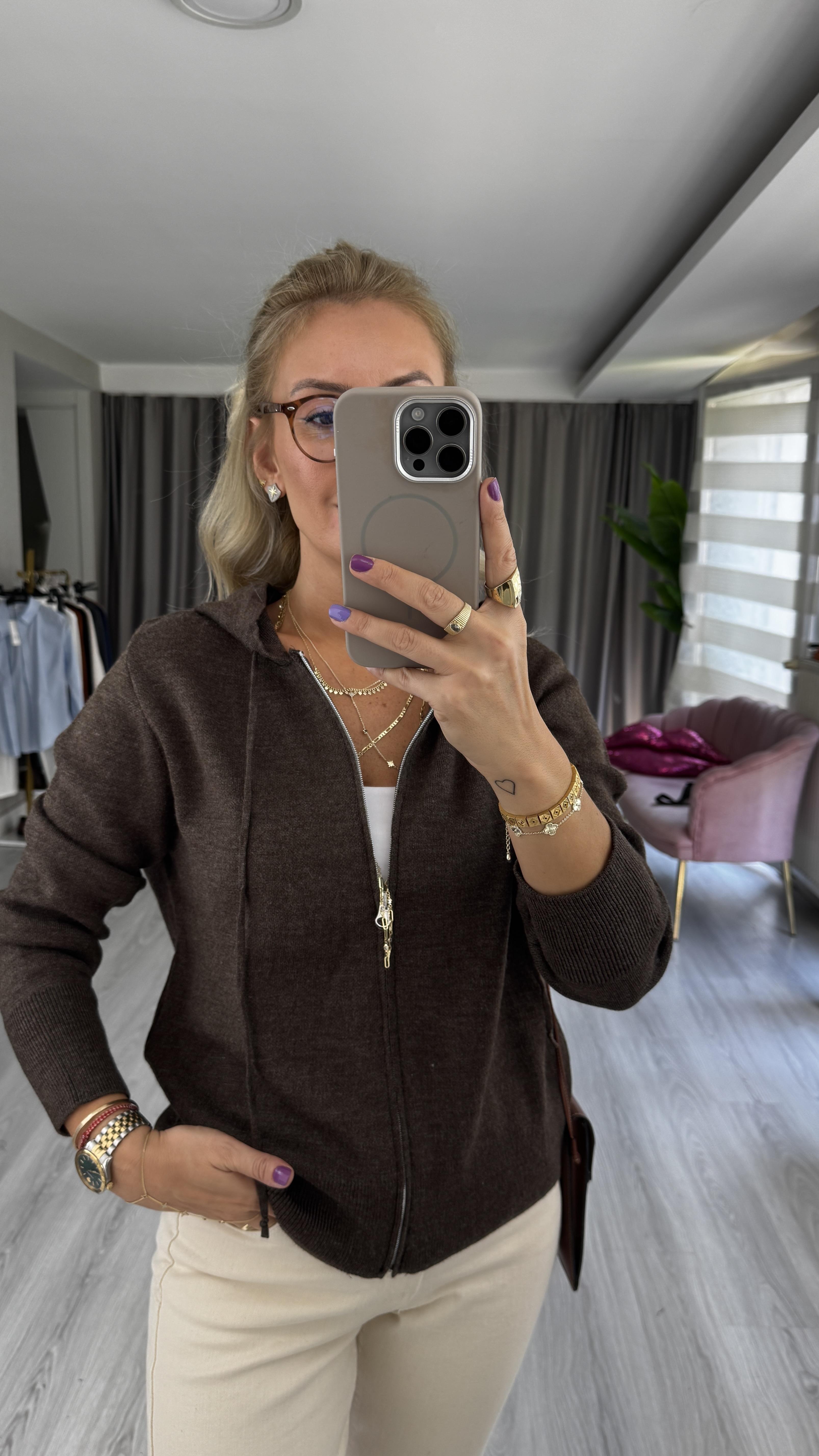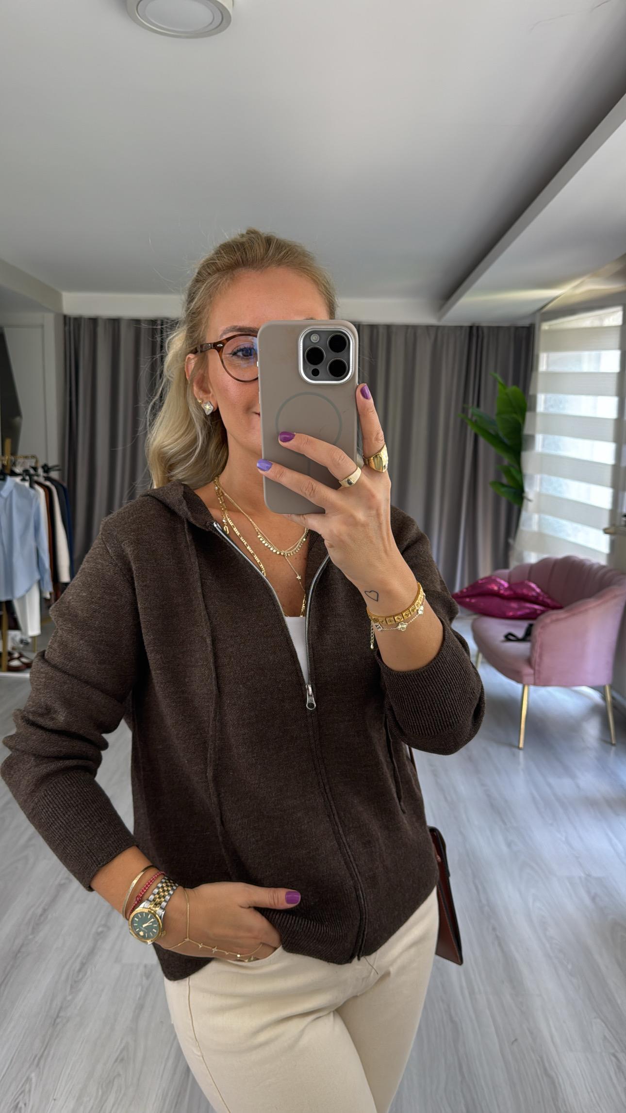 Önden Fermuarlı Kapüşonlu Acı Kahve Triko Ceket