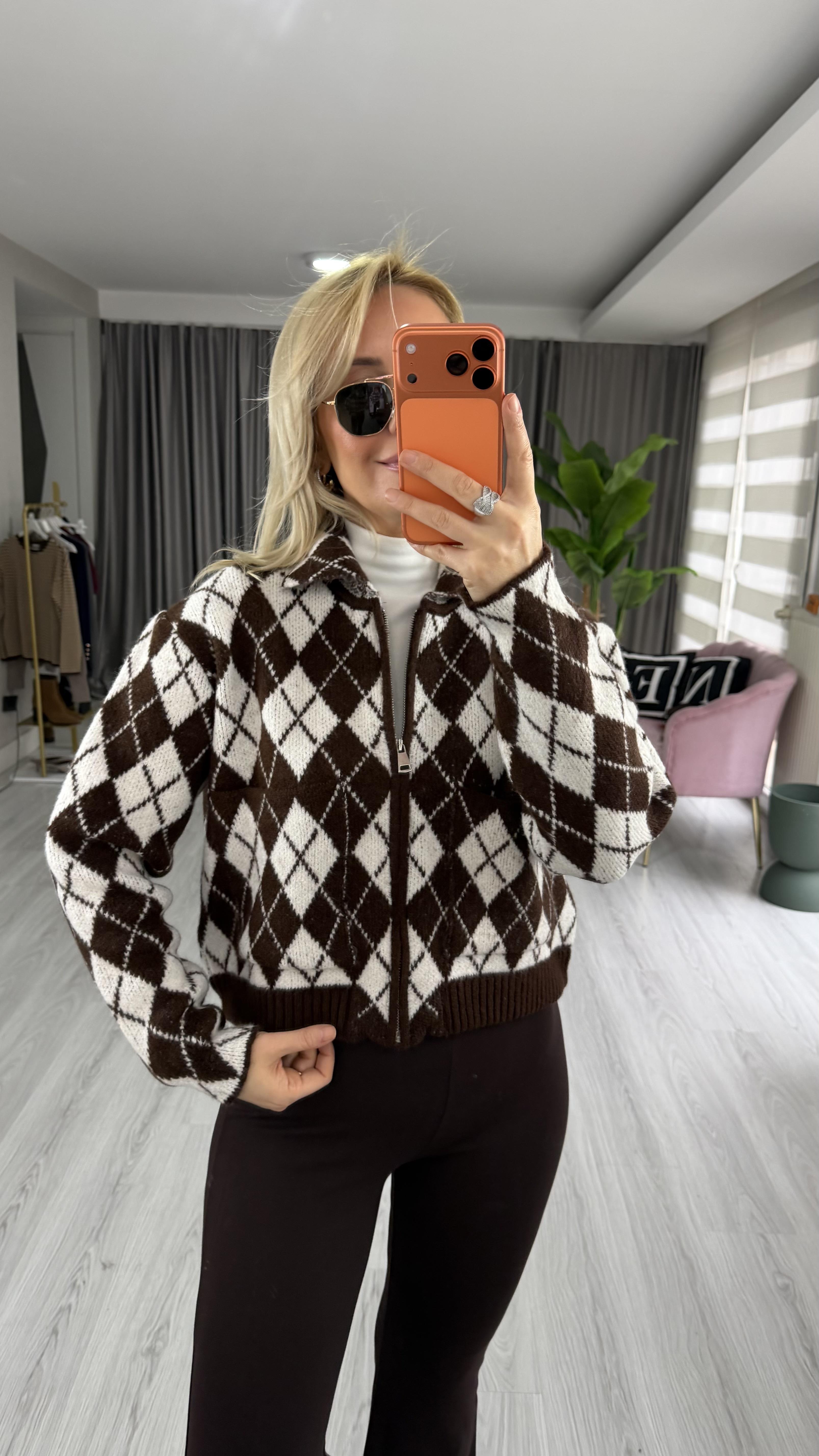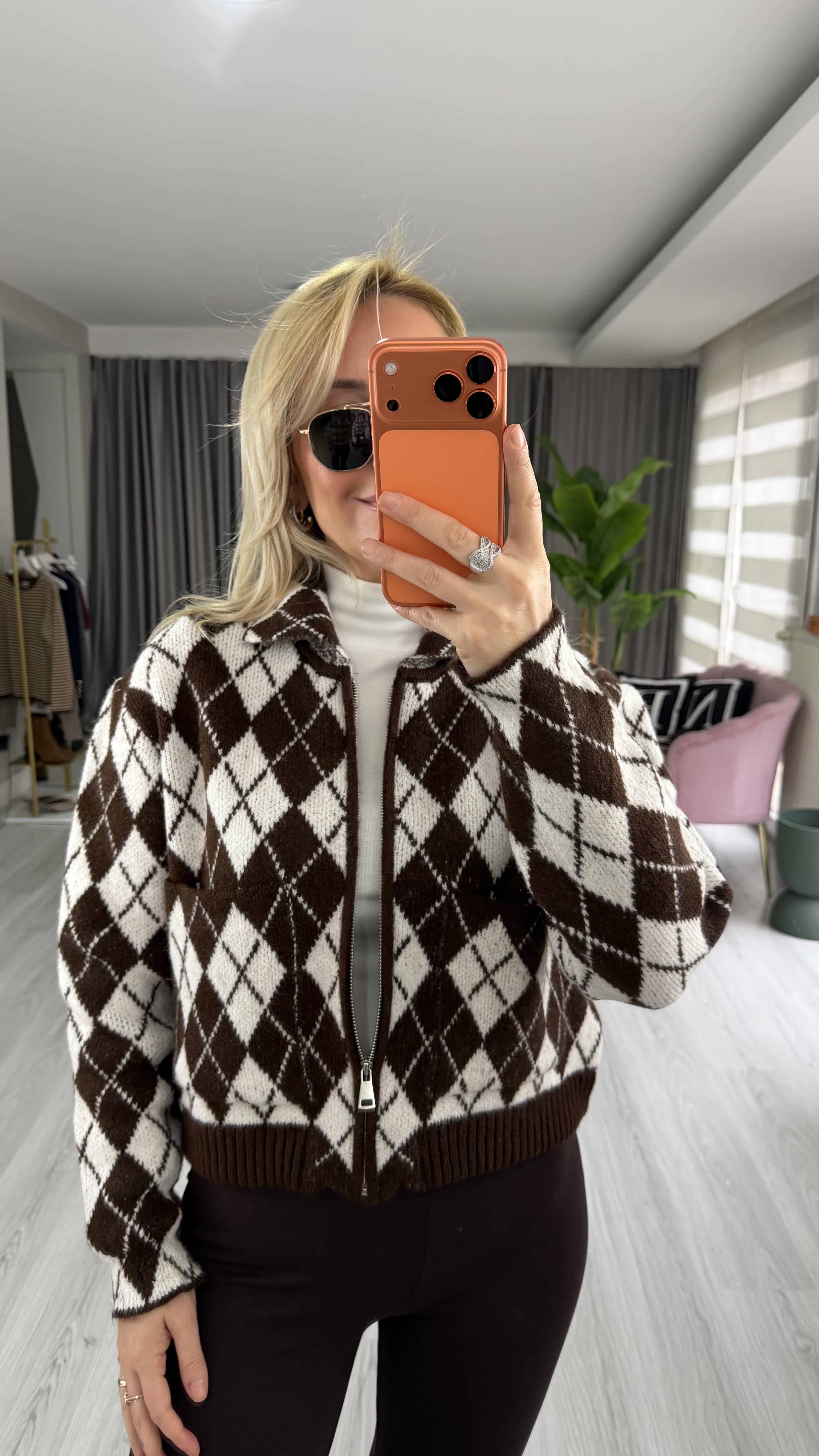Baklava Desen Kahve Krem Fermuarlı Triko Ceket