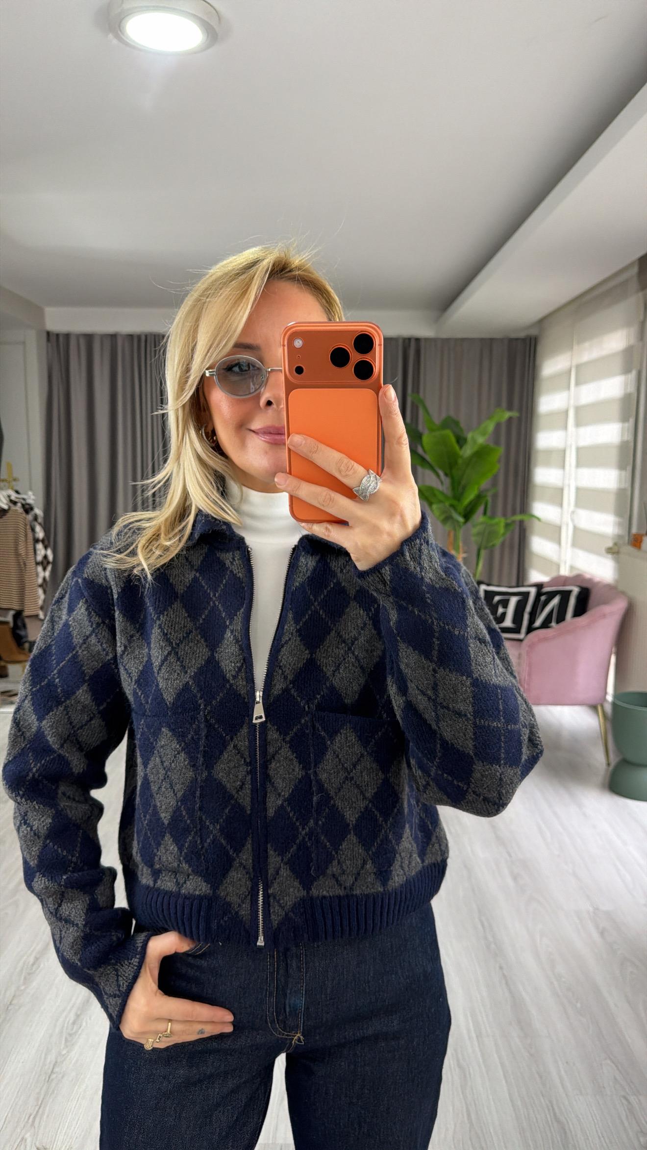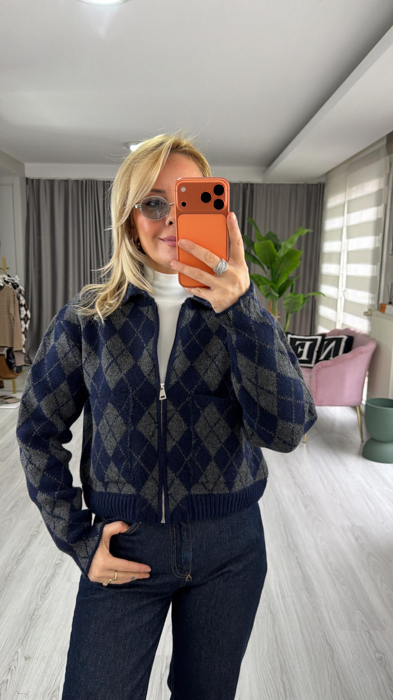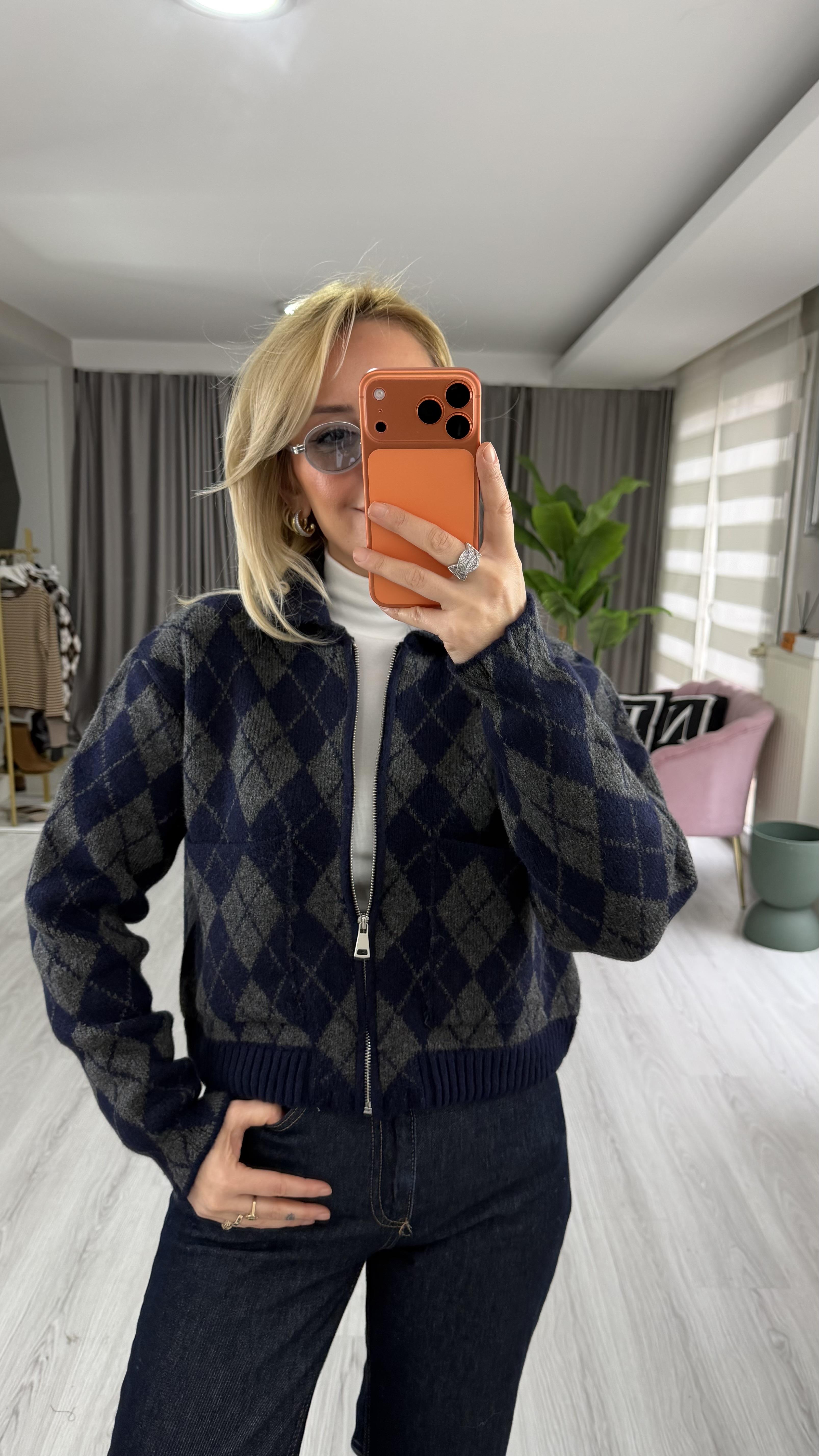 Baklava Desen Lacivert Antrasit Fermuarlı Triko Ceket