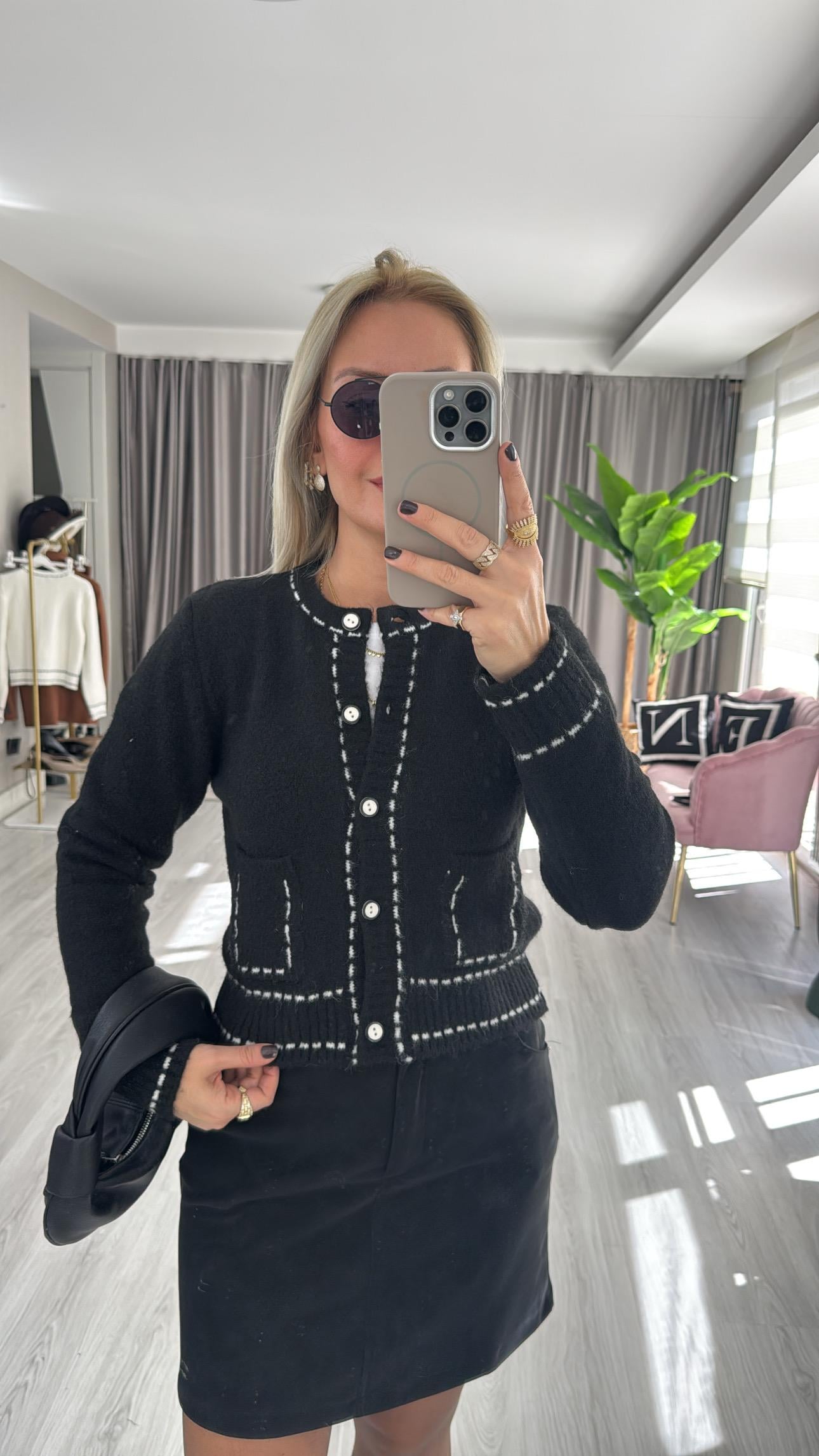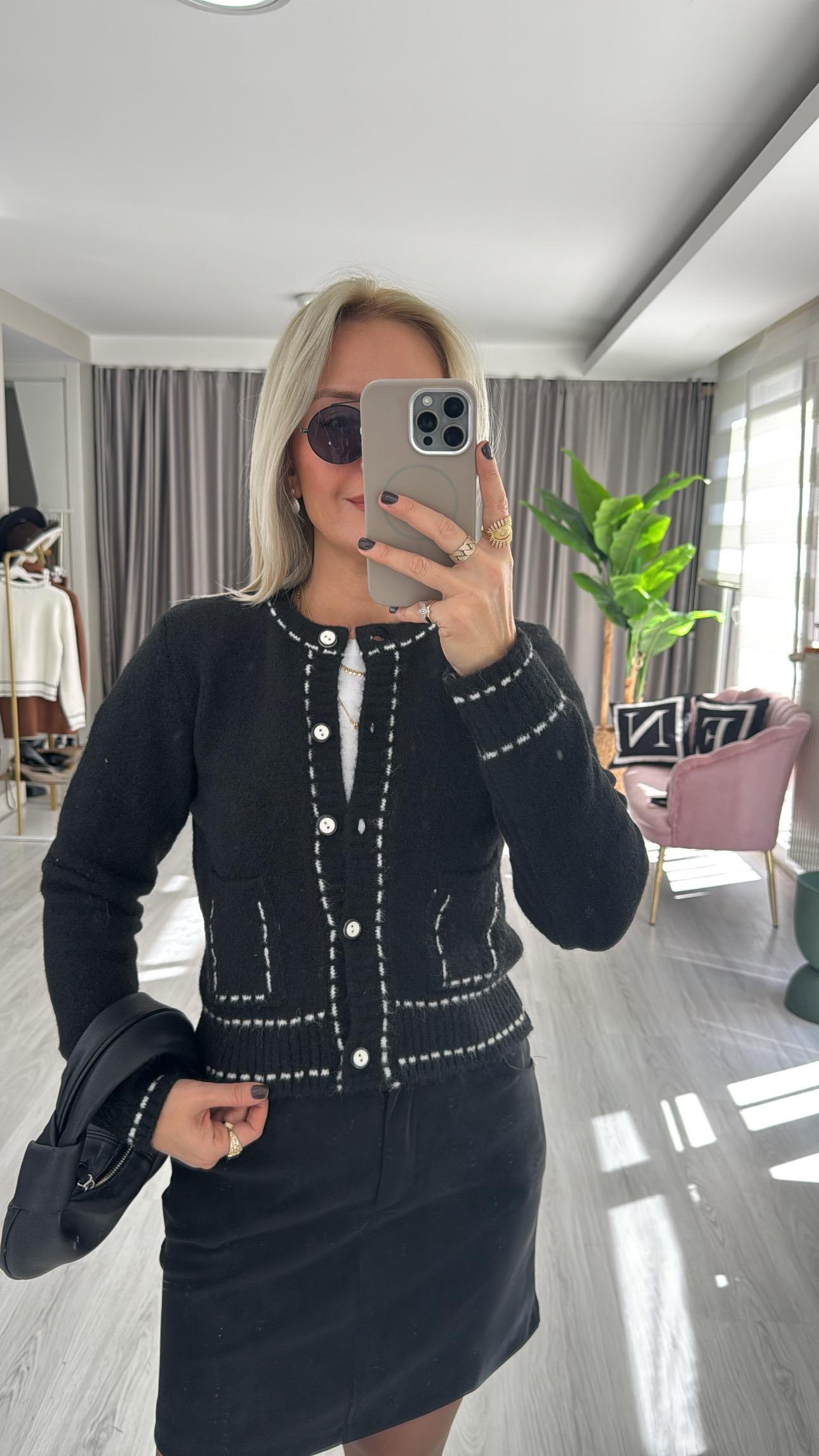 Beyaz Biyeli Cepli Siyah Triko Hırka
