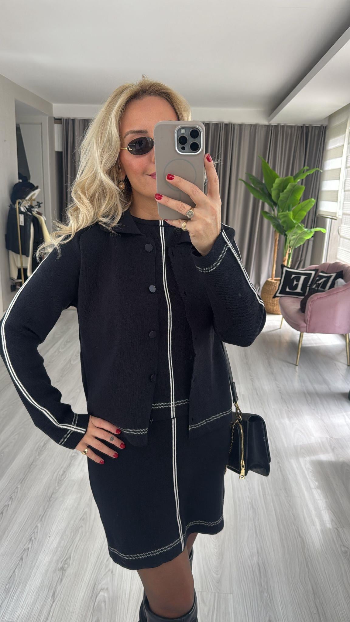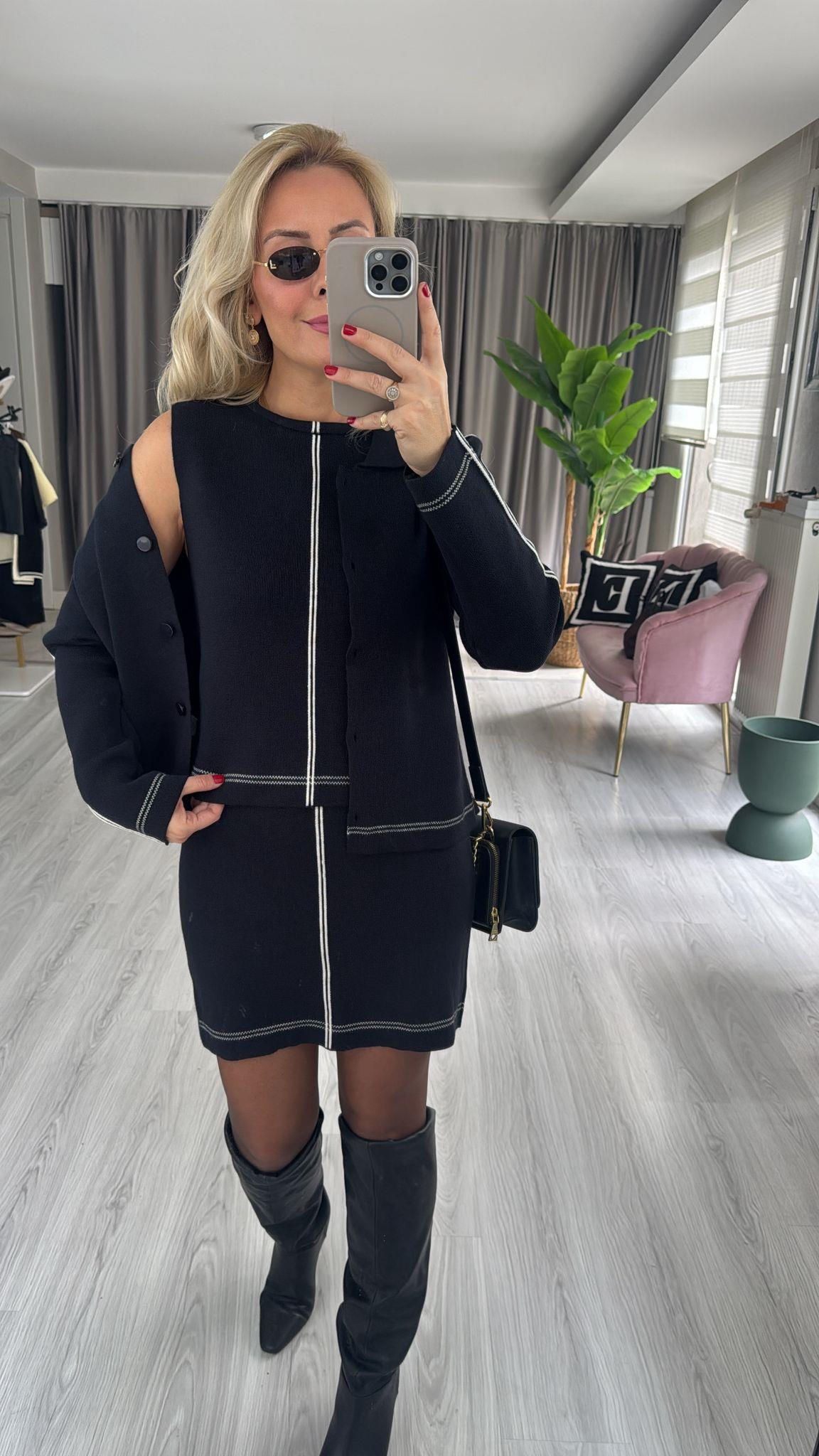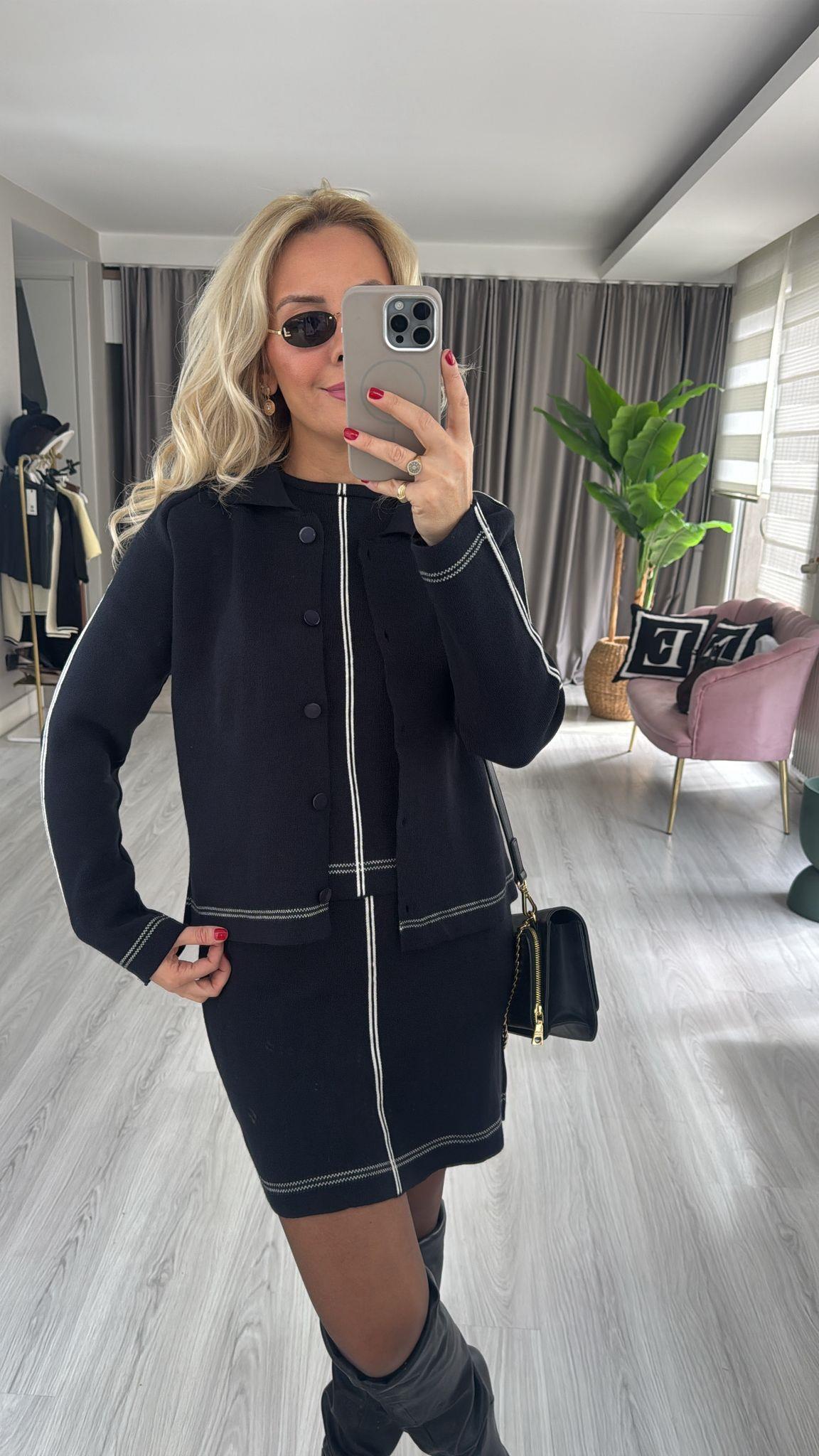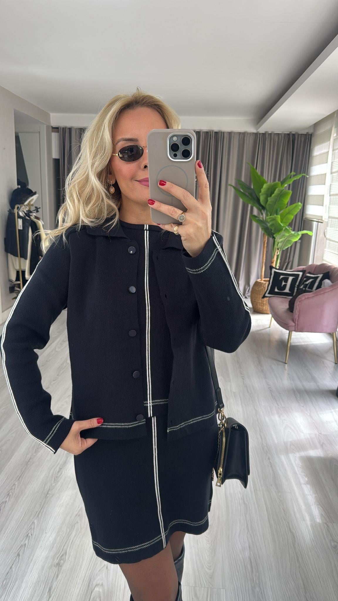 Beyaz Biyeli Lacivert Üçlü Triko Takım