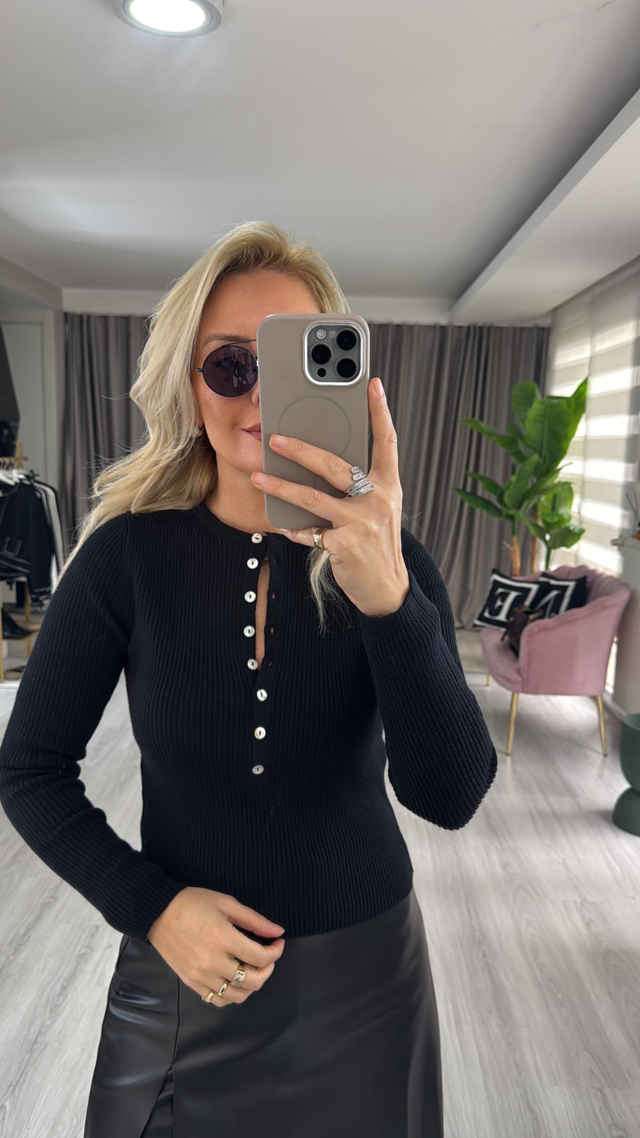 Bisiklet Yaka Düğme Detaylı Siyah Dilvin Triko