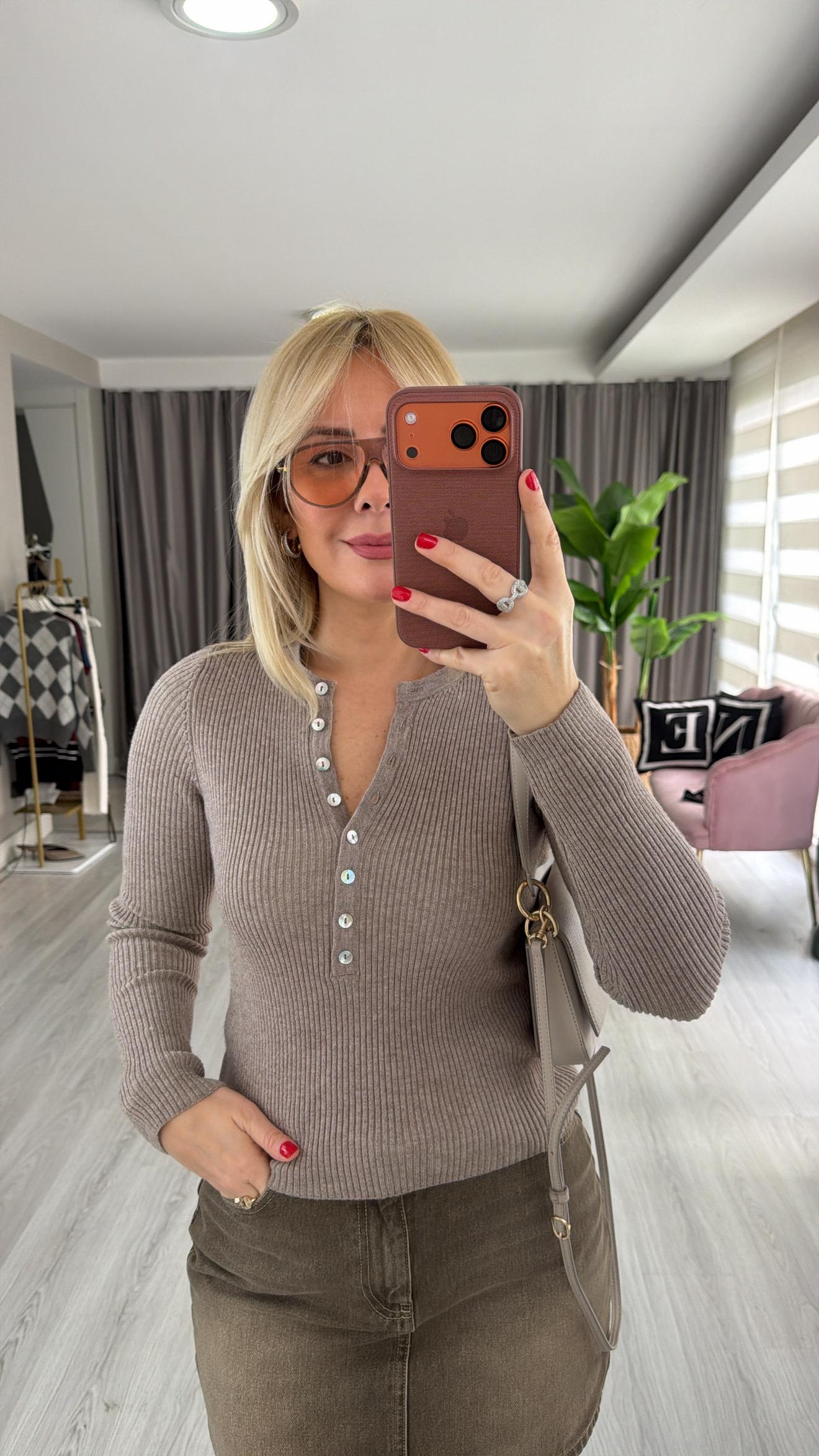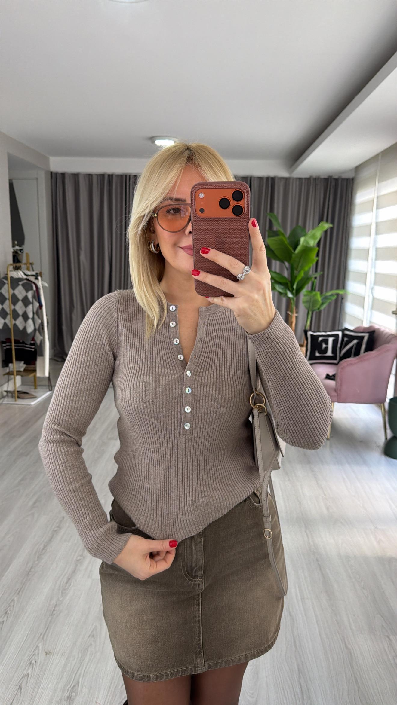 Bisiklet Yaka Düğmeli Fitilli Bej Triko