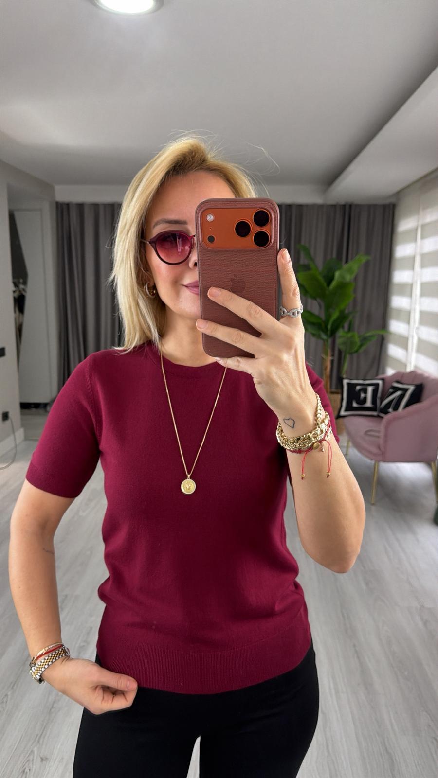Dilvin Bisiklet Yaka Kısa Kol Bordo Basic Triko Bluz