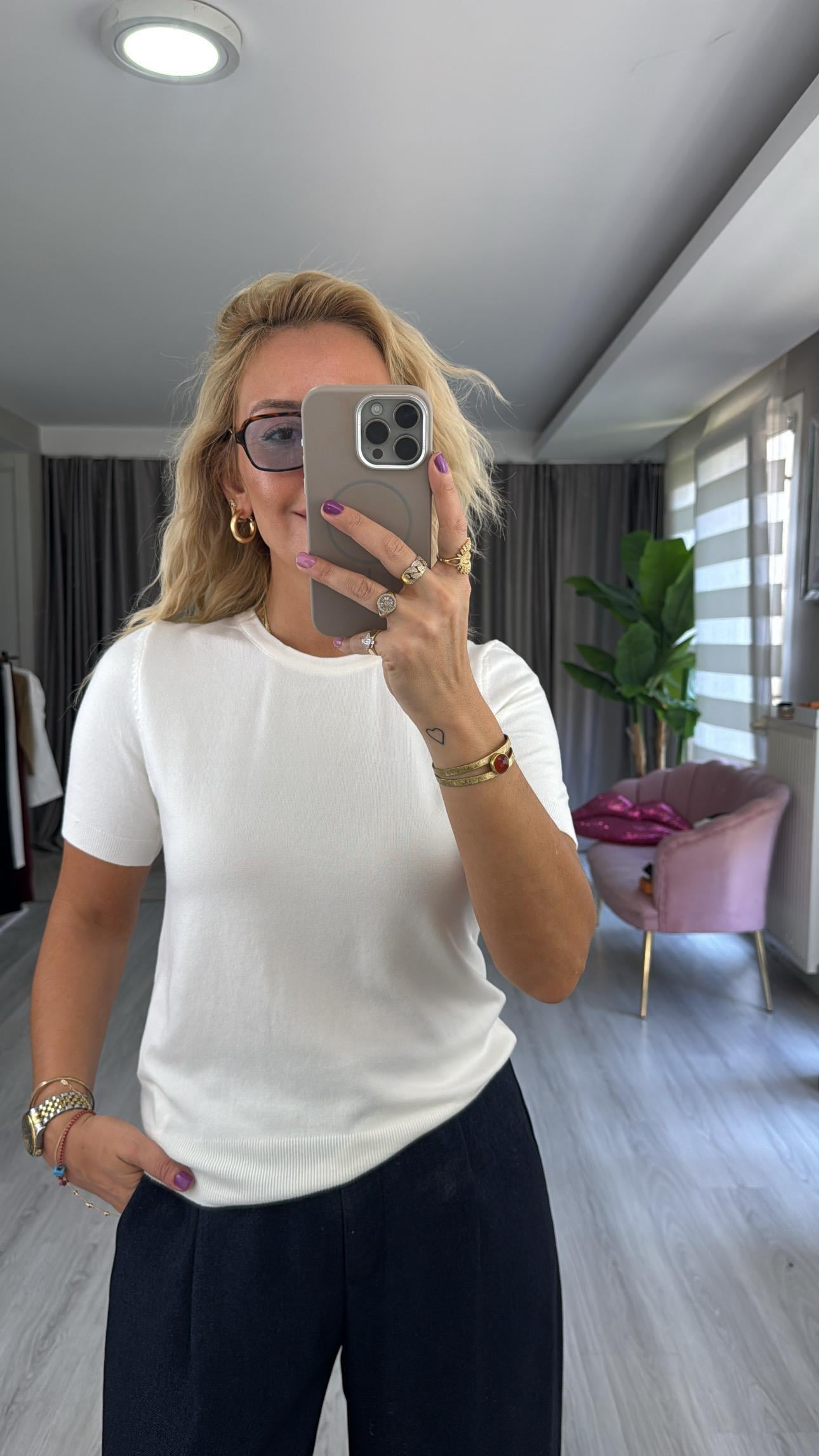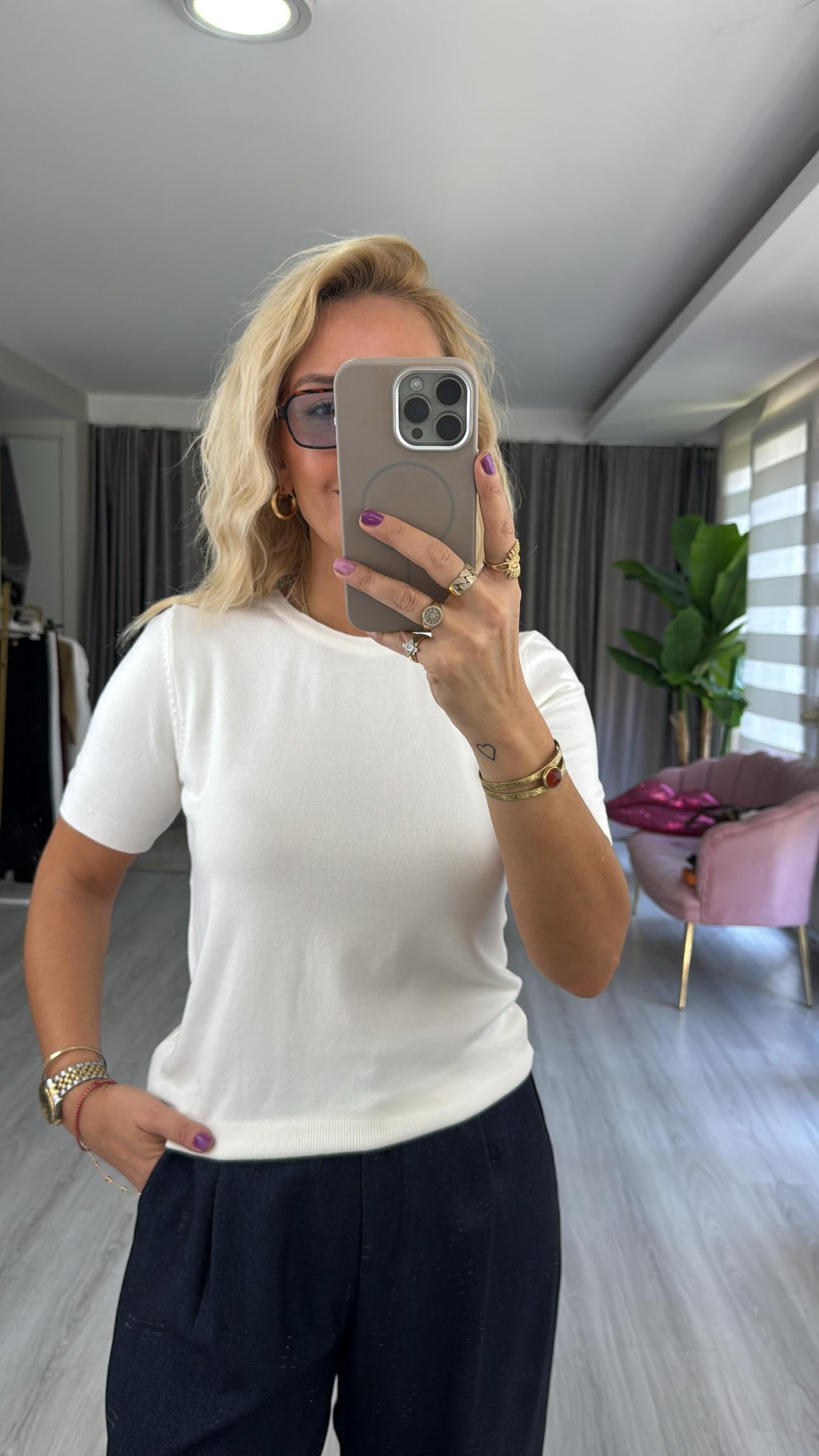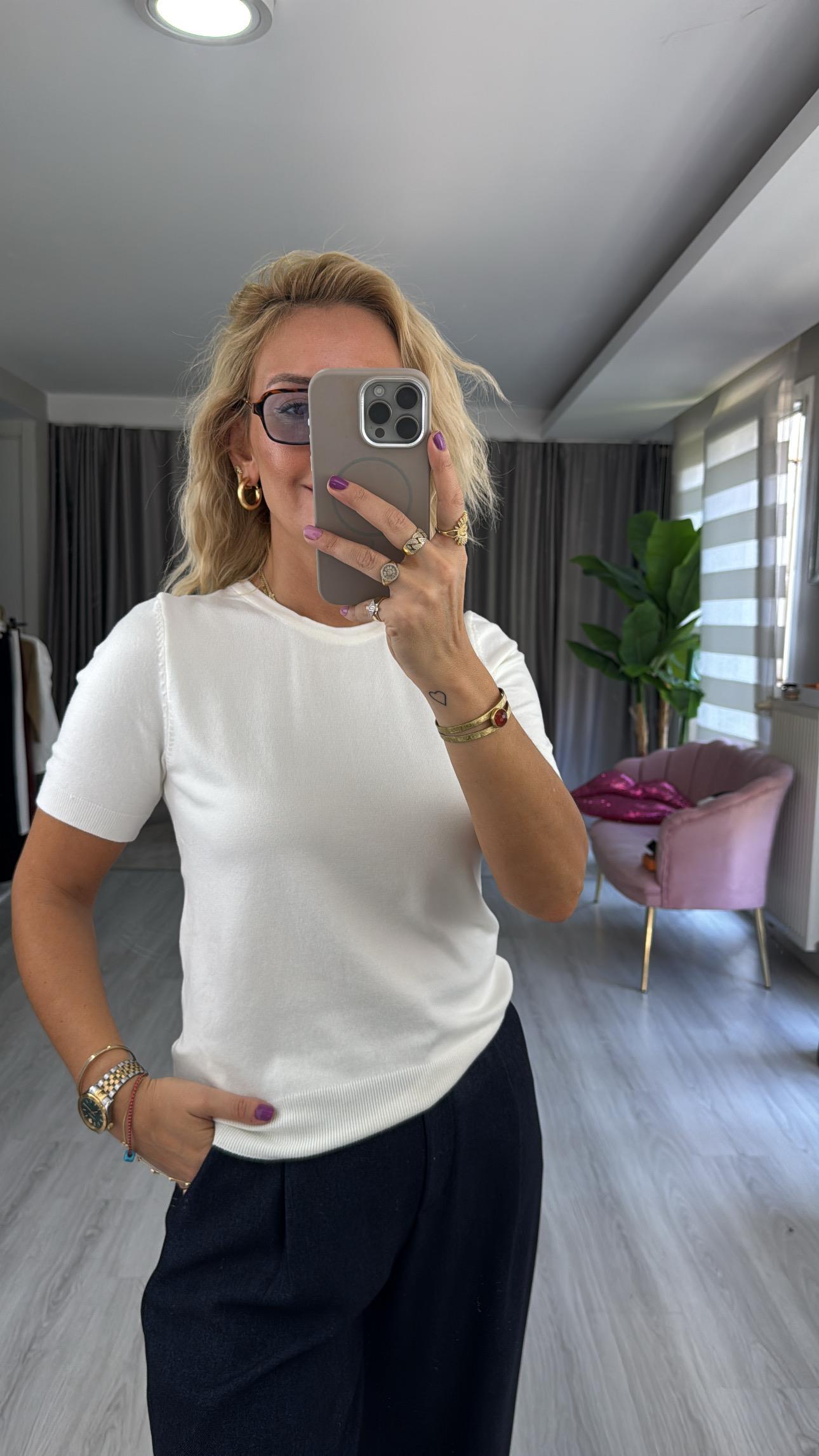 Dilvin Bisiklet Yaka Kısa Kol Ekru Basic Triko Bluz