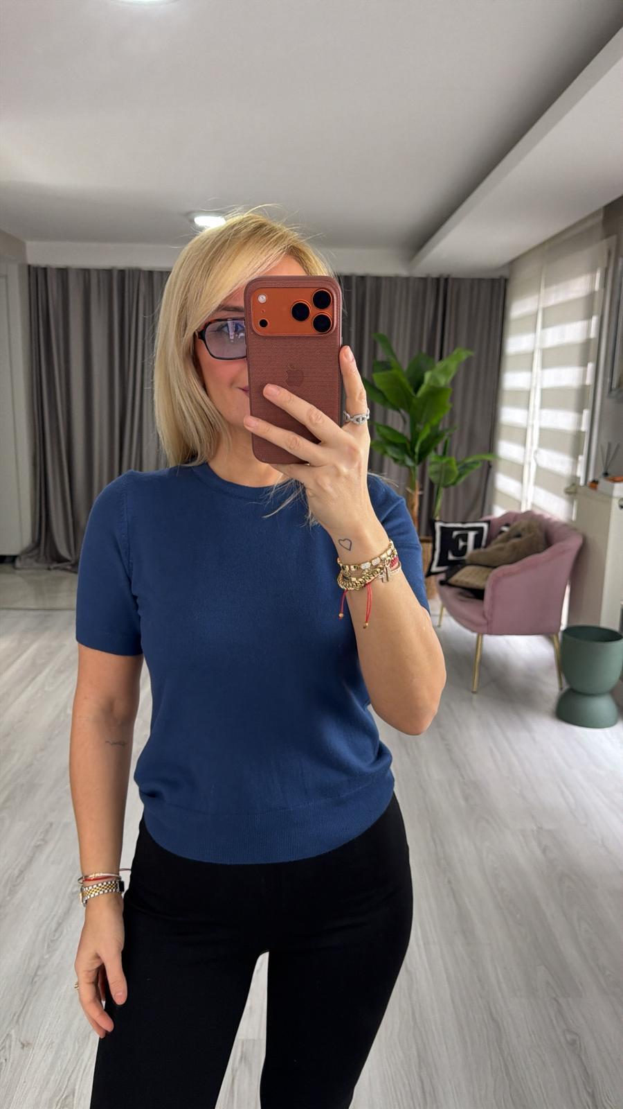 Dilvin Bisiklet Yaka Kısa Kol İndigo Basic Triko Bluz