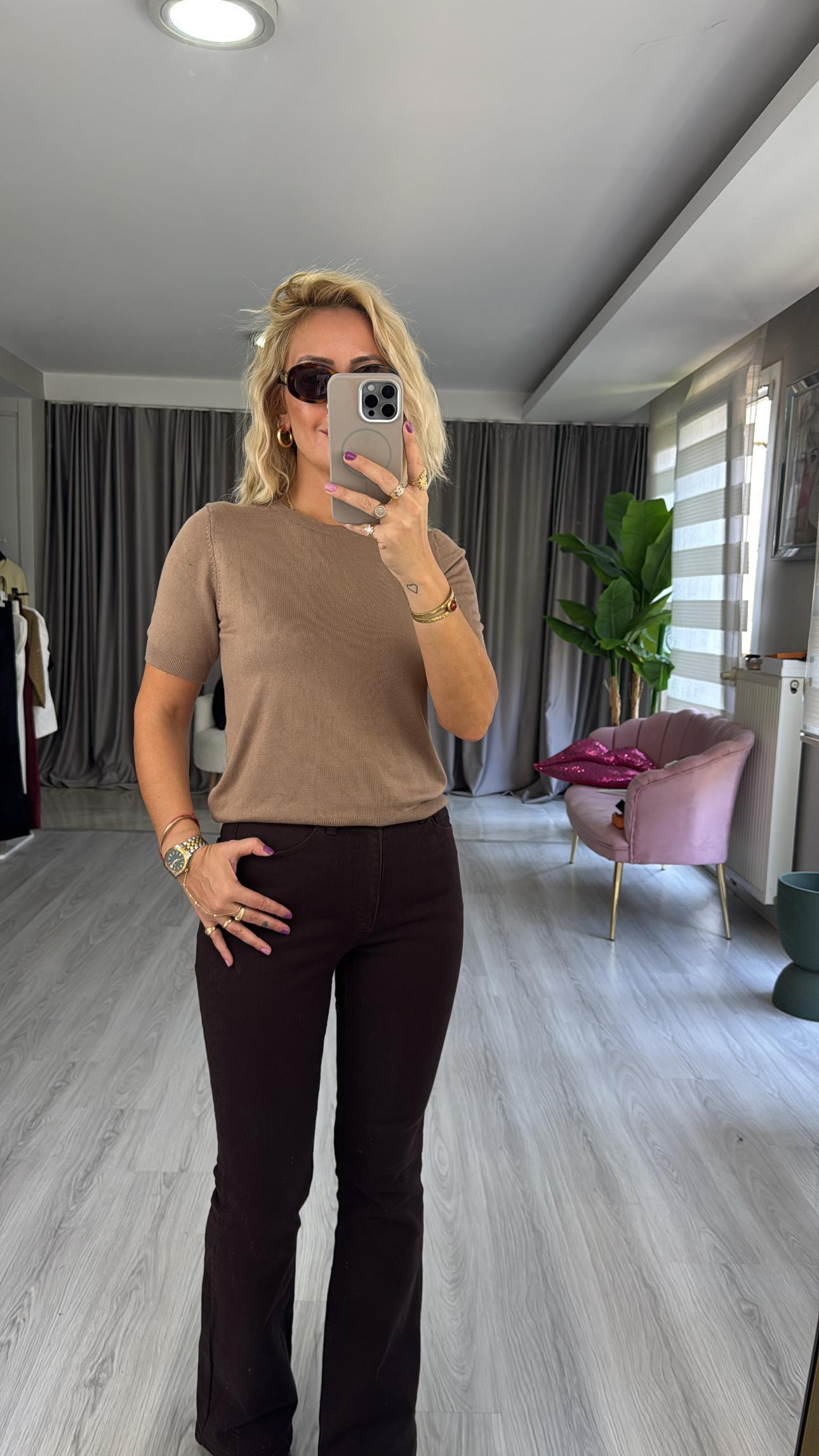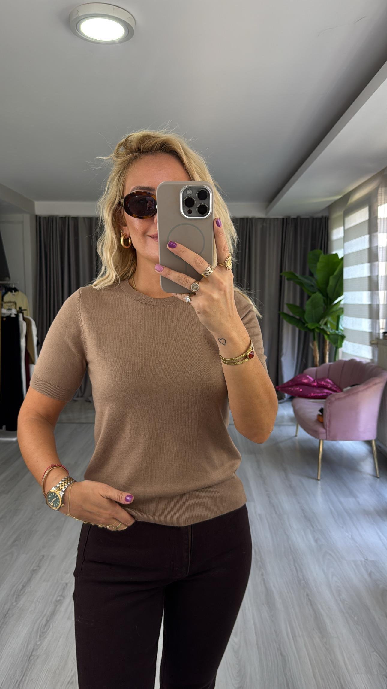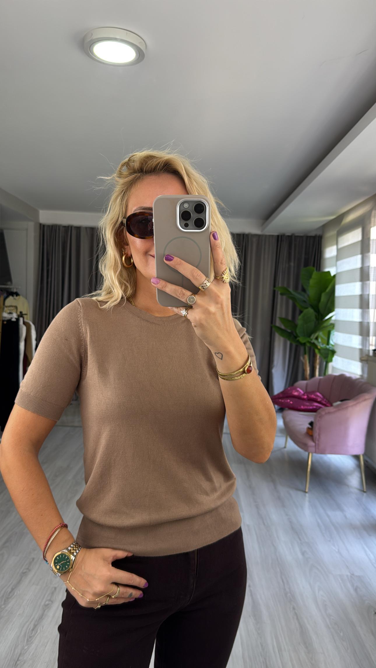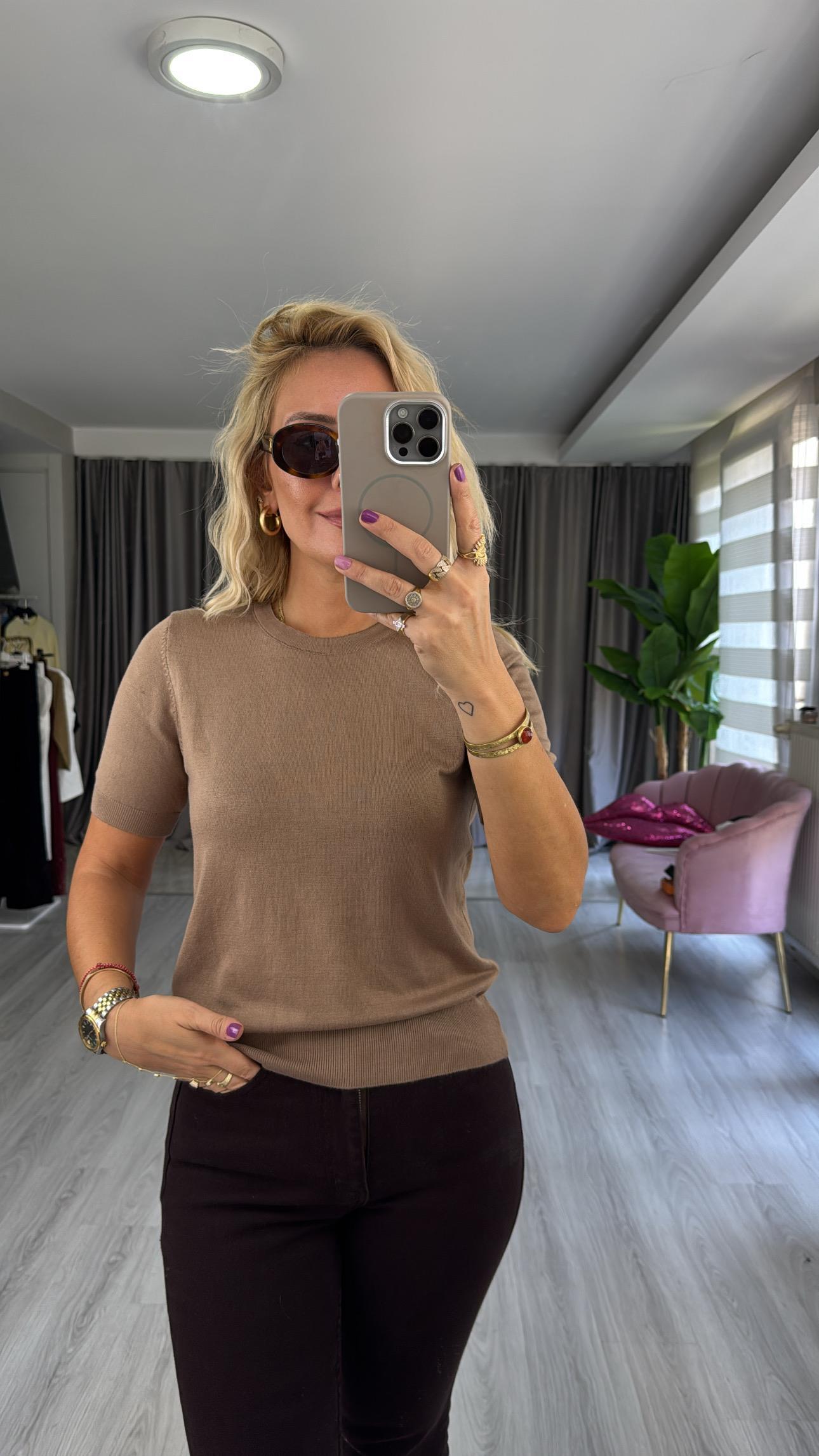 Dilvin Bisiklet Yaka Kısa Kol Vizon Basic Triko Bluz