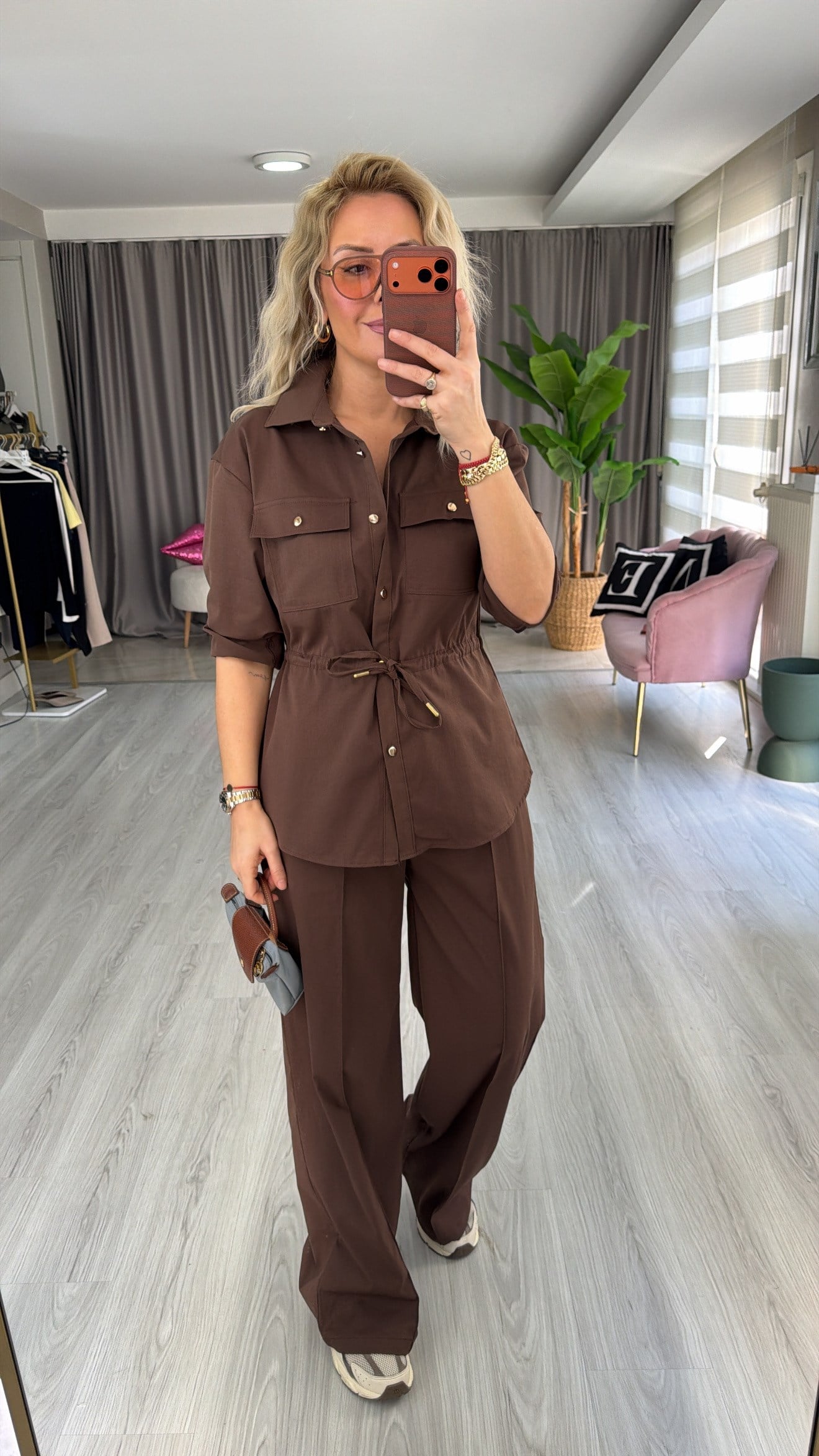 Gold Düğmeli Beli Ayarlanabilir Tencel Kahverengi Takım