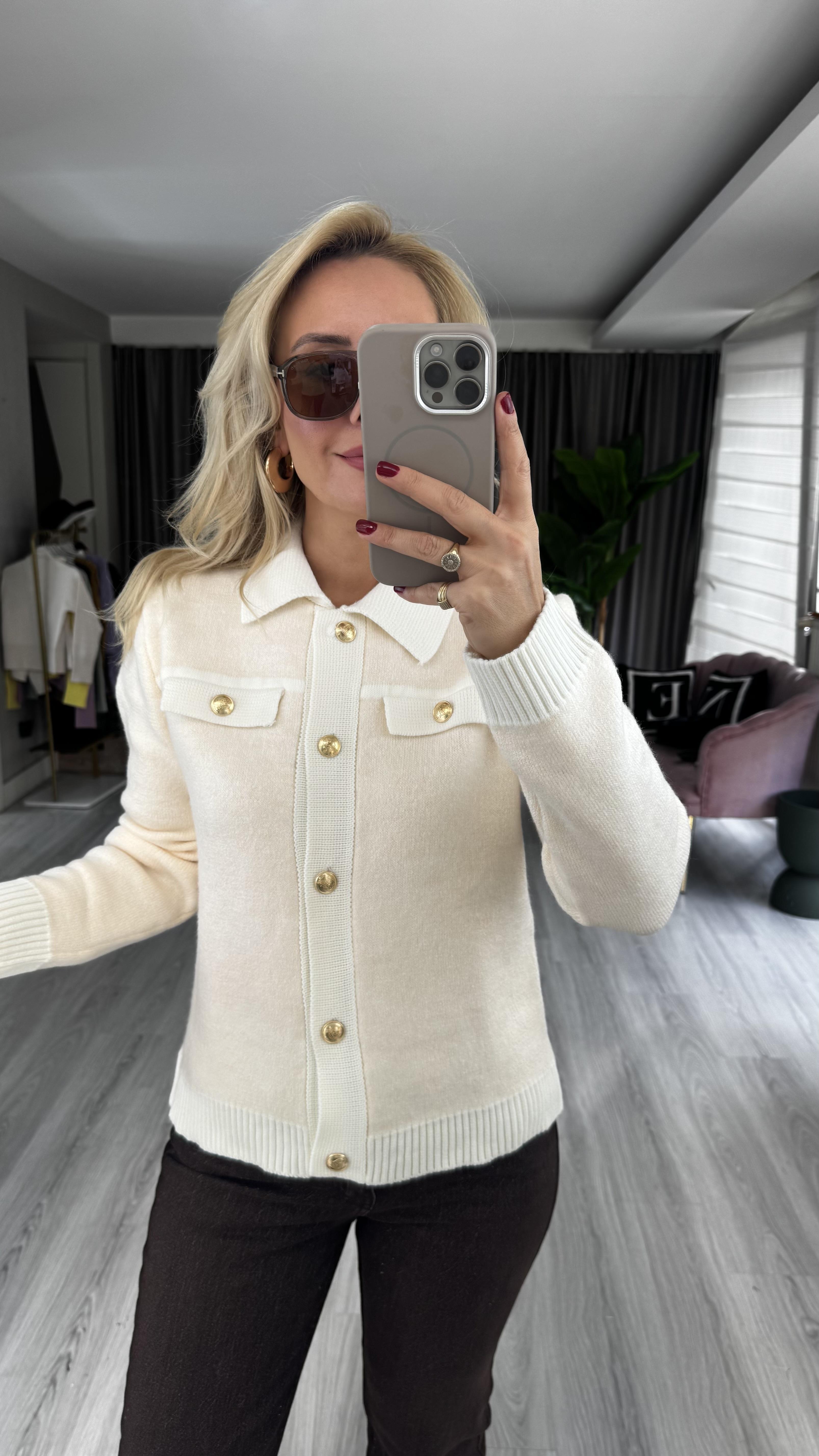 Gold Düğmeli Tok Doku Kemik Krem Triko Hırka