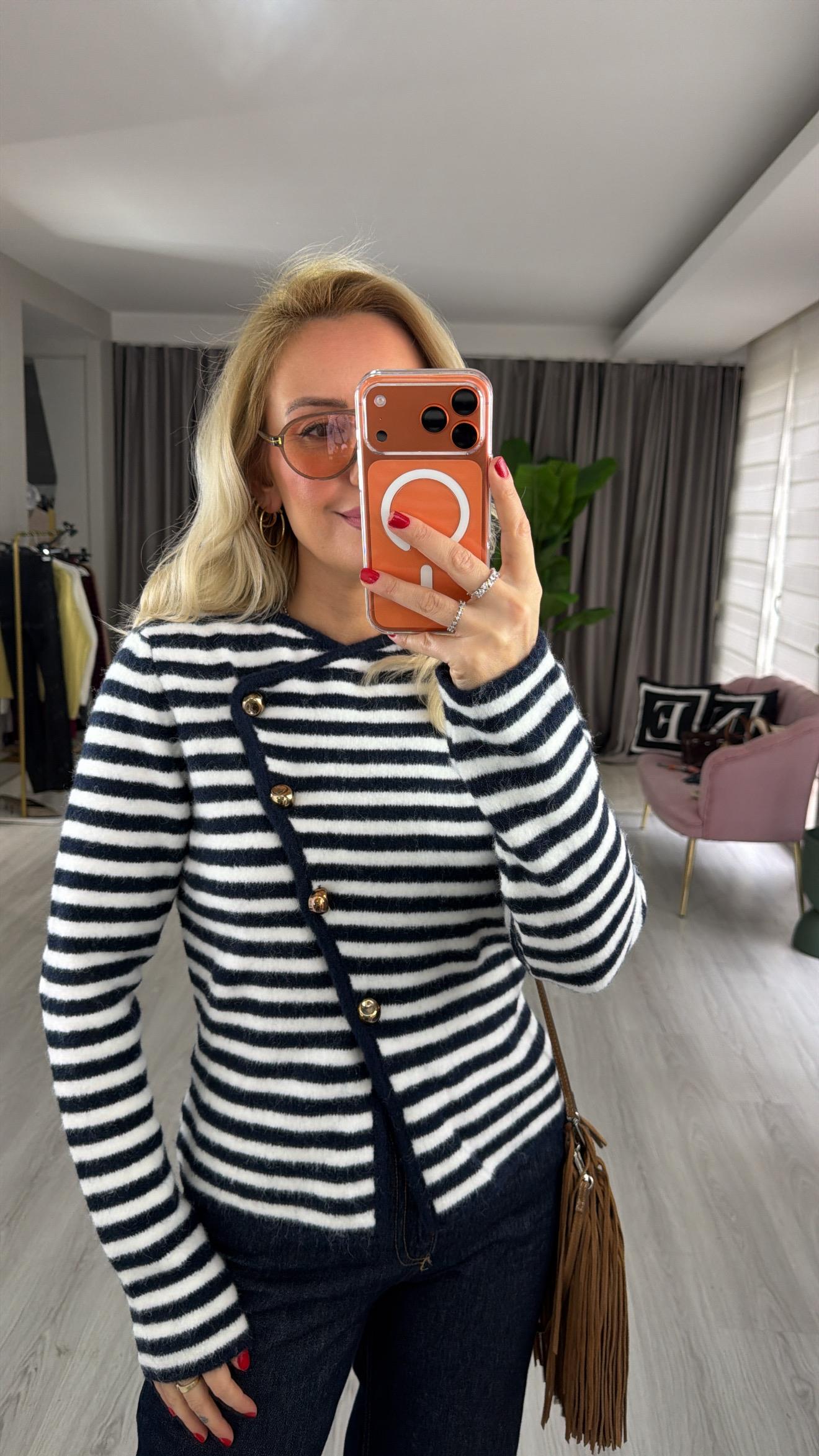 Gold Düğmeli Yaka Detaylı Beyaz Çizgili Lacivert Triko