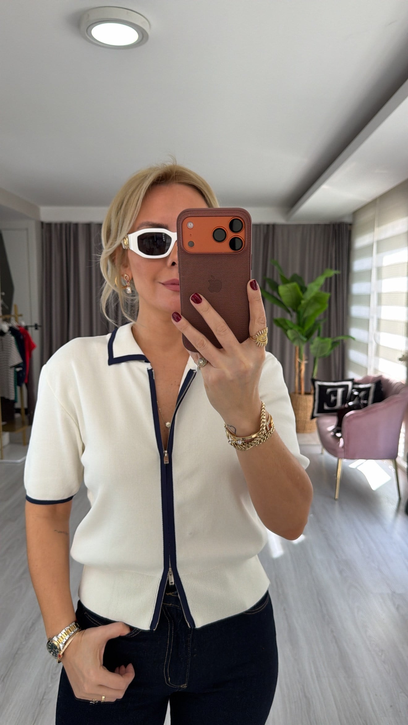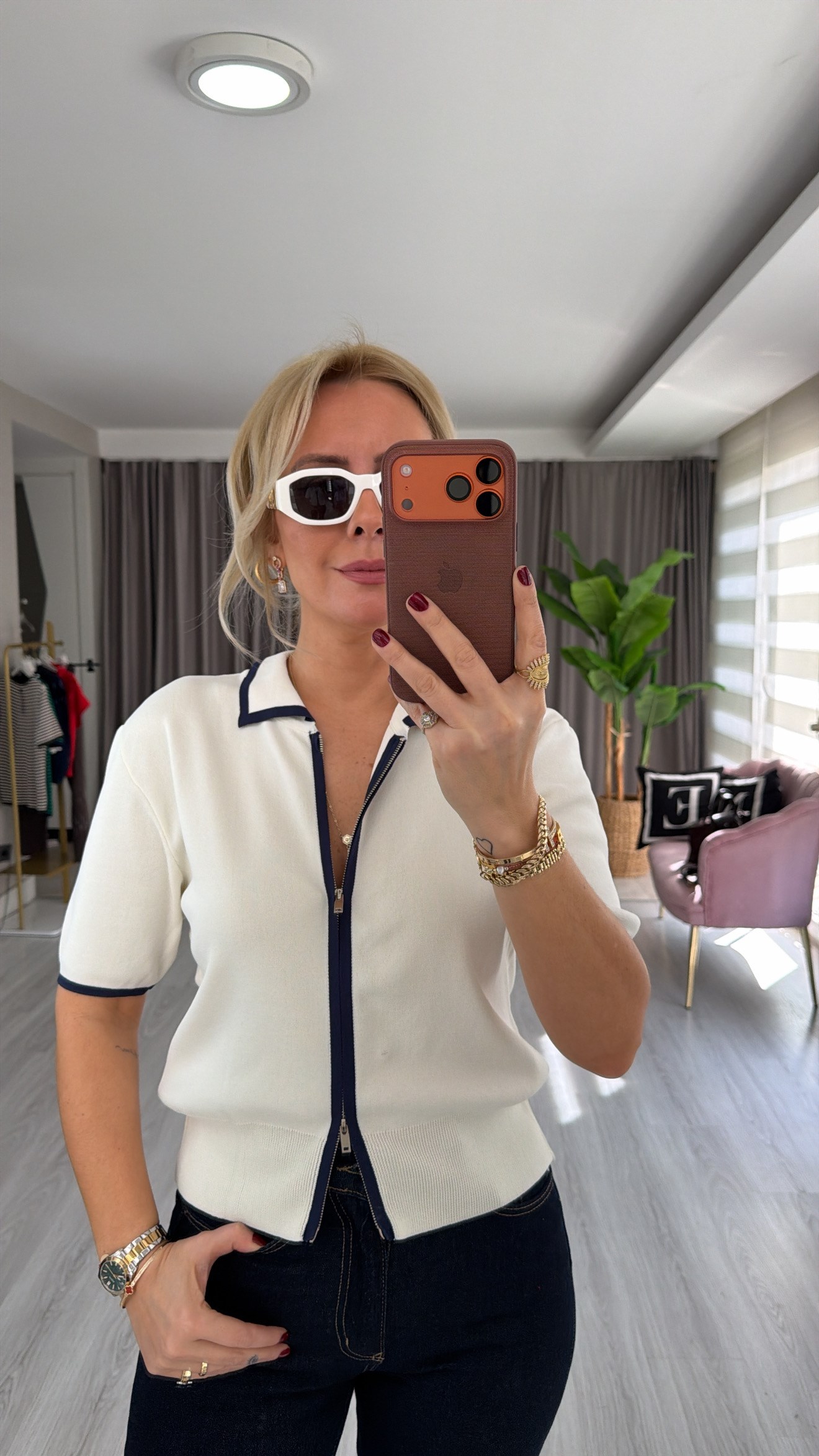 Gömlek Yaka Lacivert Şeritli Ekru Kısa Kol Triko Ceket