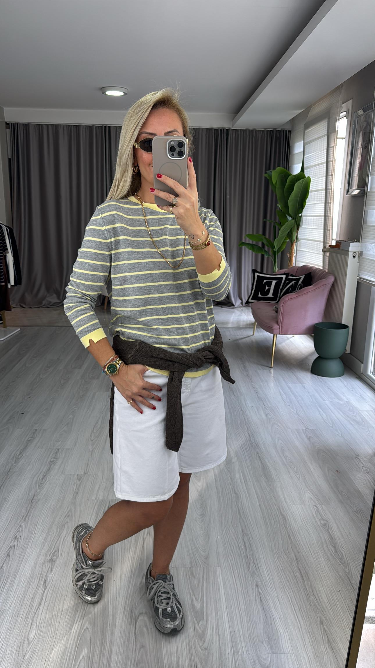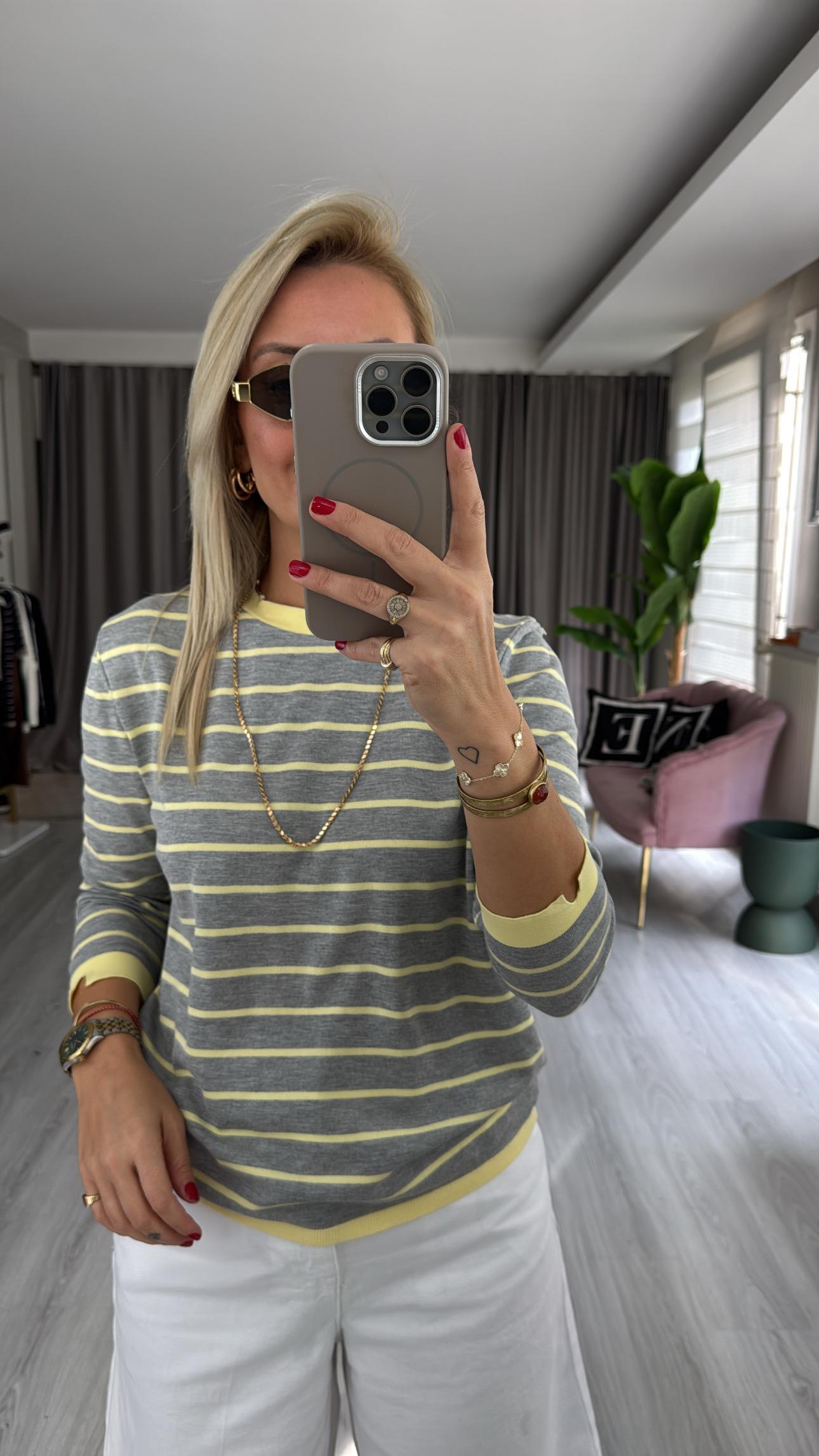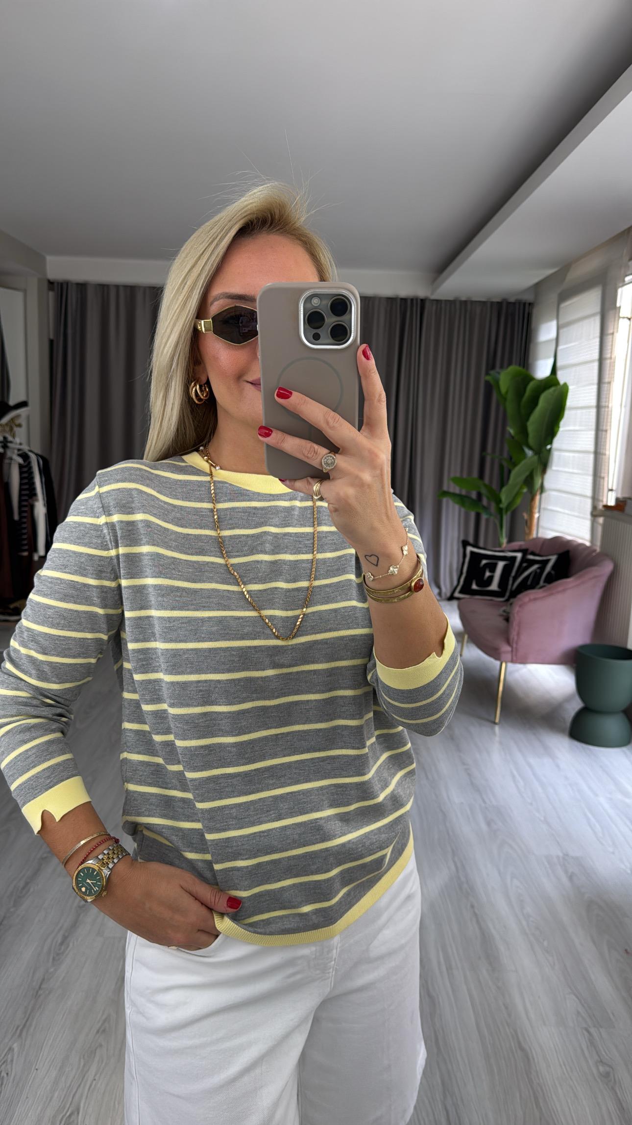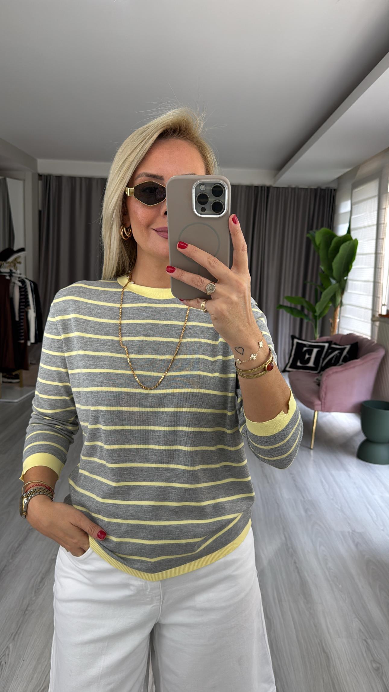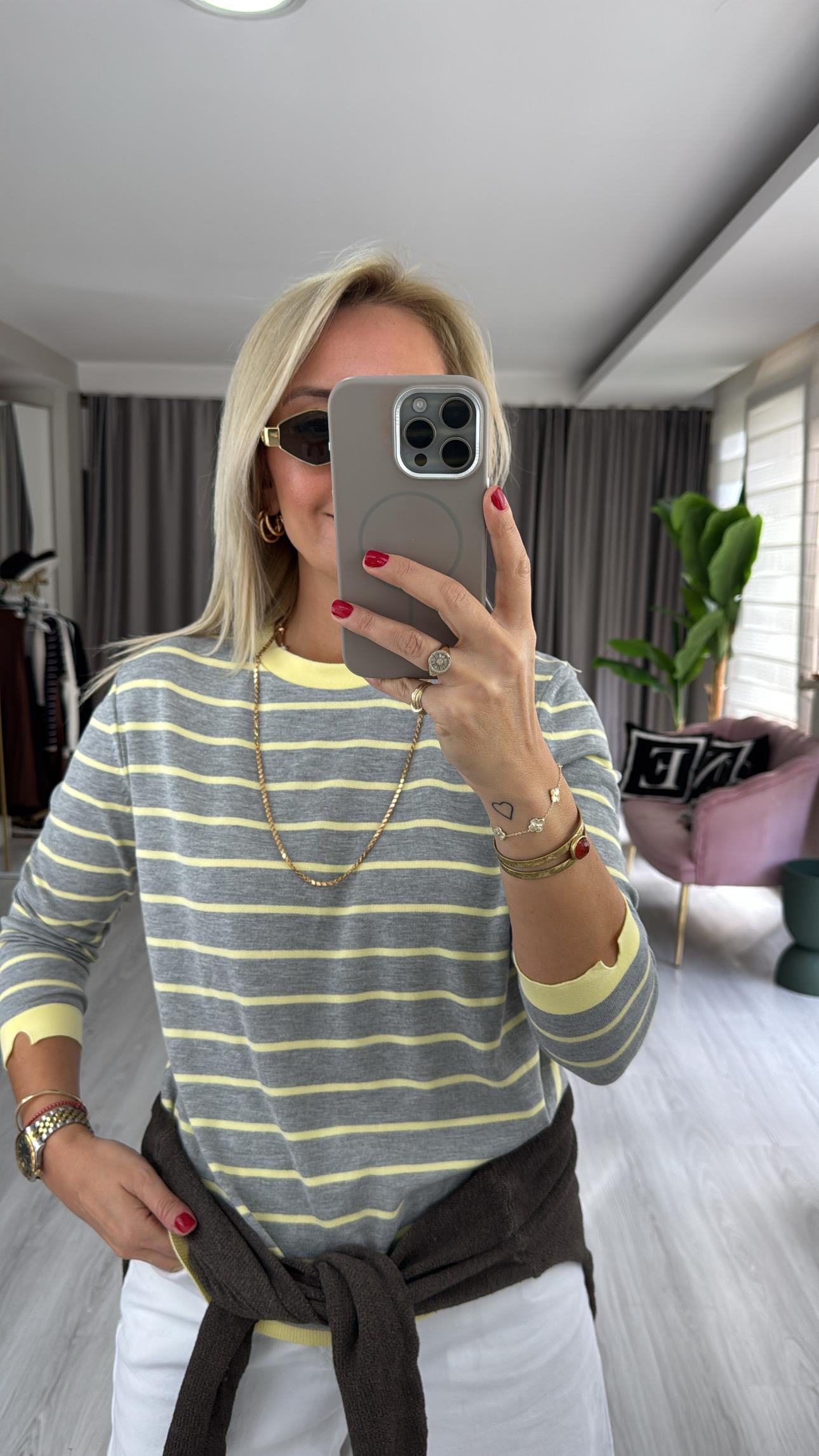 İpek Dokuda Sarı Çizgili Gri Merserize Triko