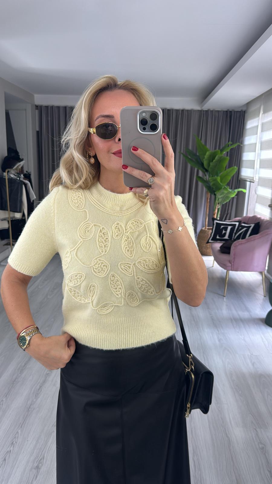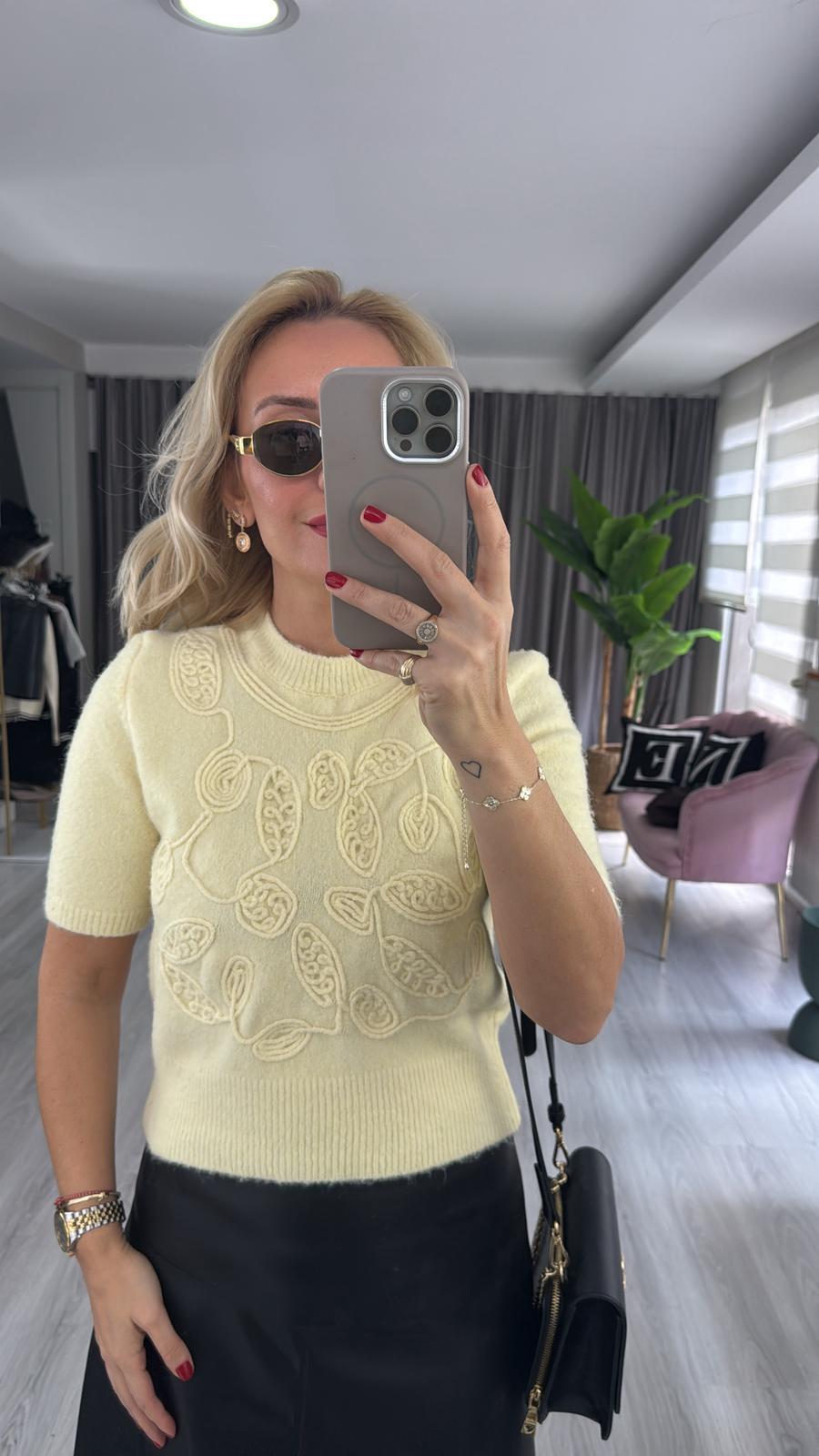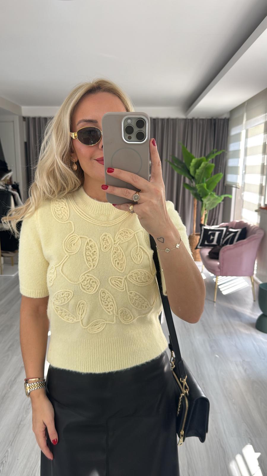 İşlemeli Yarım Kol Sarı Triko