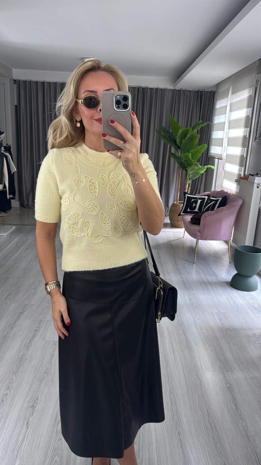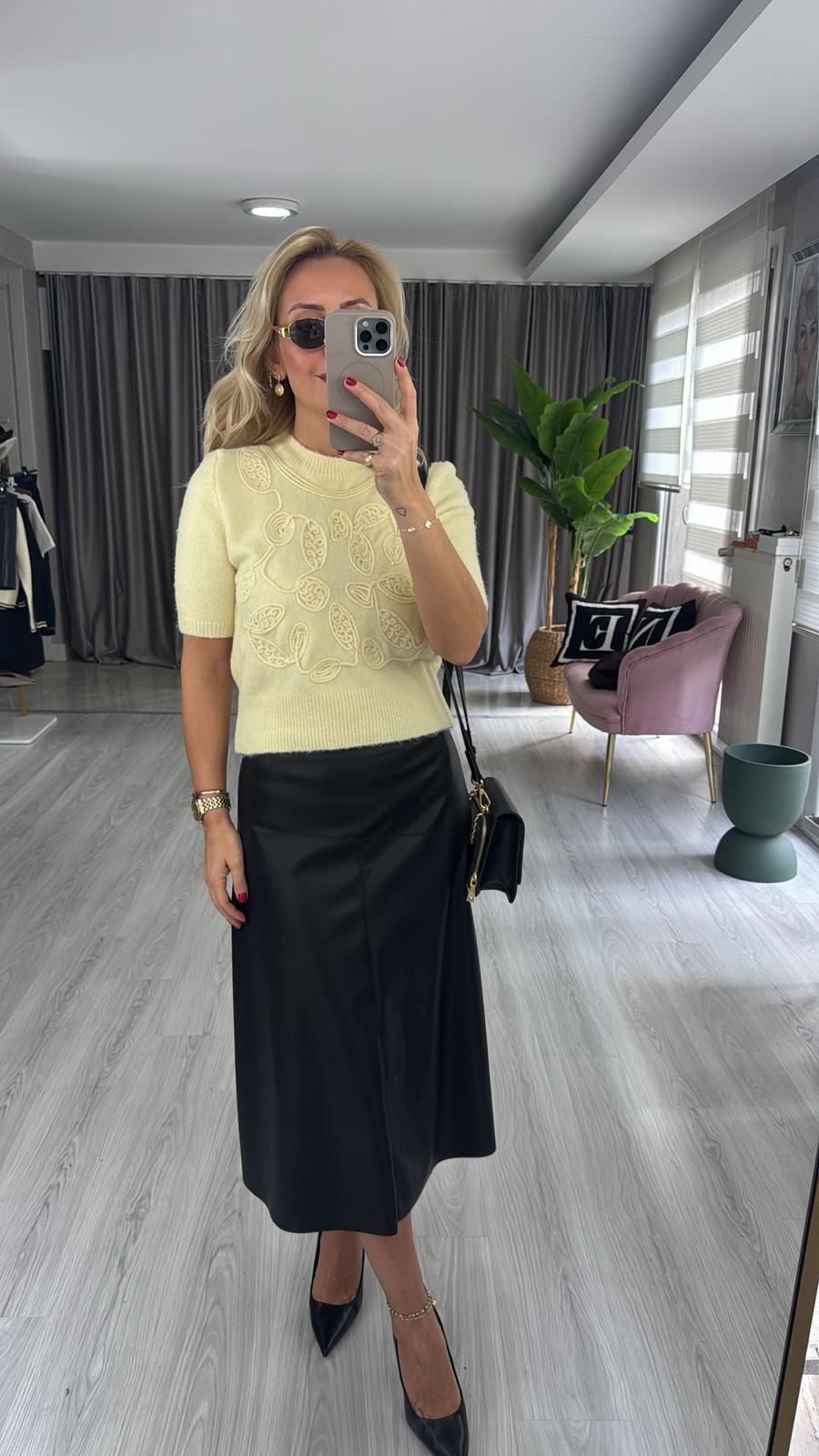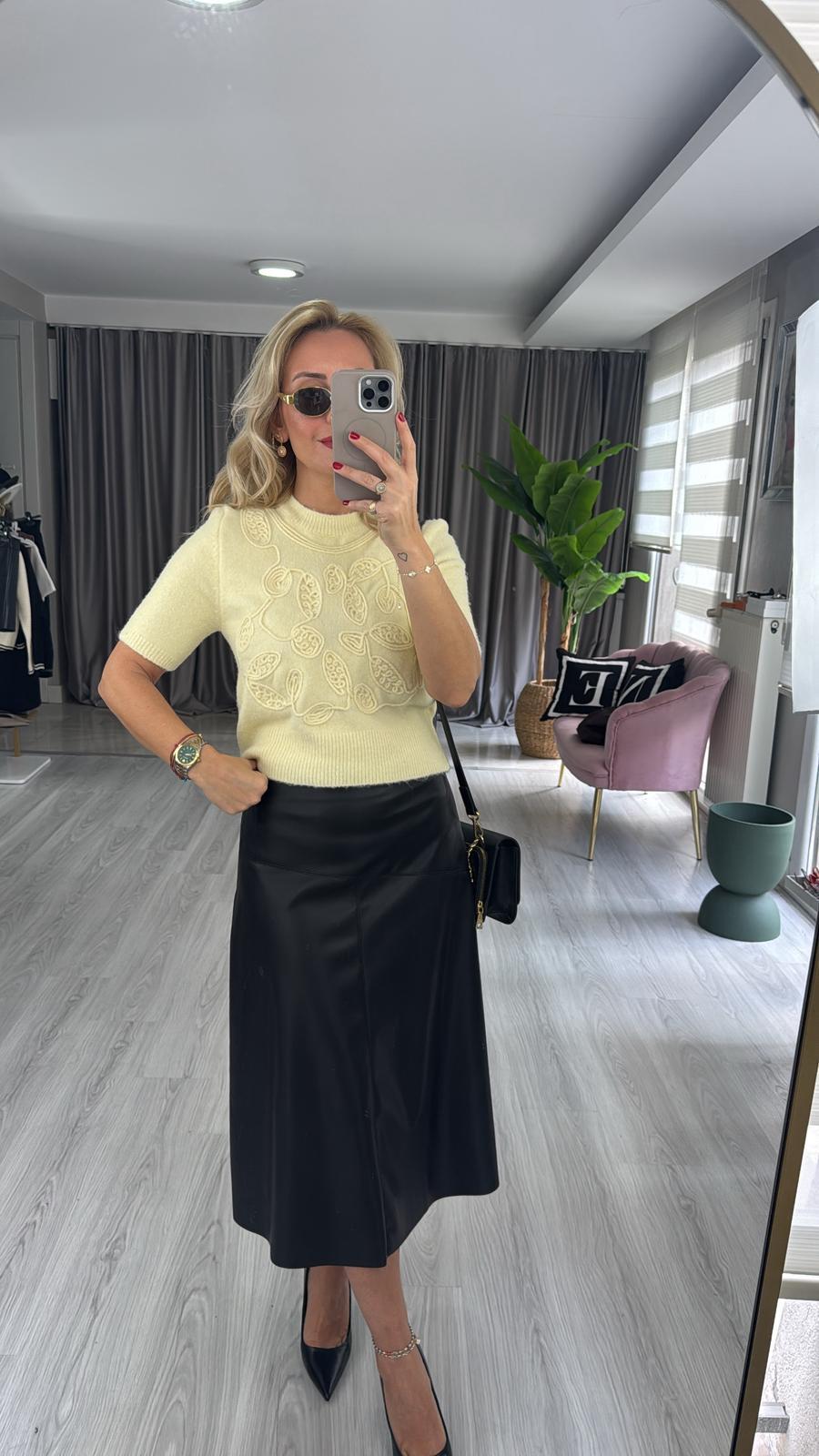 İşlemeli Yarım Kol Sarı Triko