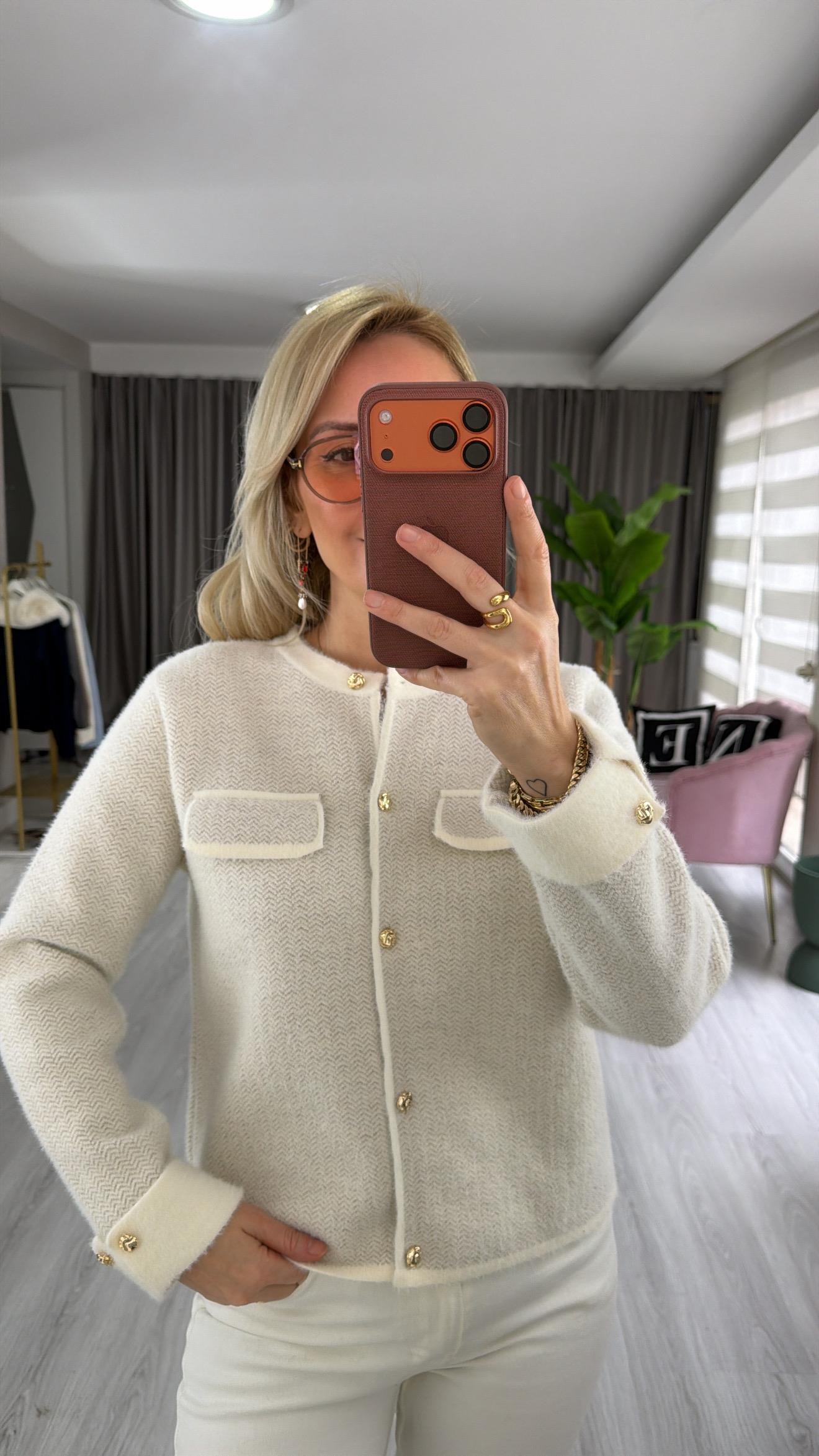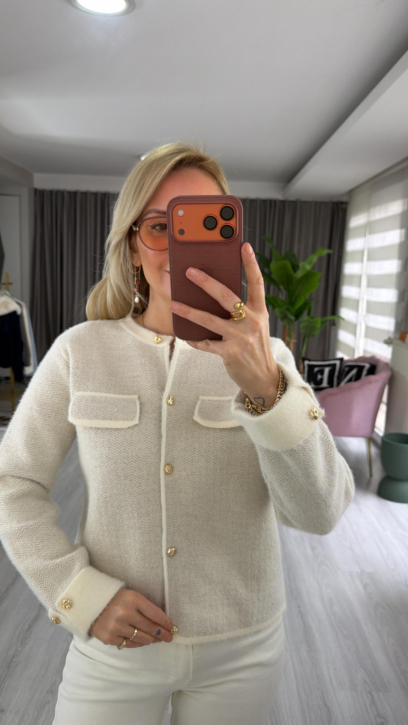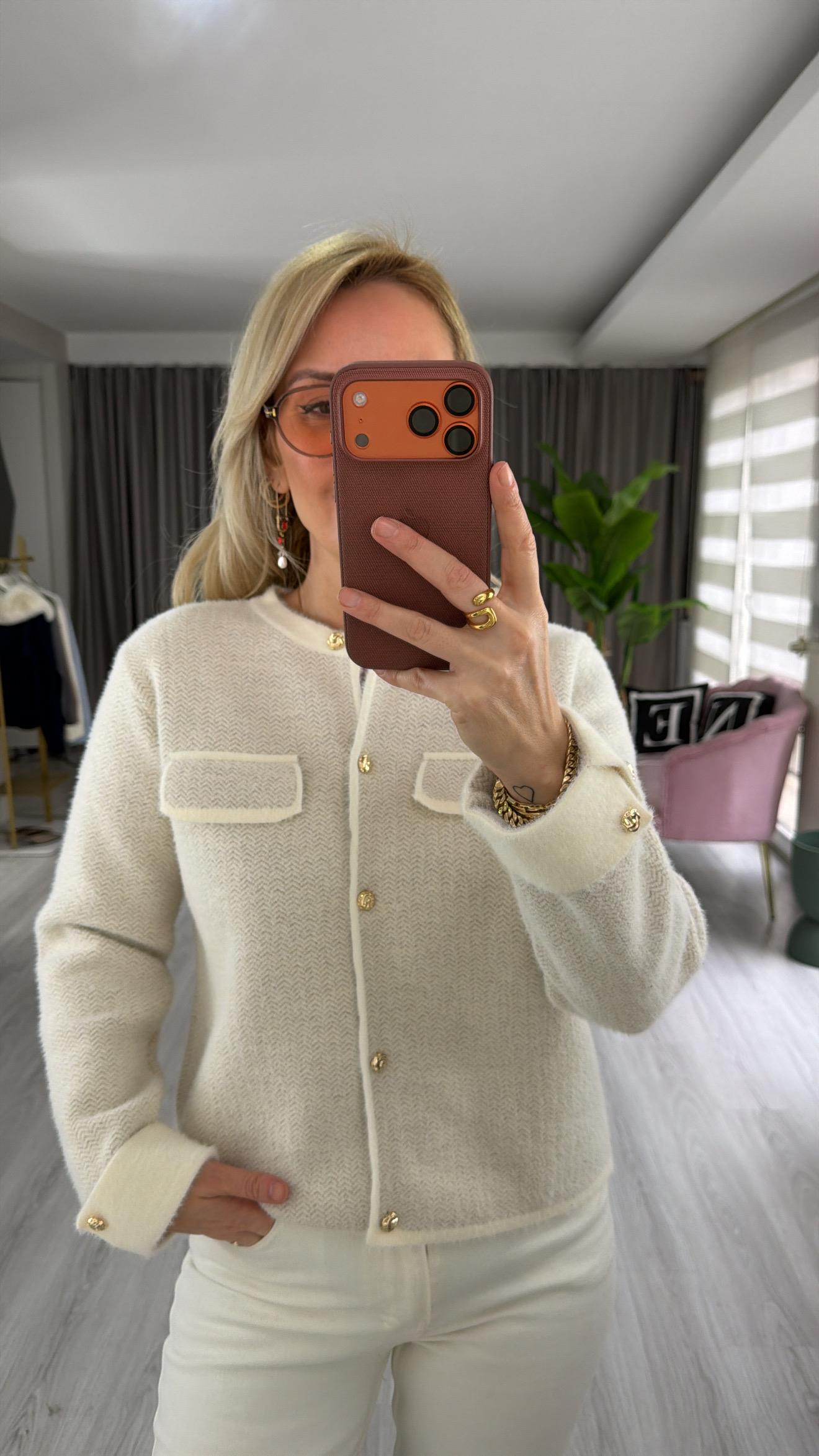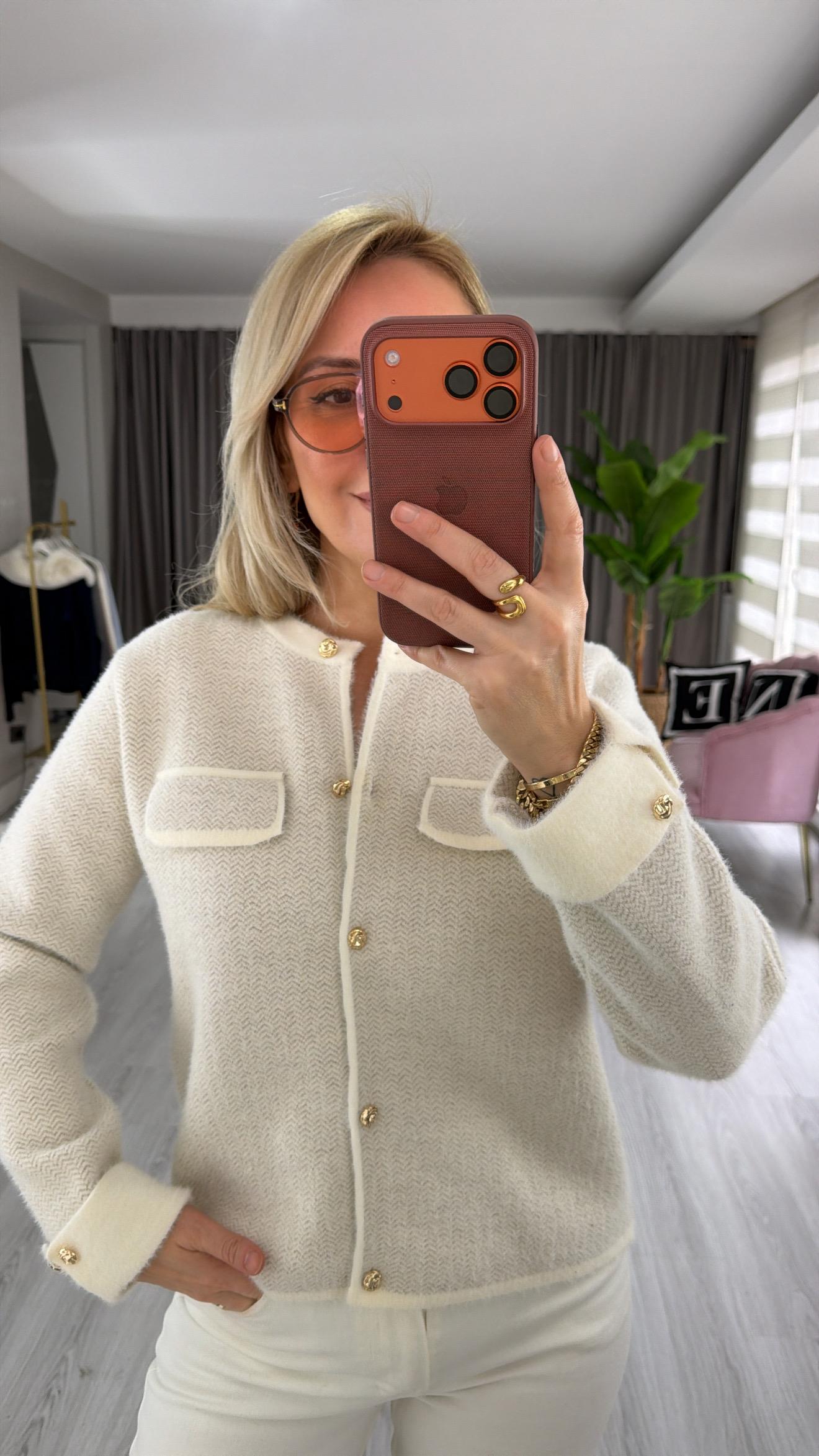 Kapak Cepli Sakallı Ekru Premium Triko Ceket