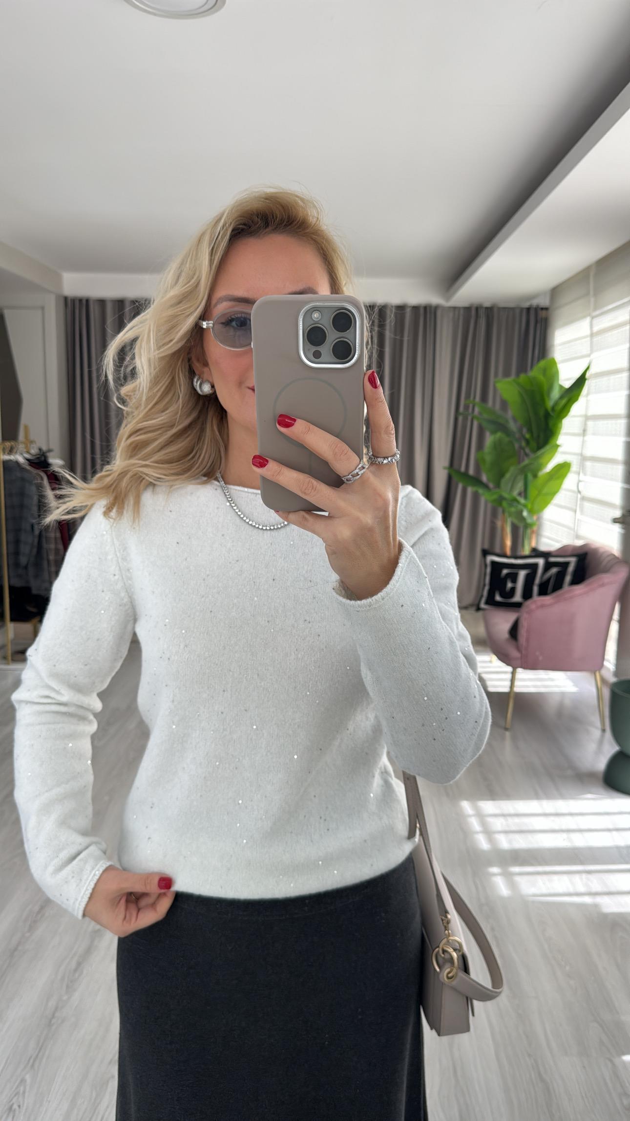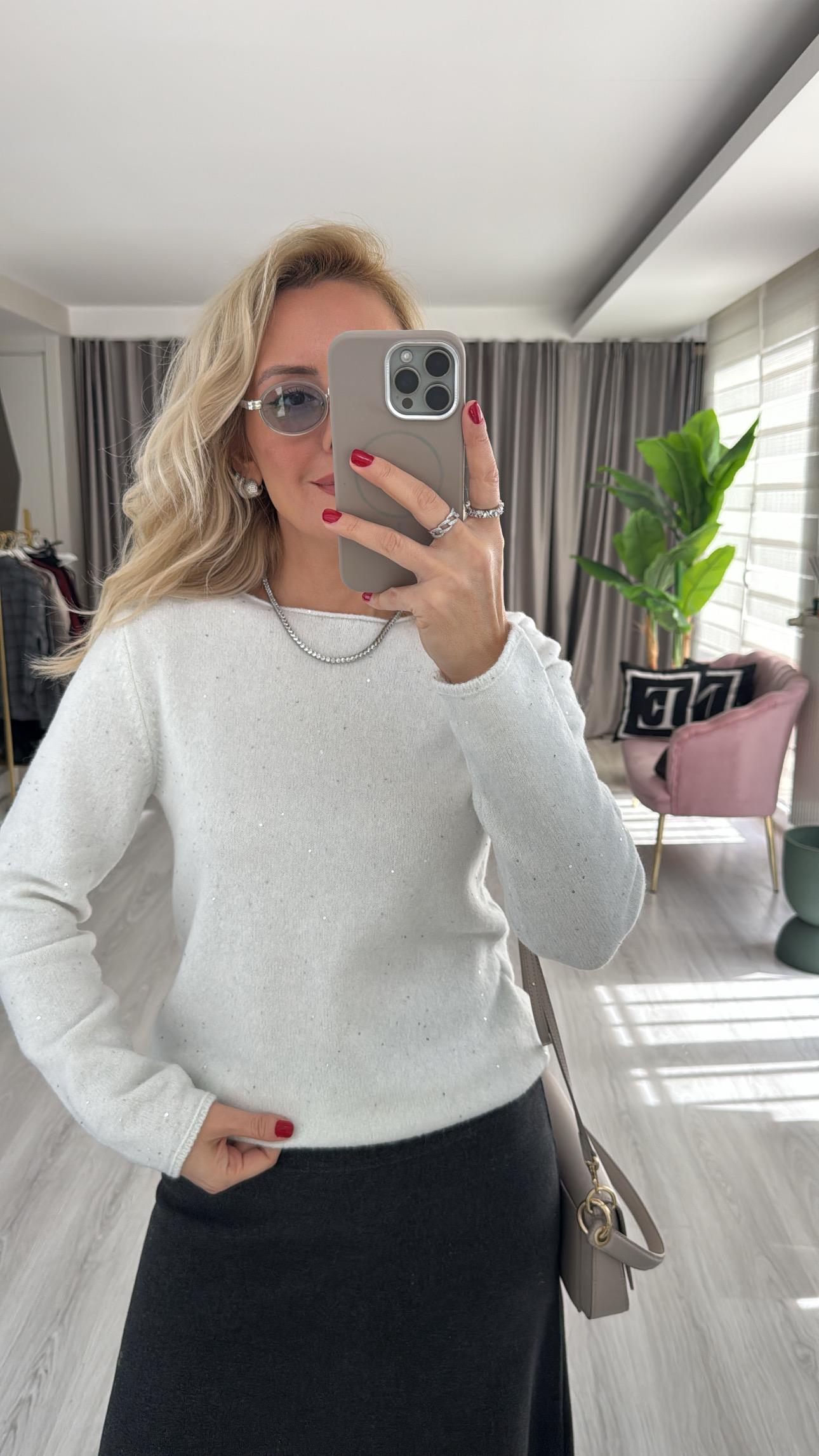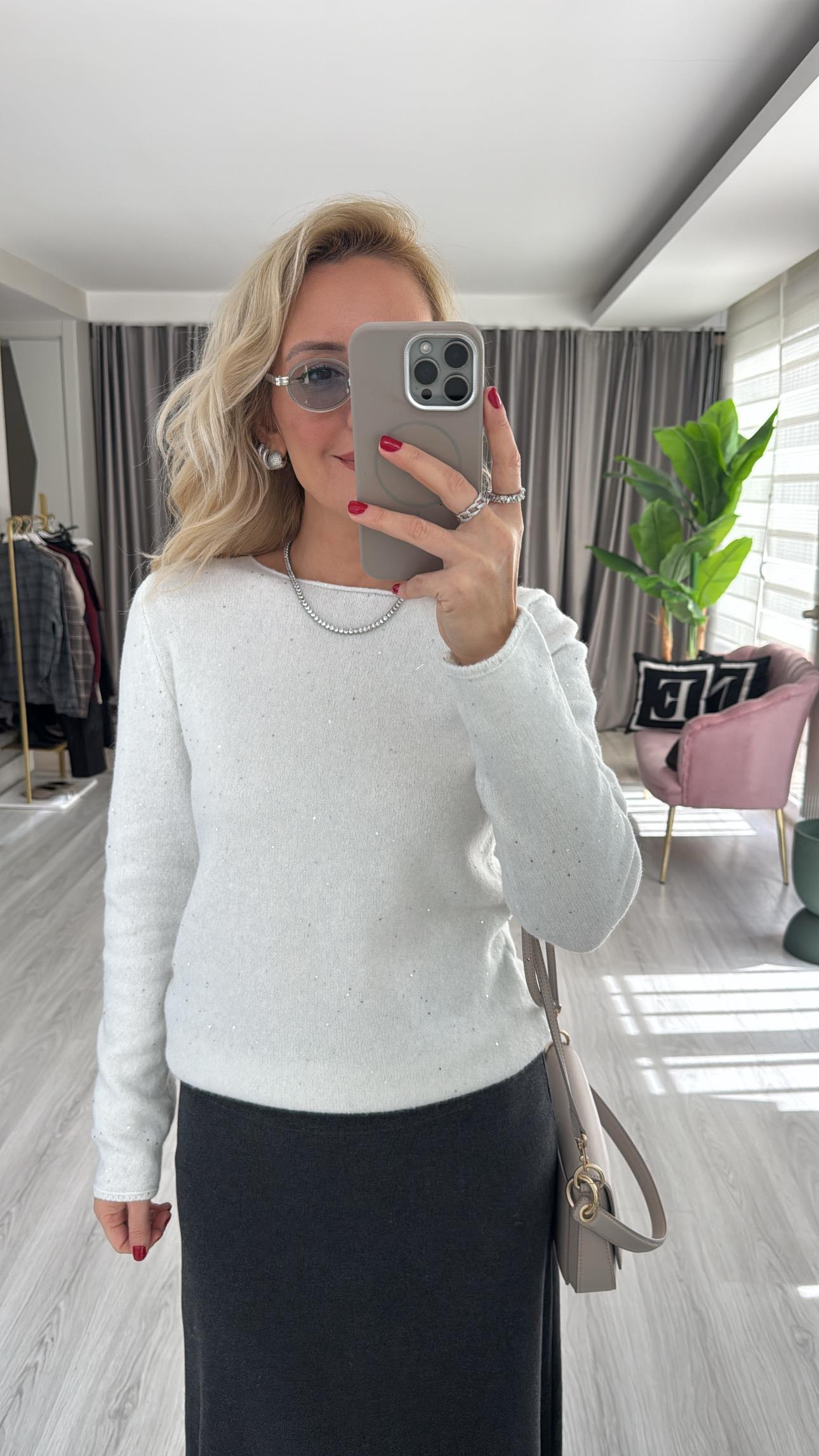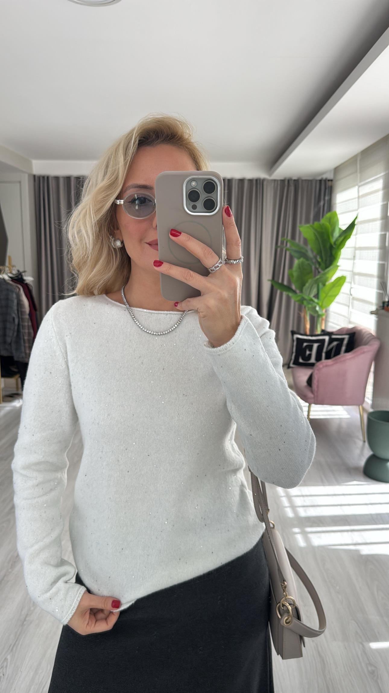 Dilvin Kayık Yaka Pullu Simli Ekru Triko