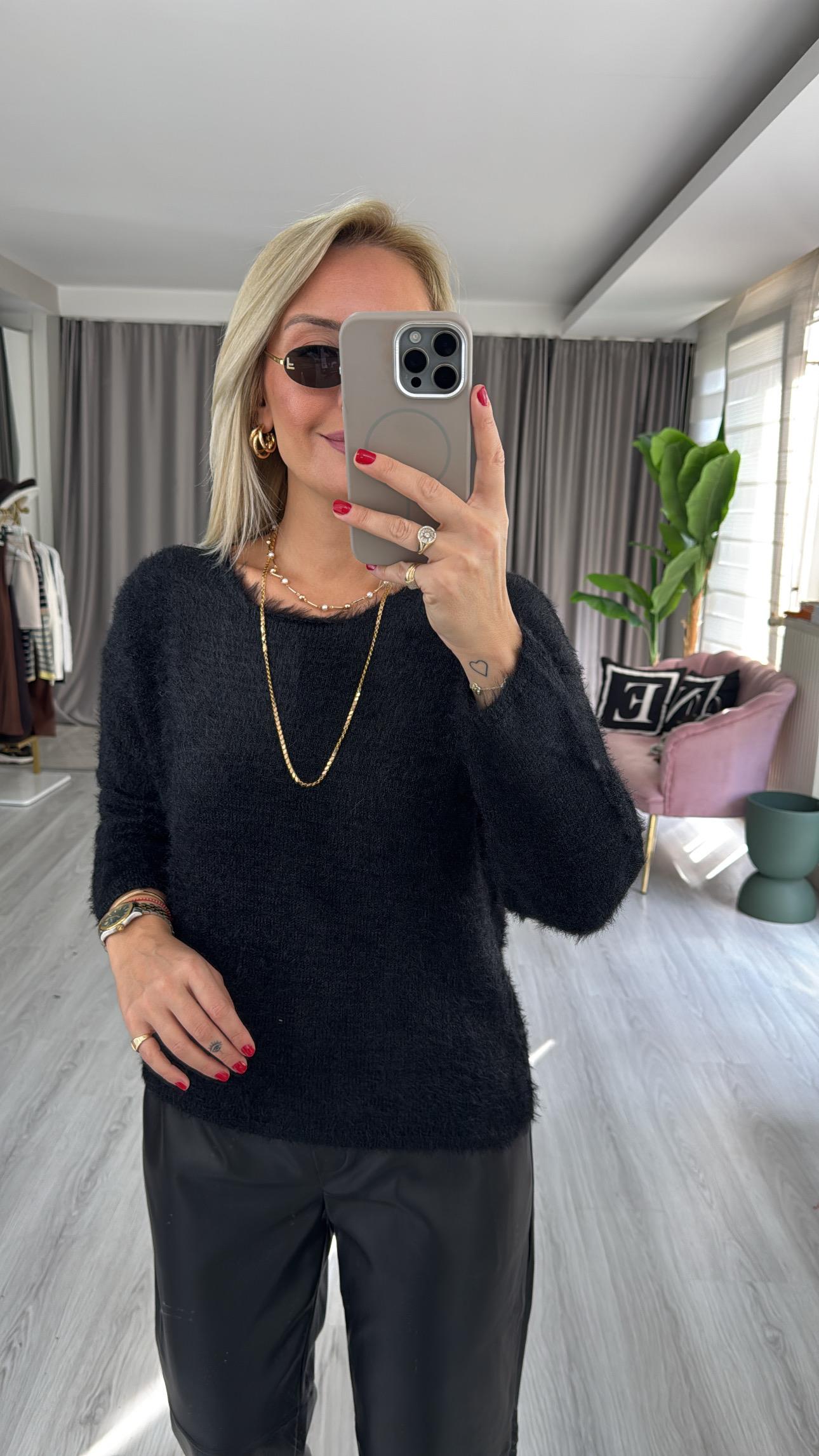 Kayık Yaka Yumuşak Dokulu Siyah Triko