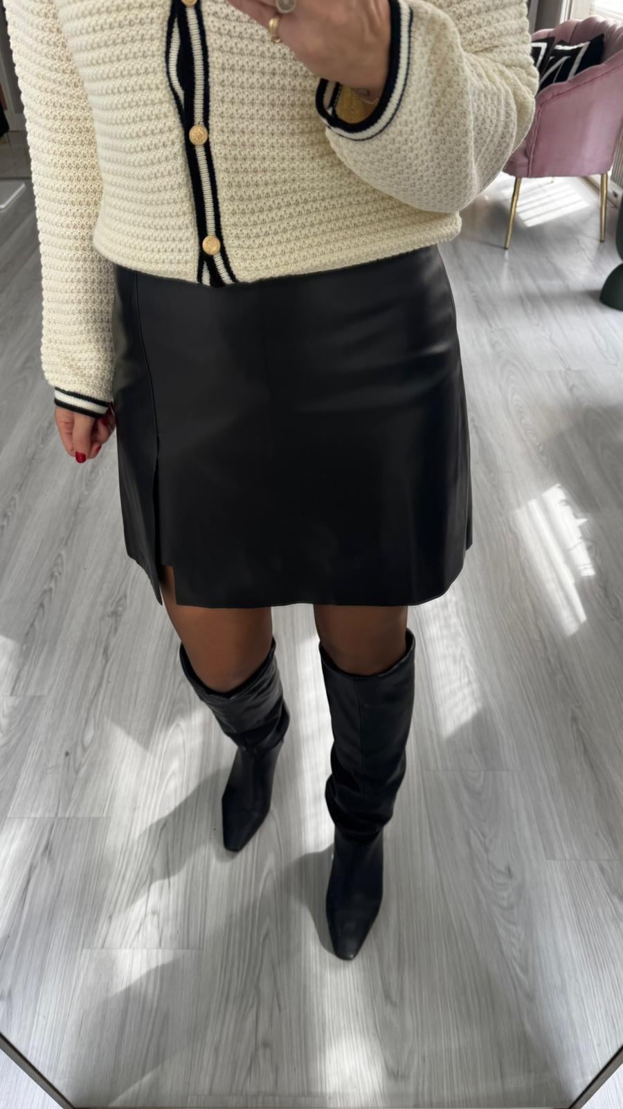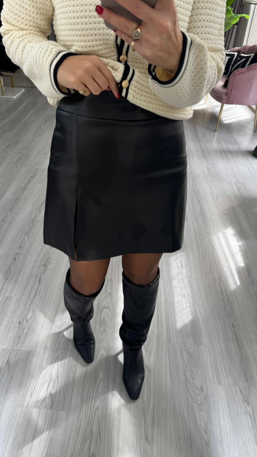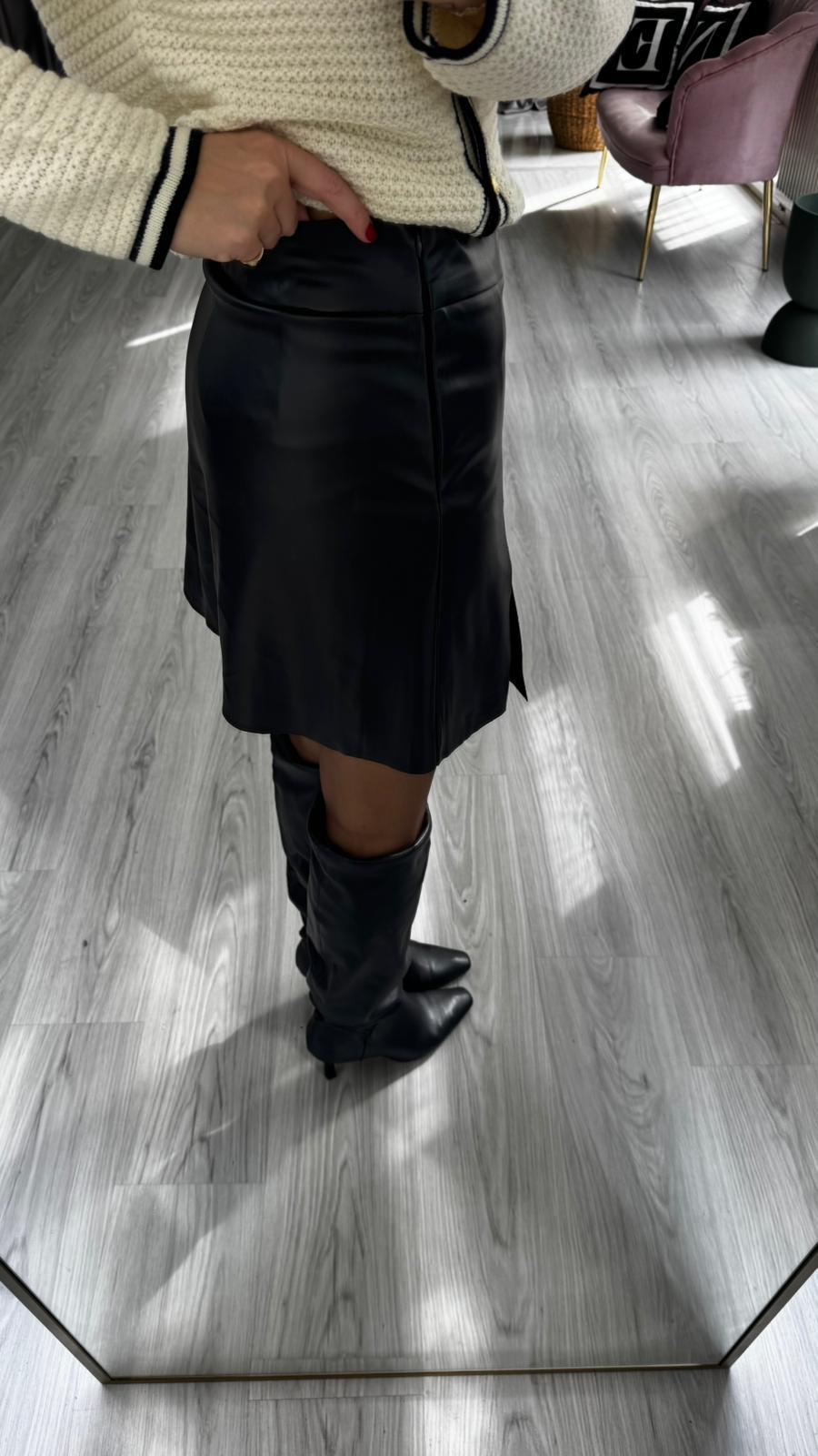 Minik Yırtmaçlı Siyah Deri Şort Etek