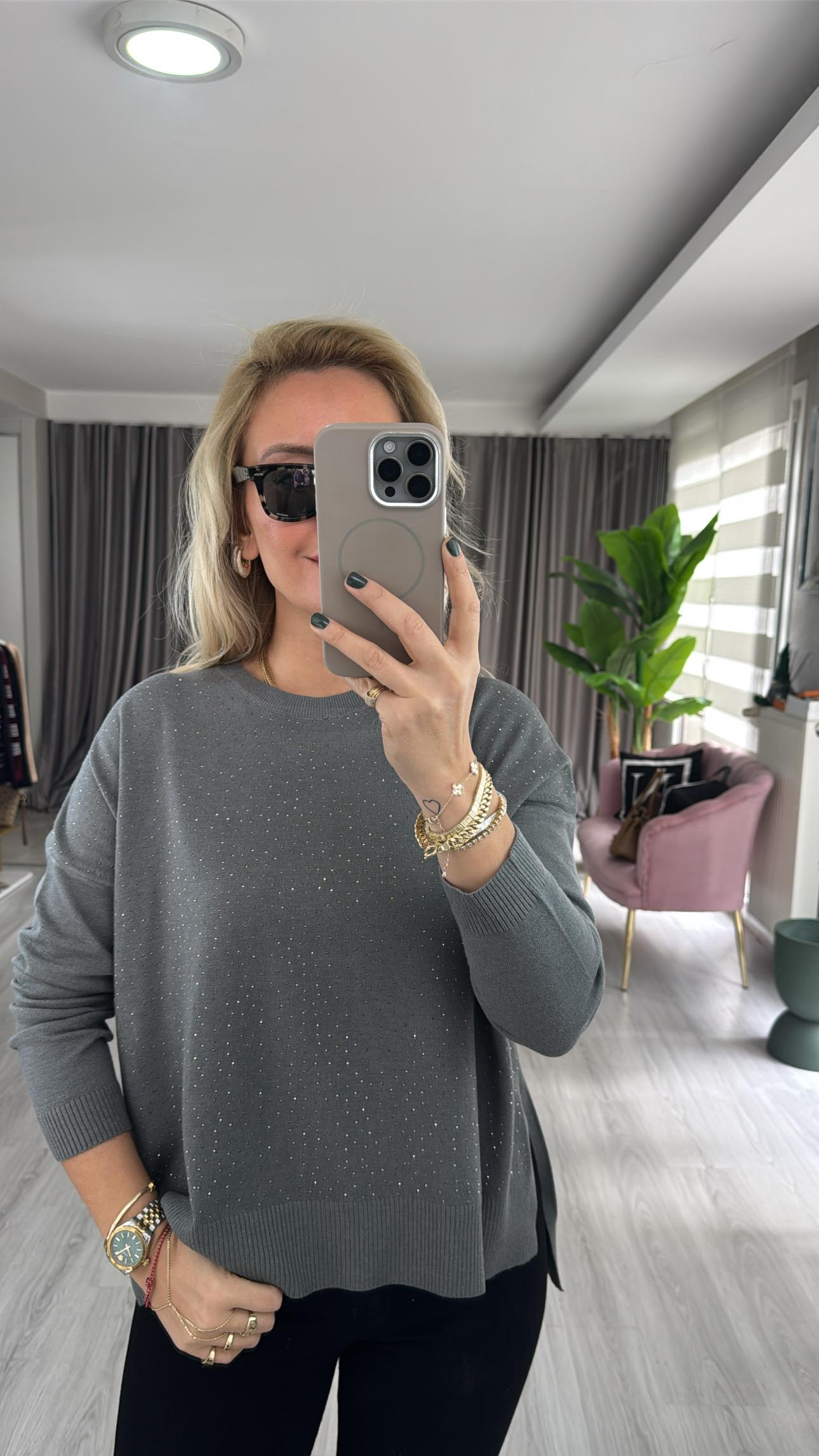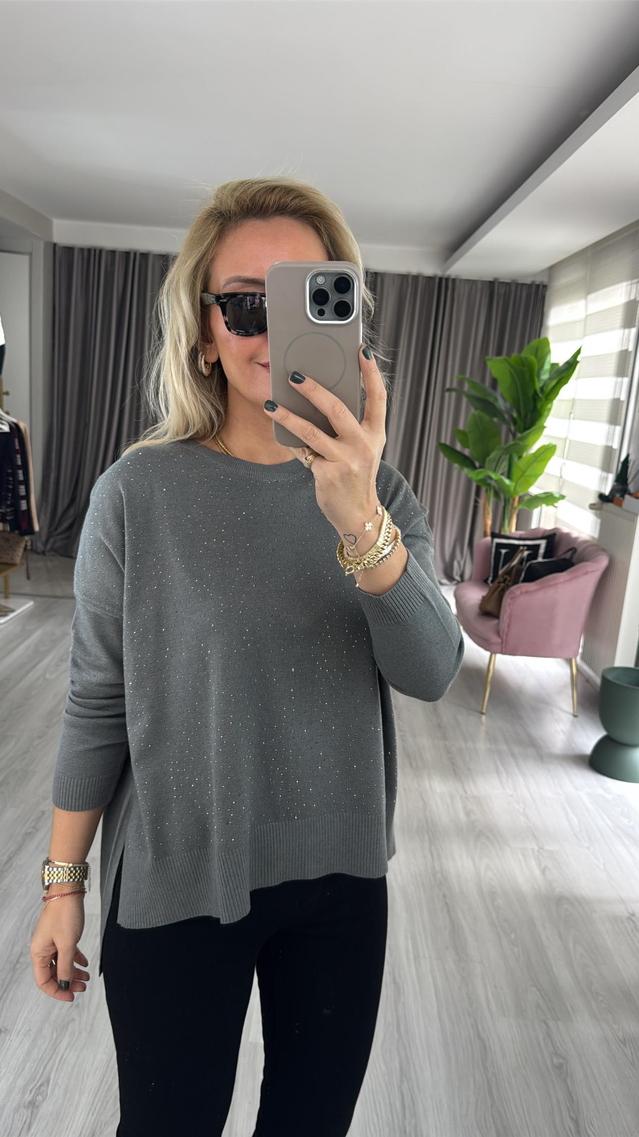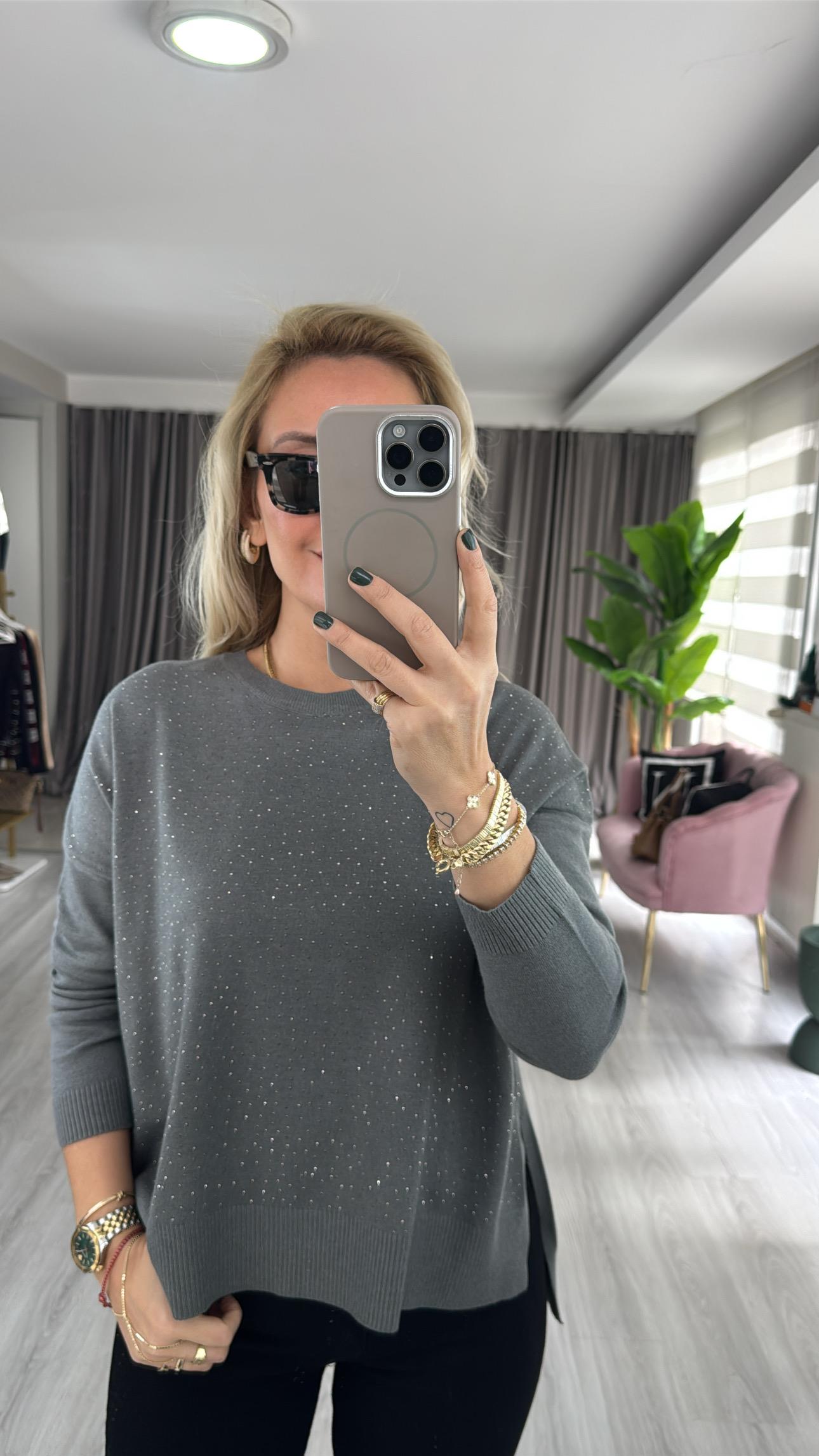 Önü Komple Taşlı İpek Dokuda Gri Triko