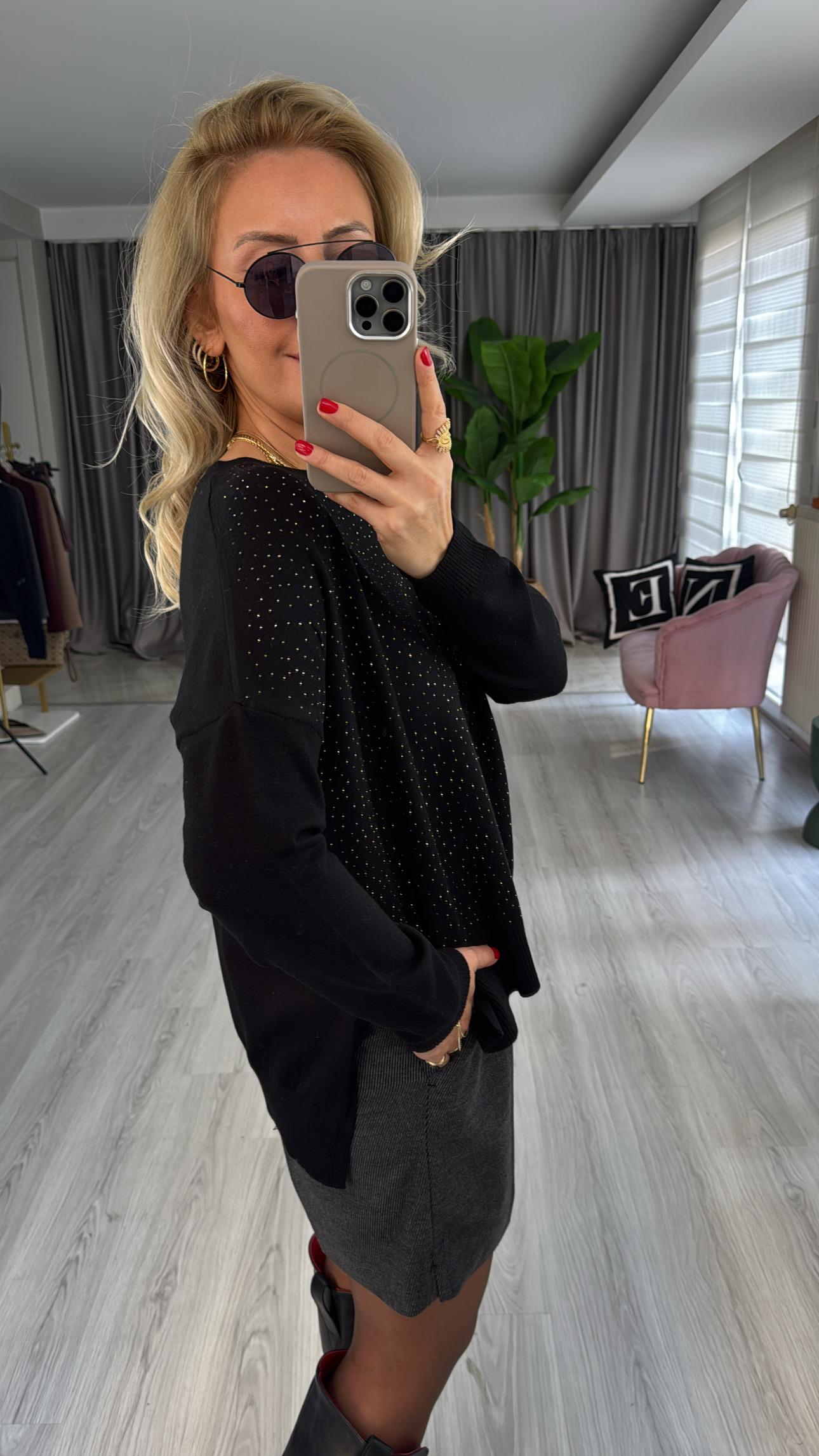 Önü Komple Taşlı İpek Dokuda Siyah Triko