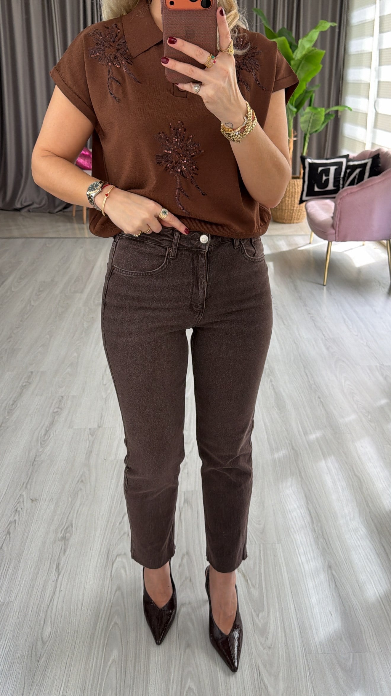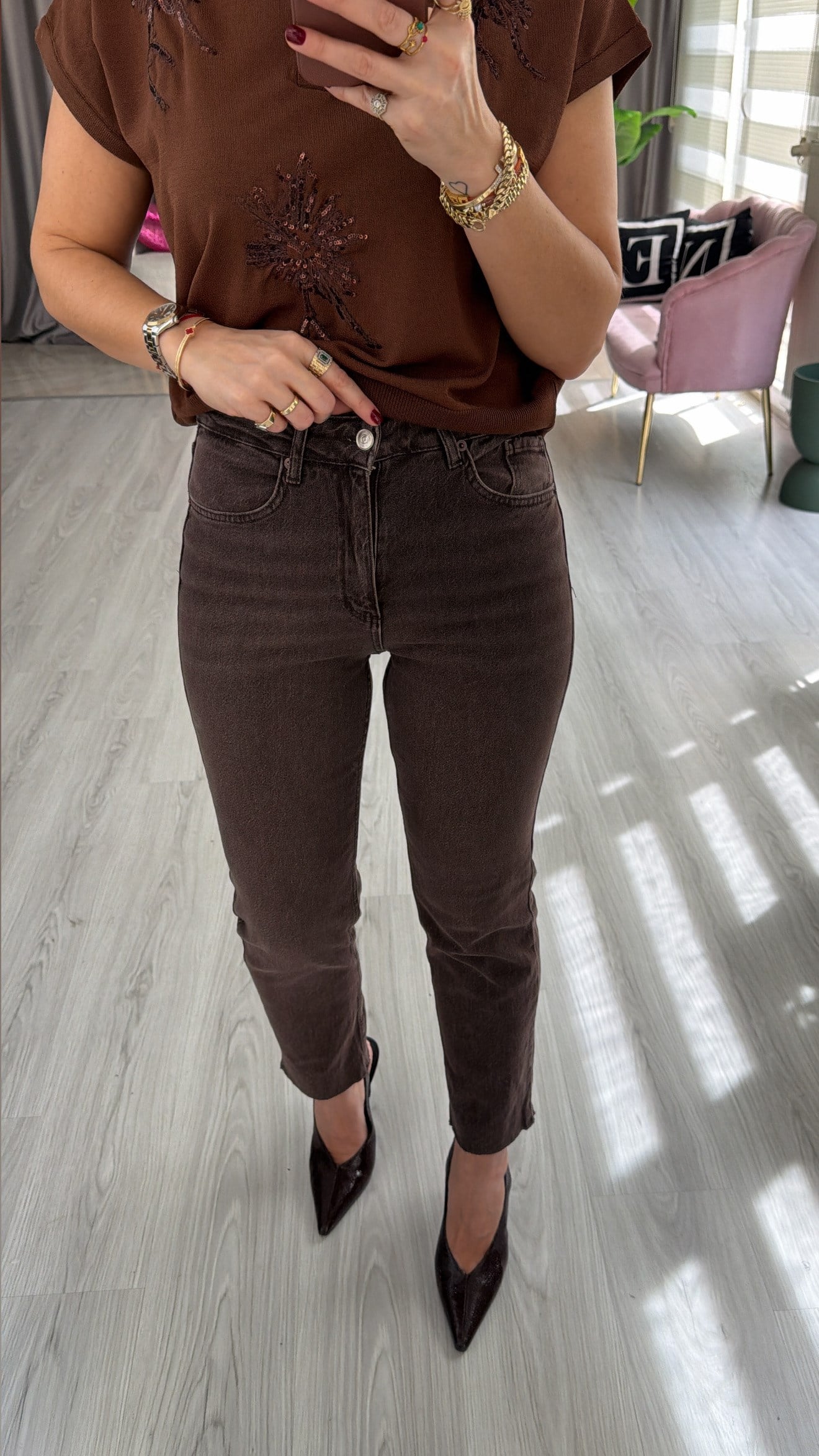 Orjinal Marka Likralı Acı Kahve Yıkamalı Kesik Paça Jean
