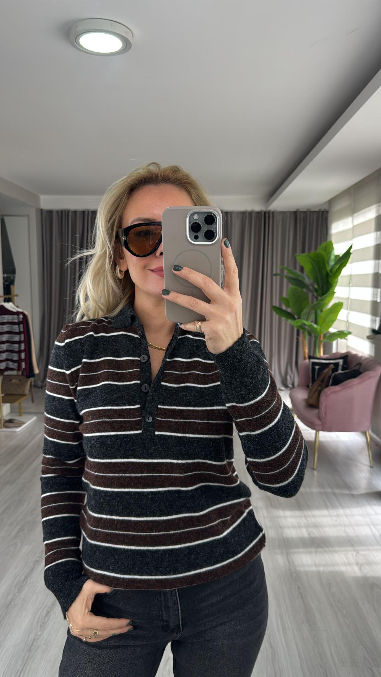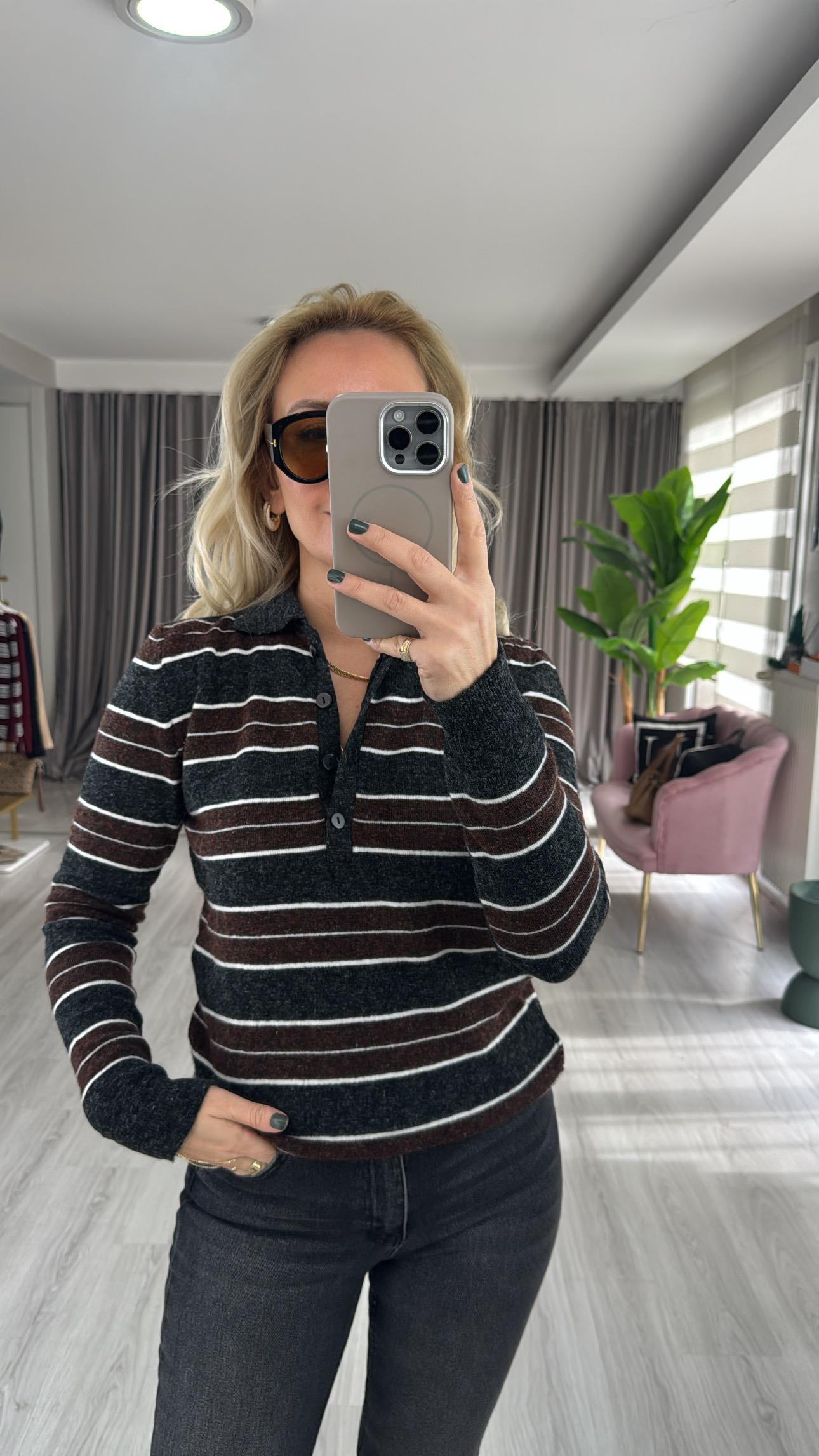 Polo Yaka Bordo Antrasit Çizgili Triko