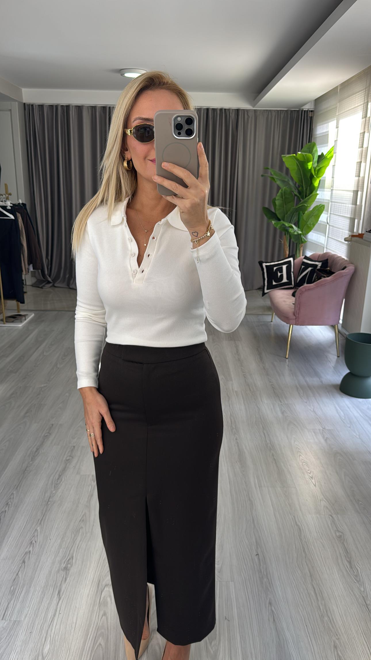 Polo Yaka Fitilli Kaşkorse Siyah Bluz