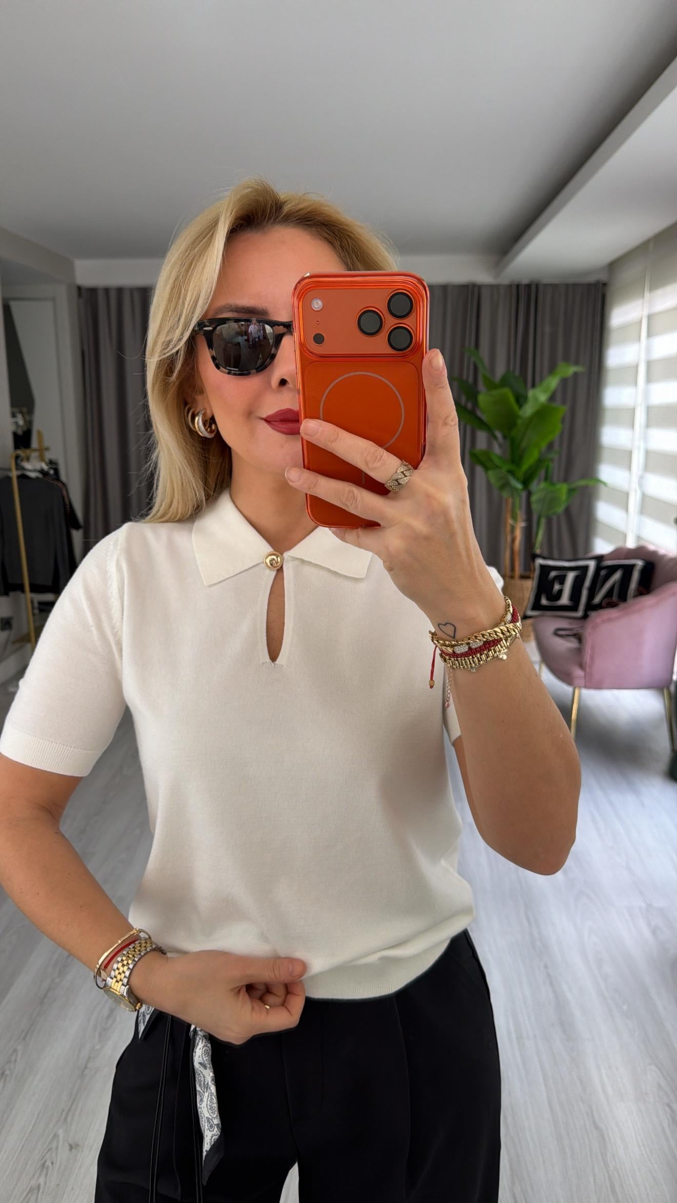 Polo Yaka Gold Düğme Detaylı İpek Dokuda Ekru Triko