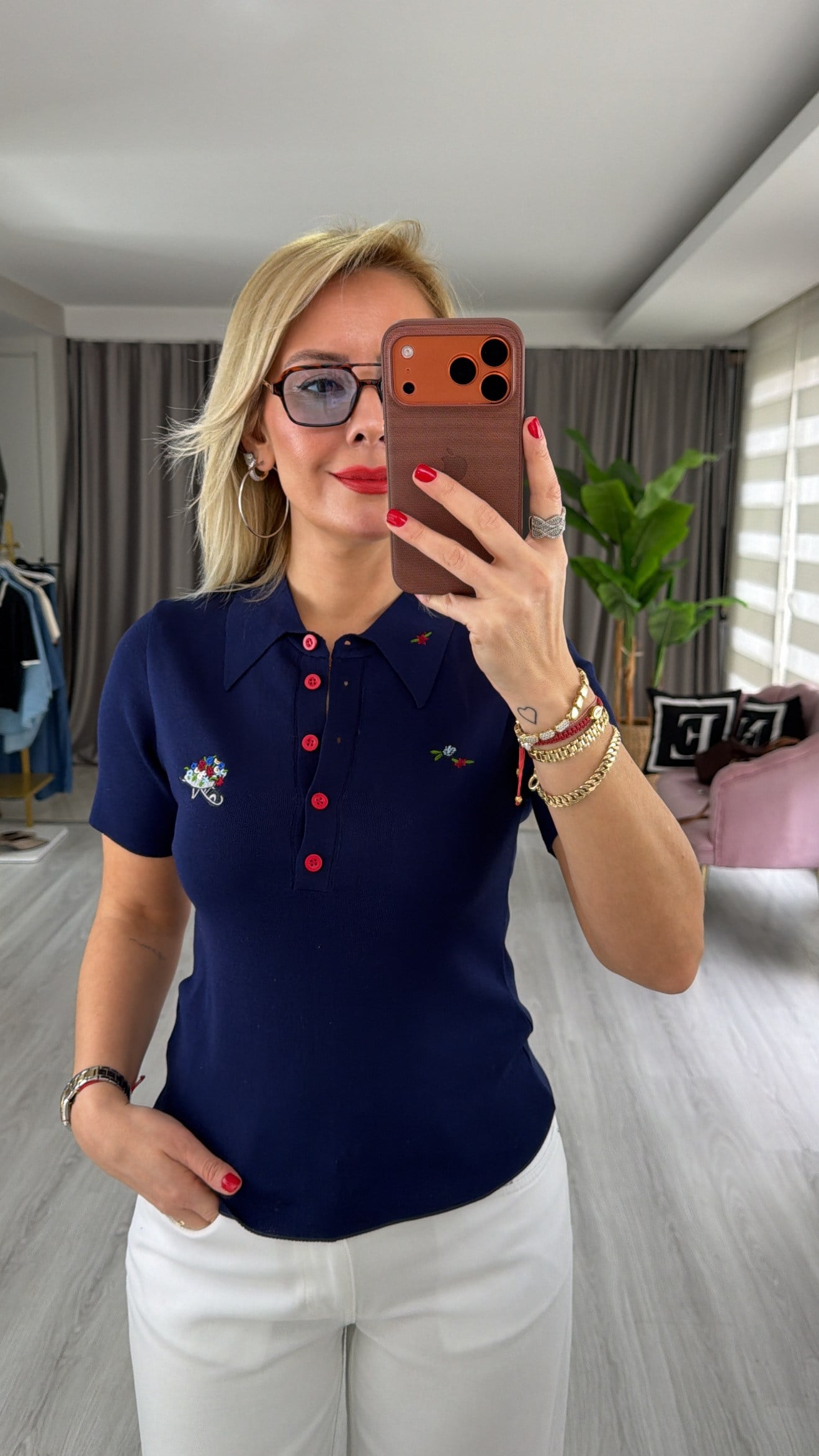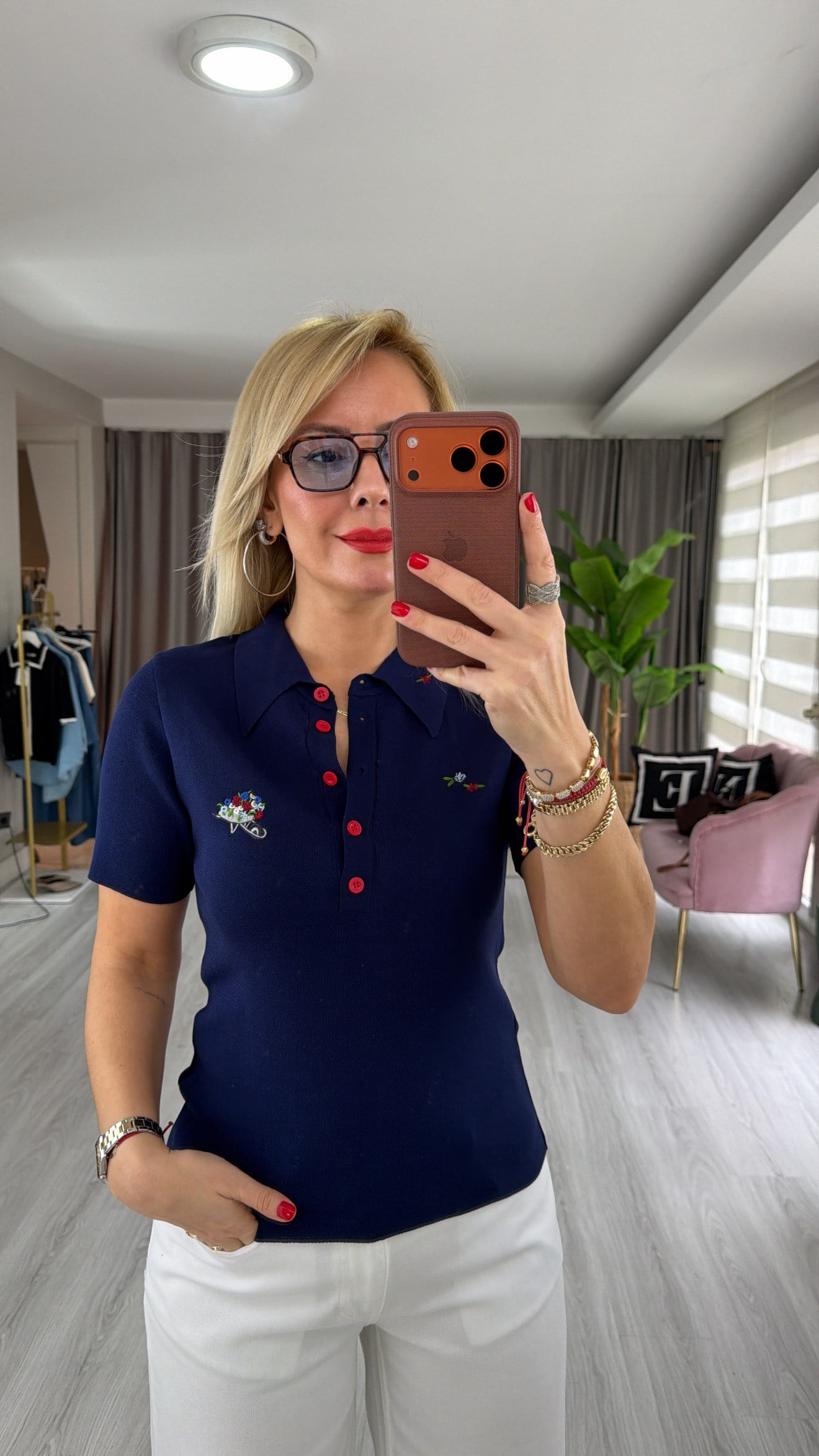 Polo Yaka Nakış İşlemeli Lacivert Premium Triko