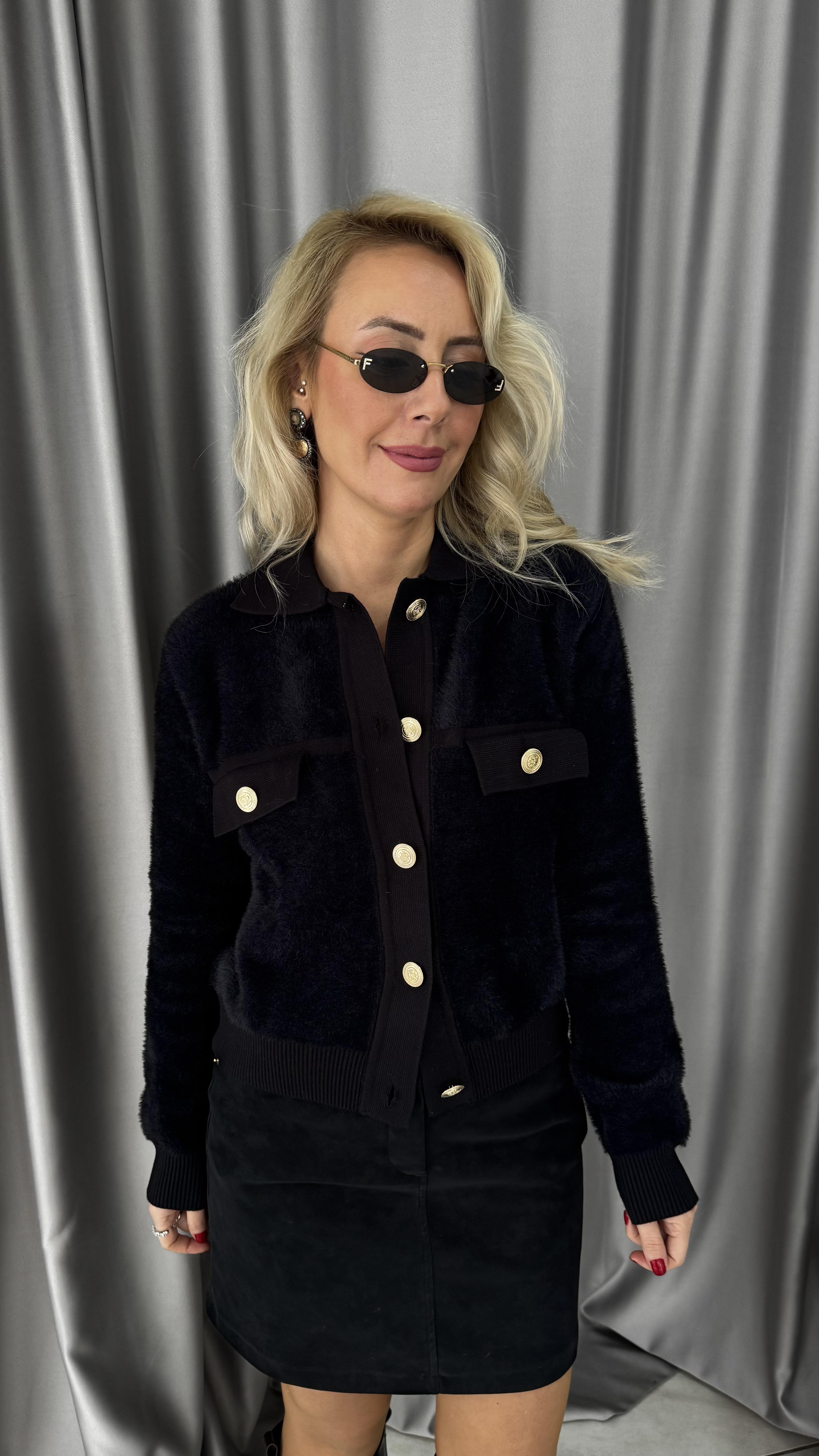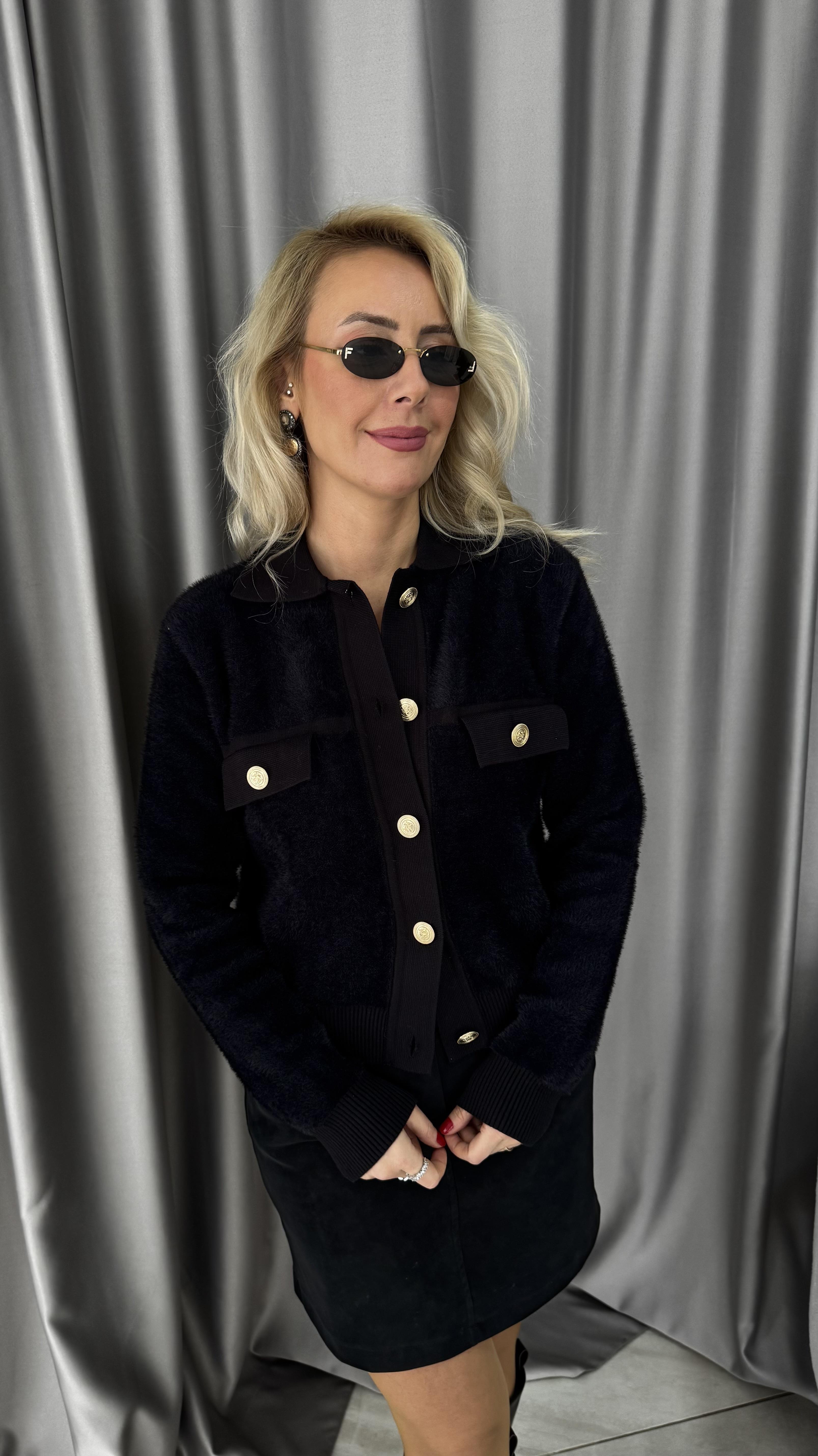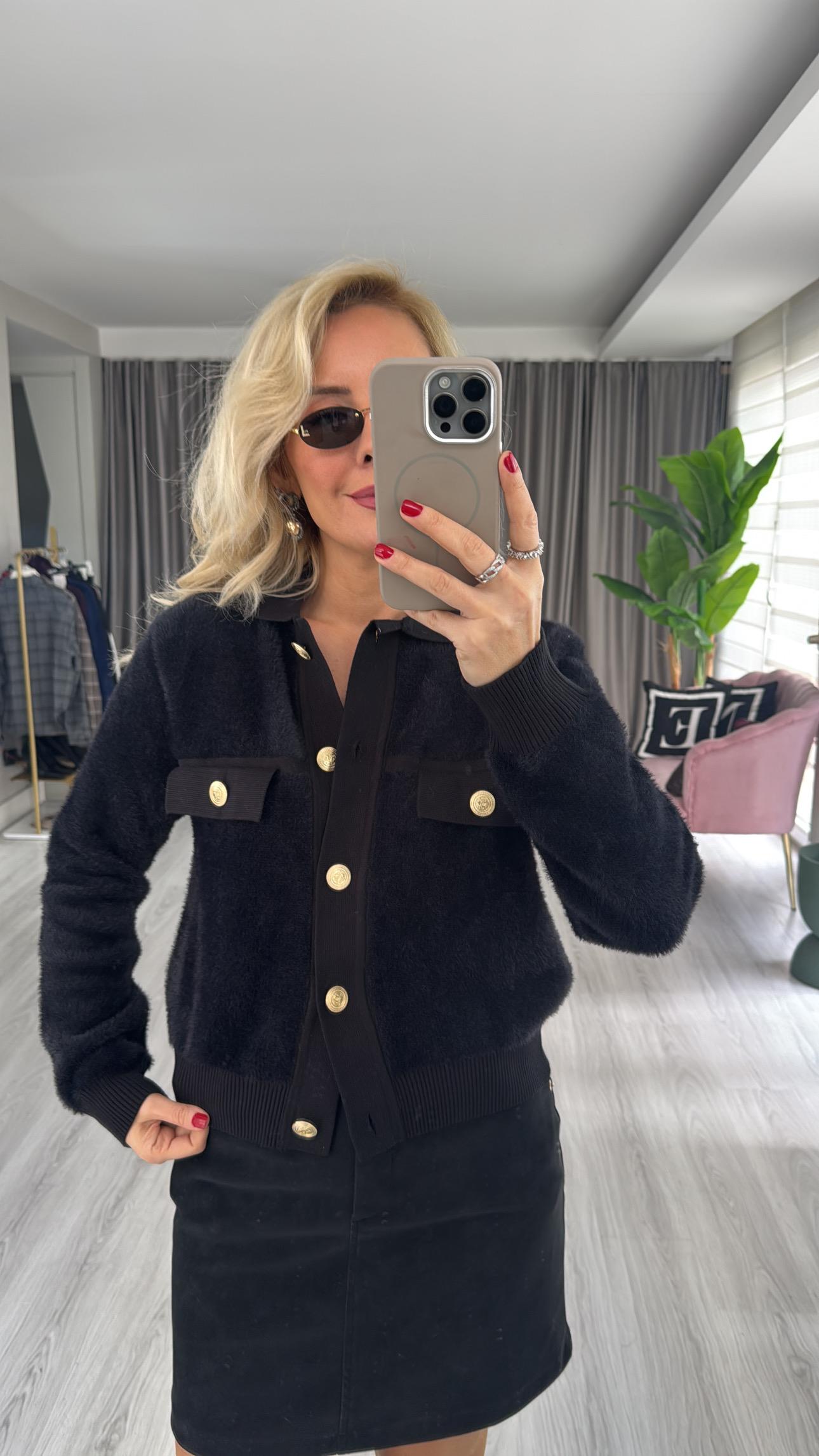 Premium Gold Düğmeli Sakallı Siyah Triko Ceket