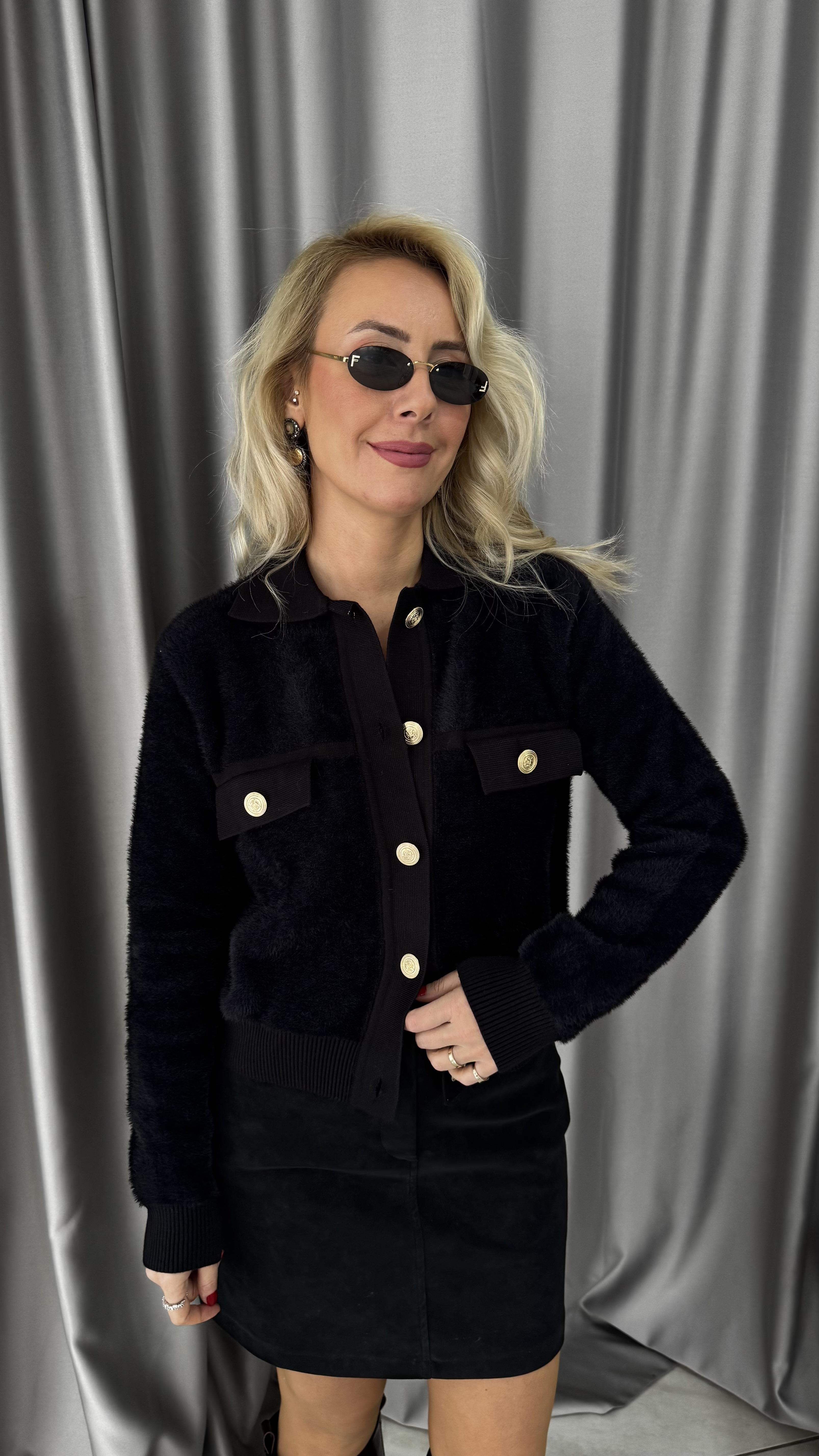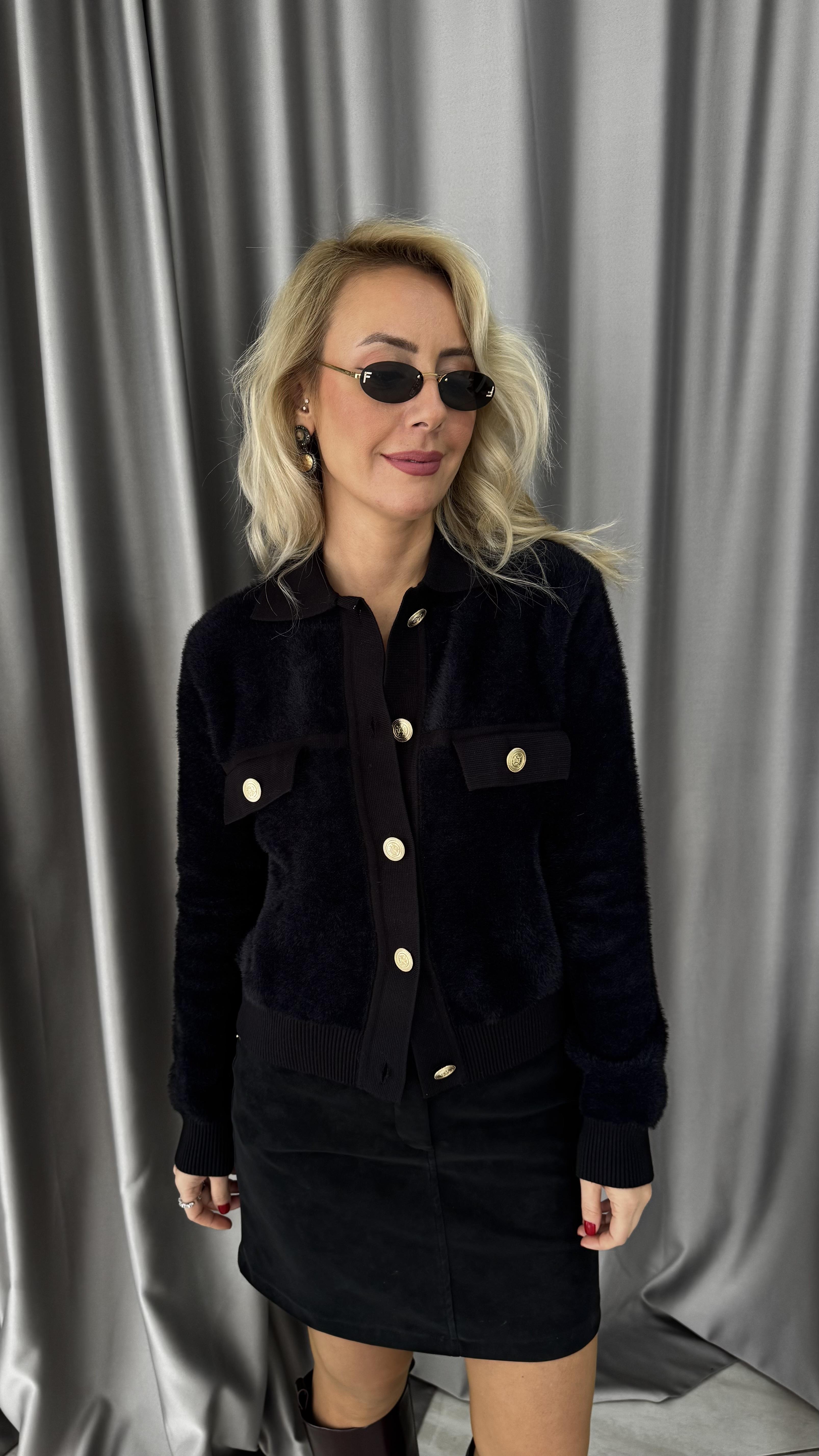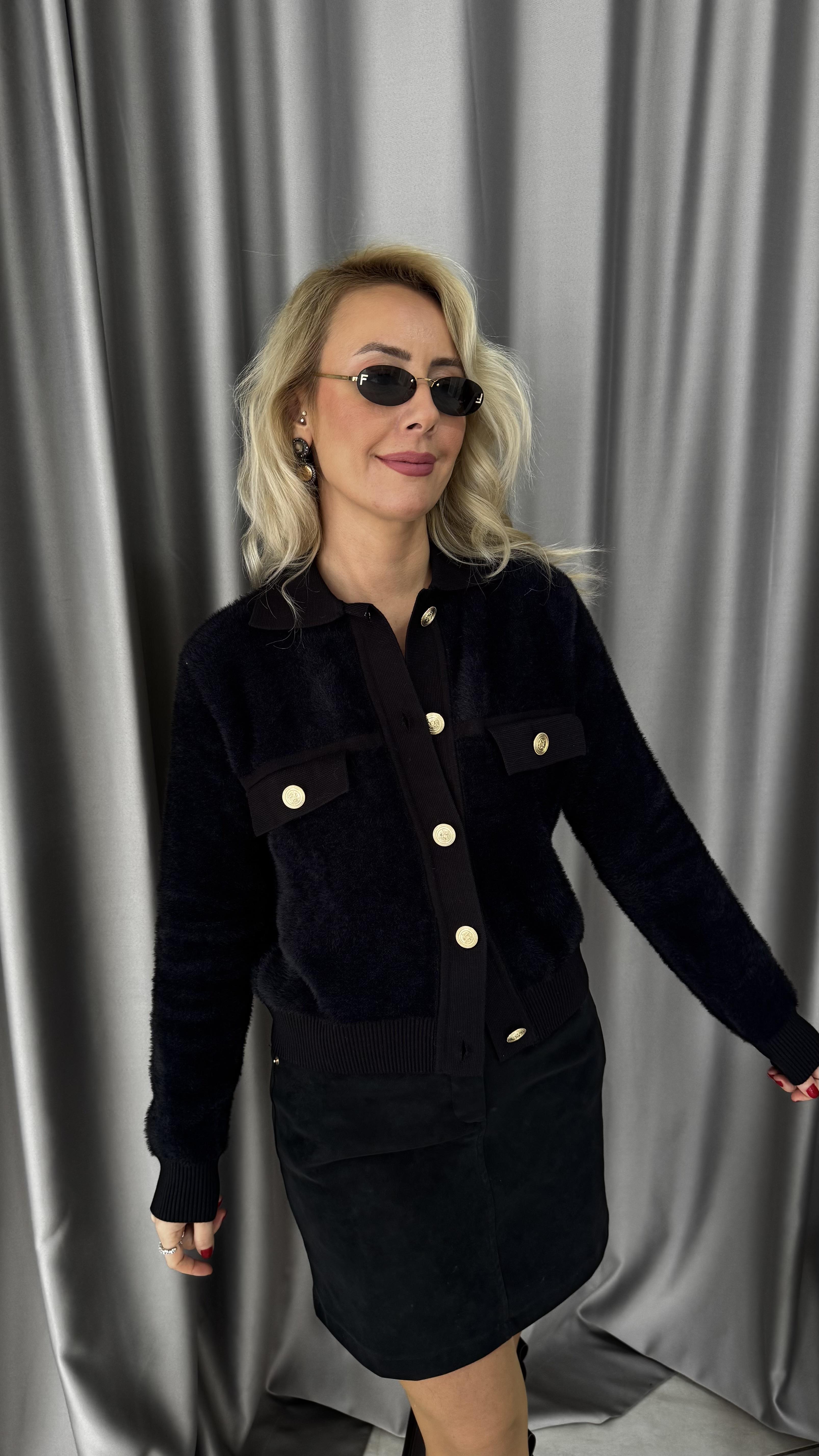 Premium Gold Düğmeli Sakallı Siyah Triko Ceket
