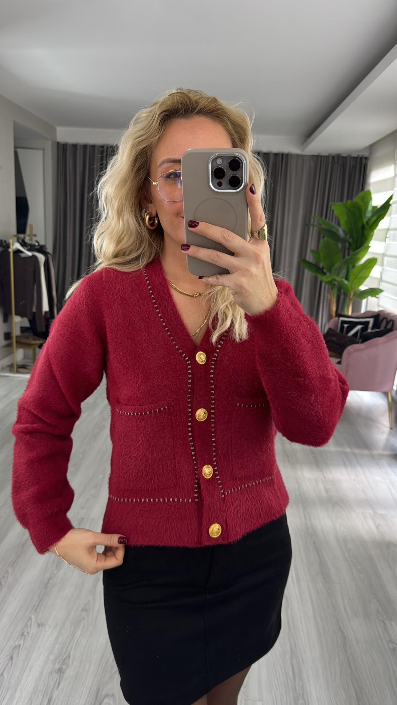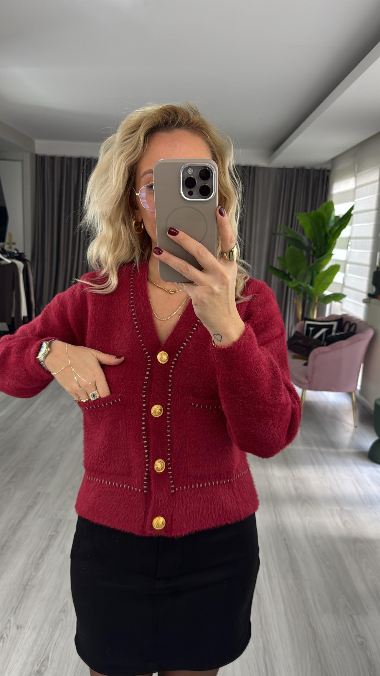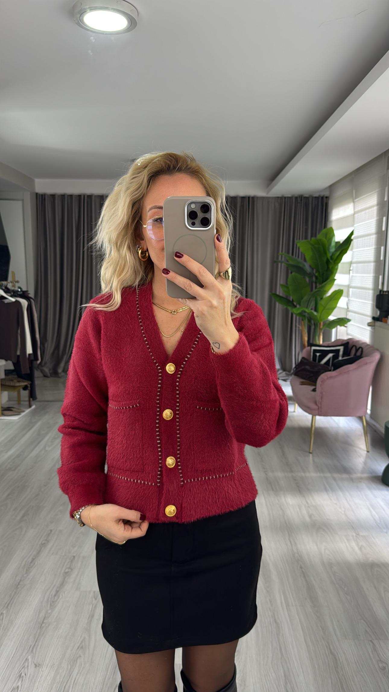 Premium Gold Düğmeli Sim Biyeli Kırmızı Triko Ceket