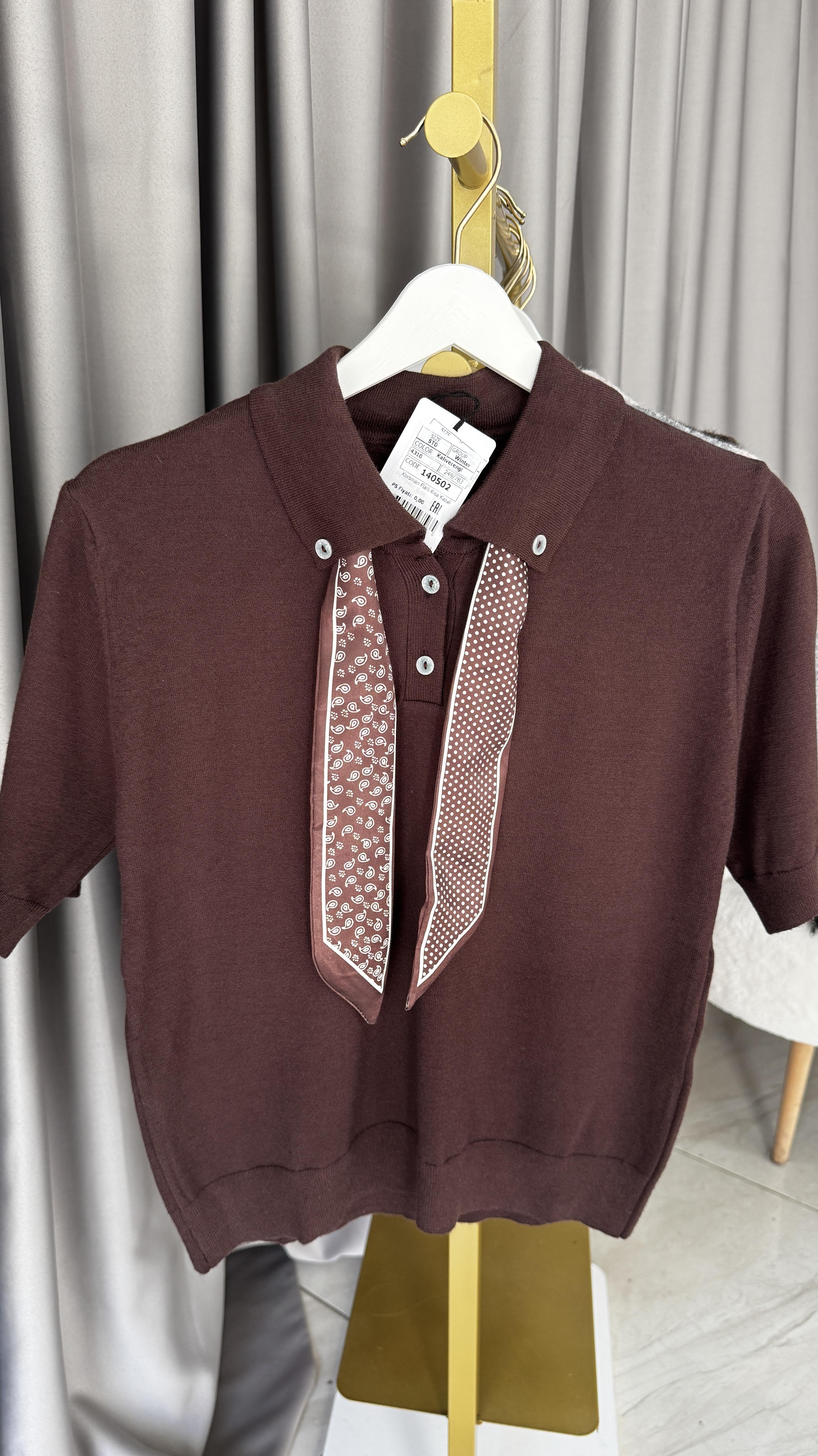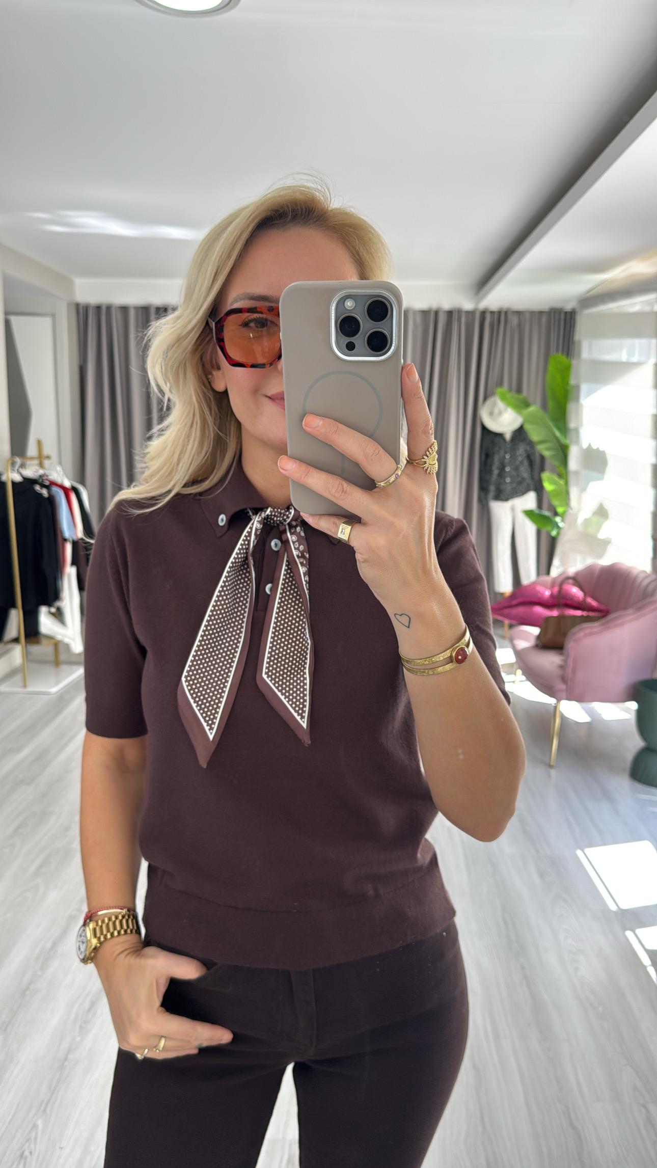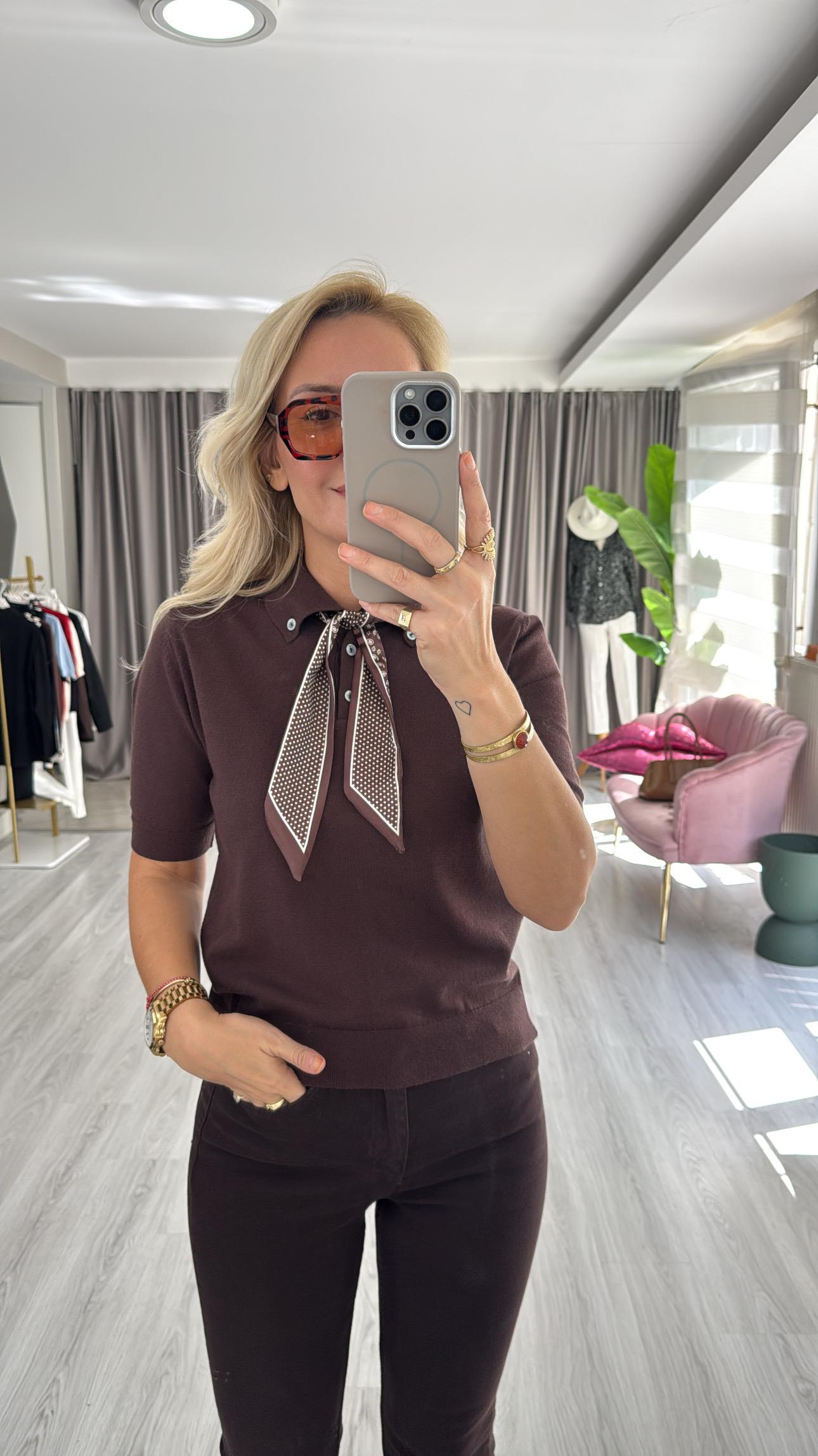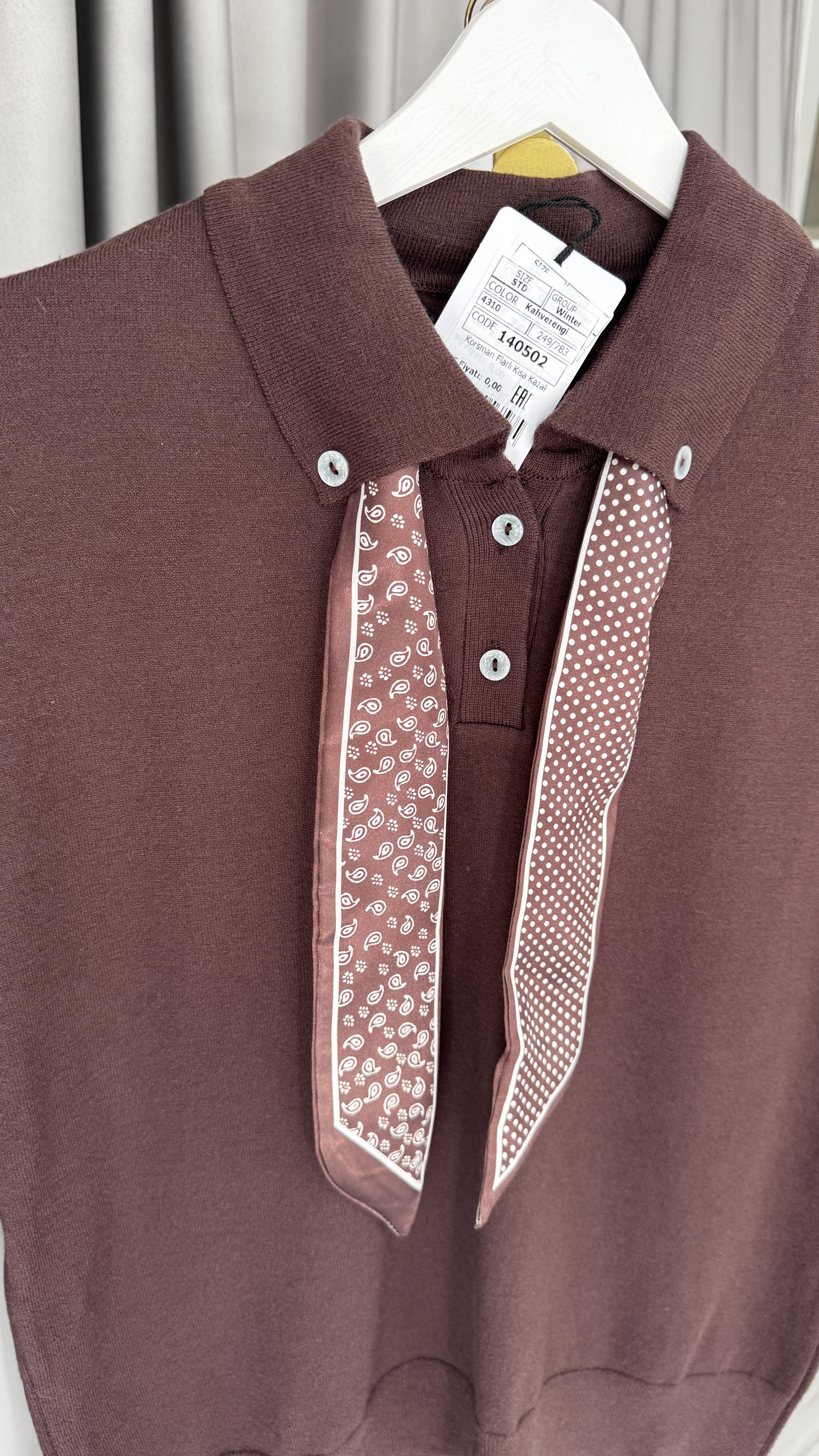 Premium Polo Yaka Fularlı Acı Kahve Triko
