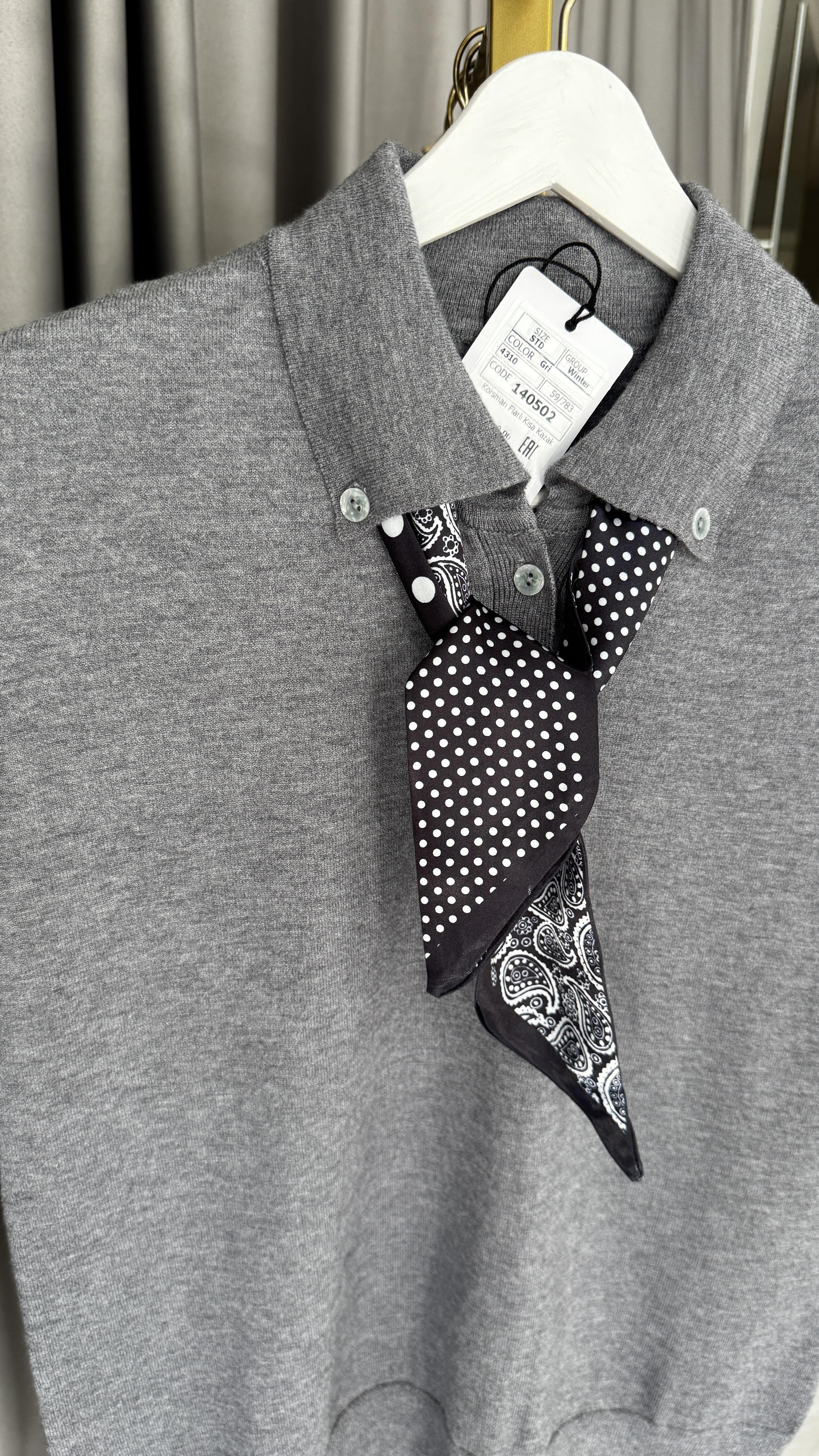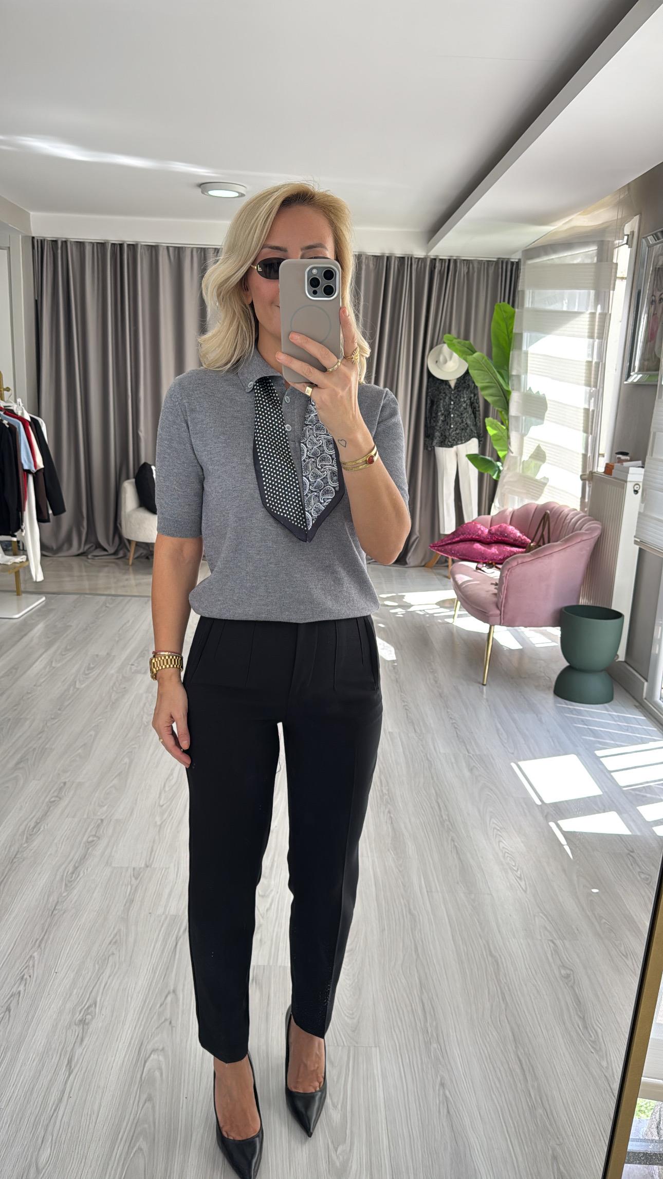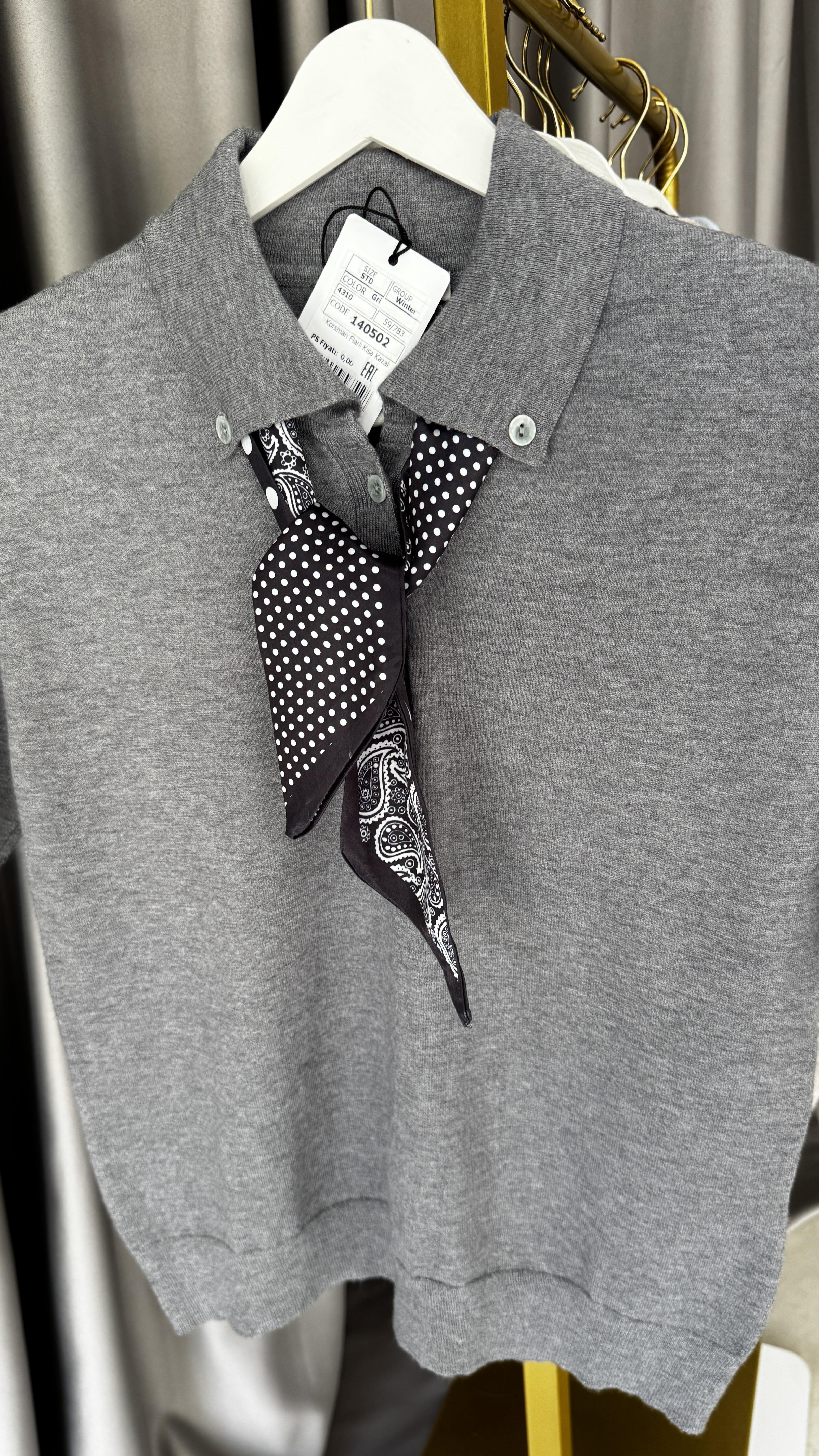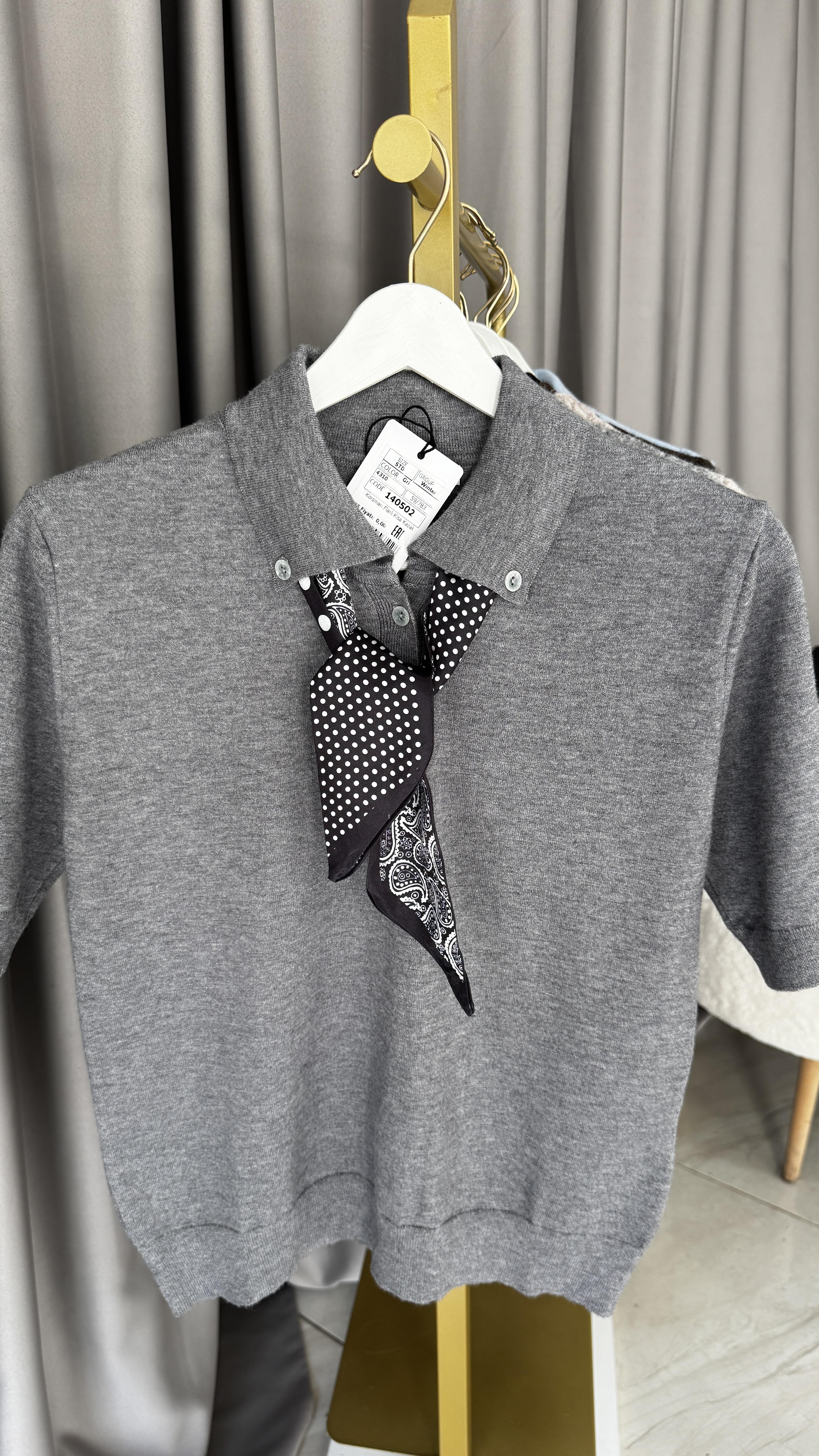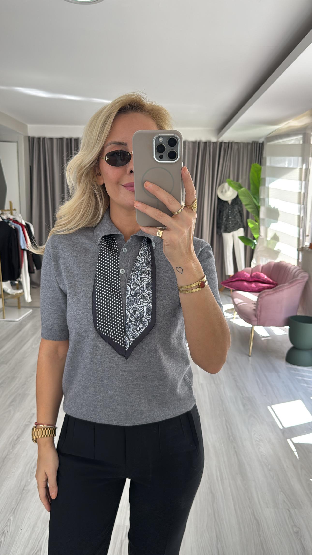 Premium Polo Yaka Fularlı Gri Triko