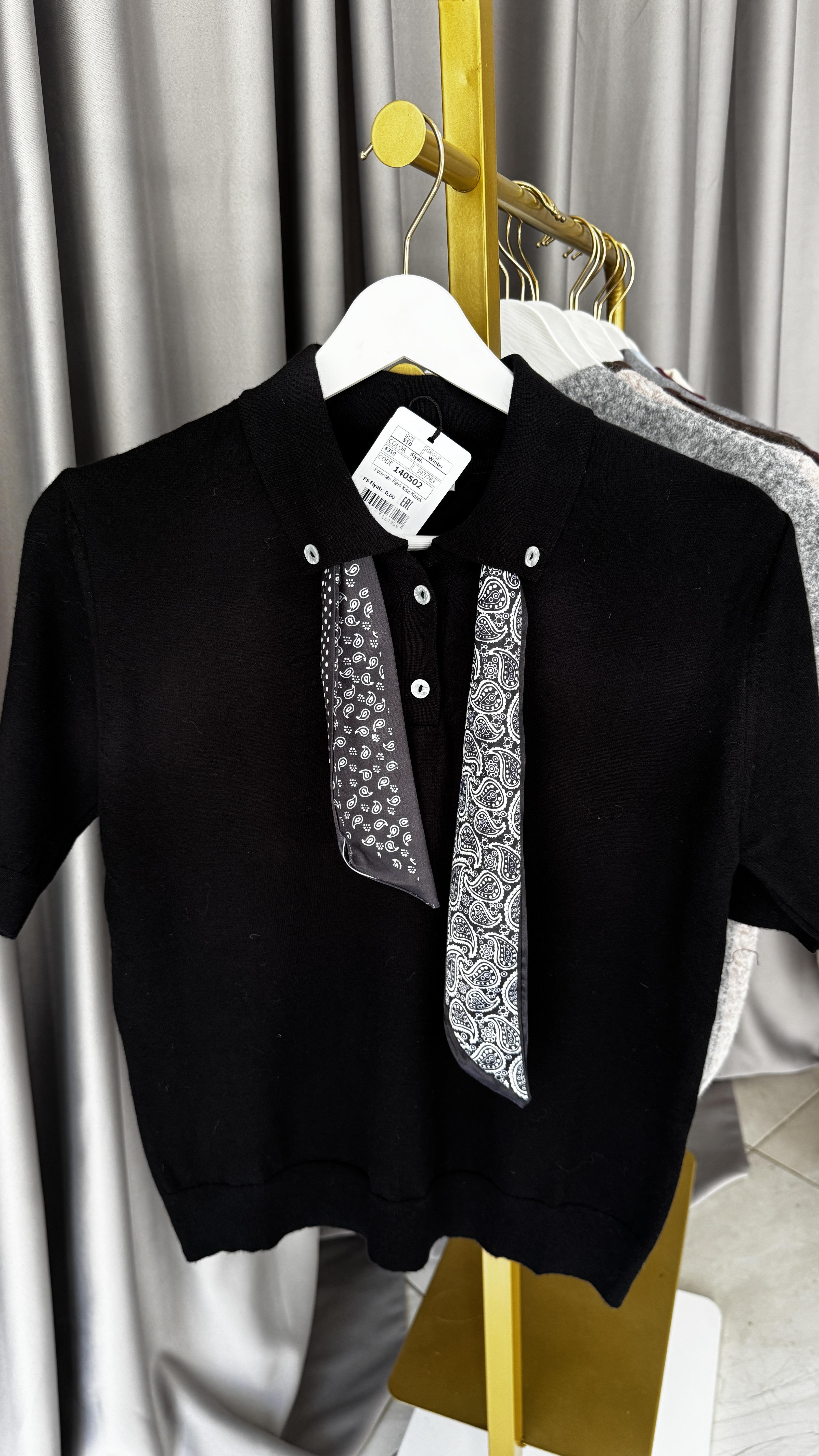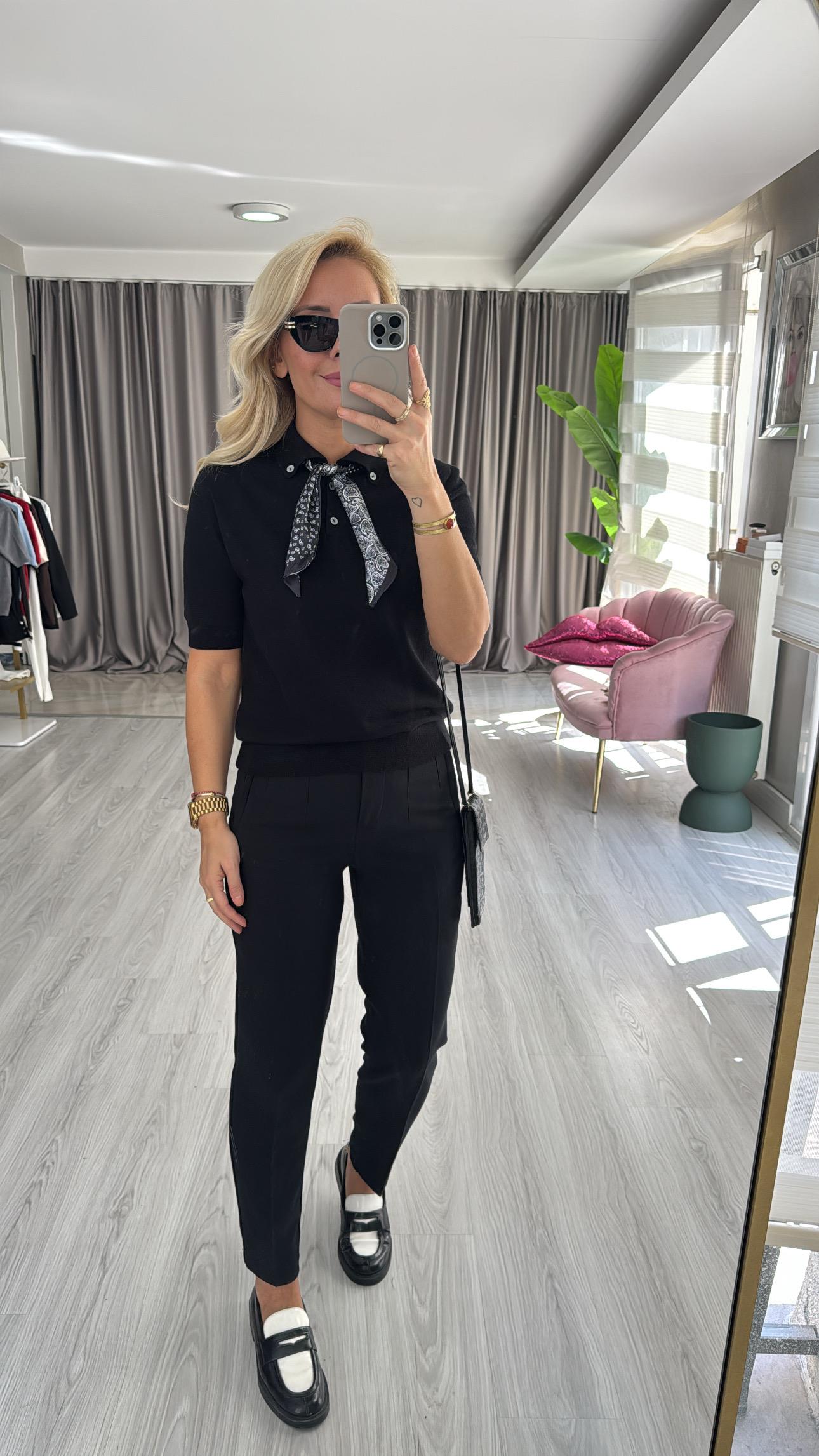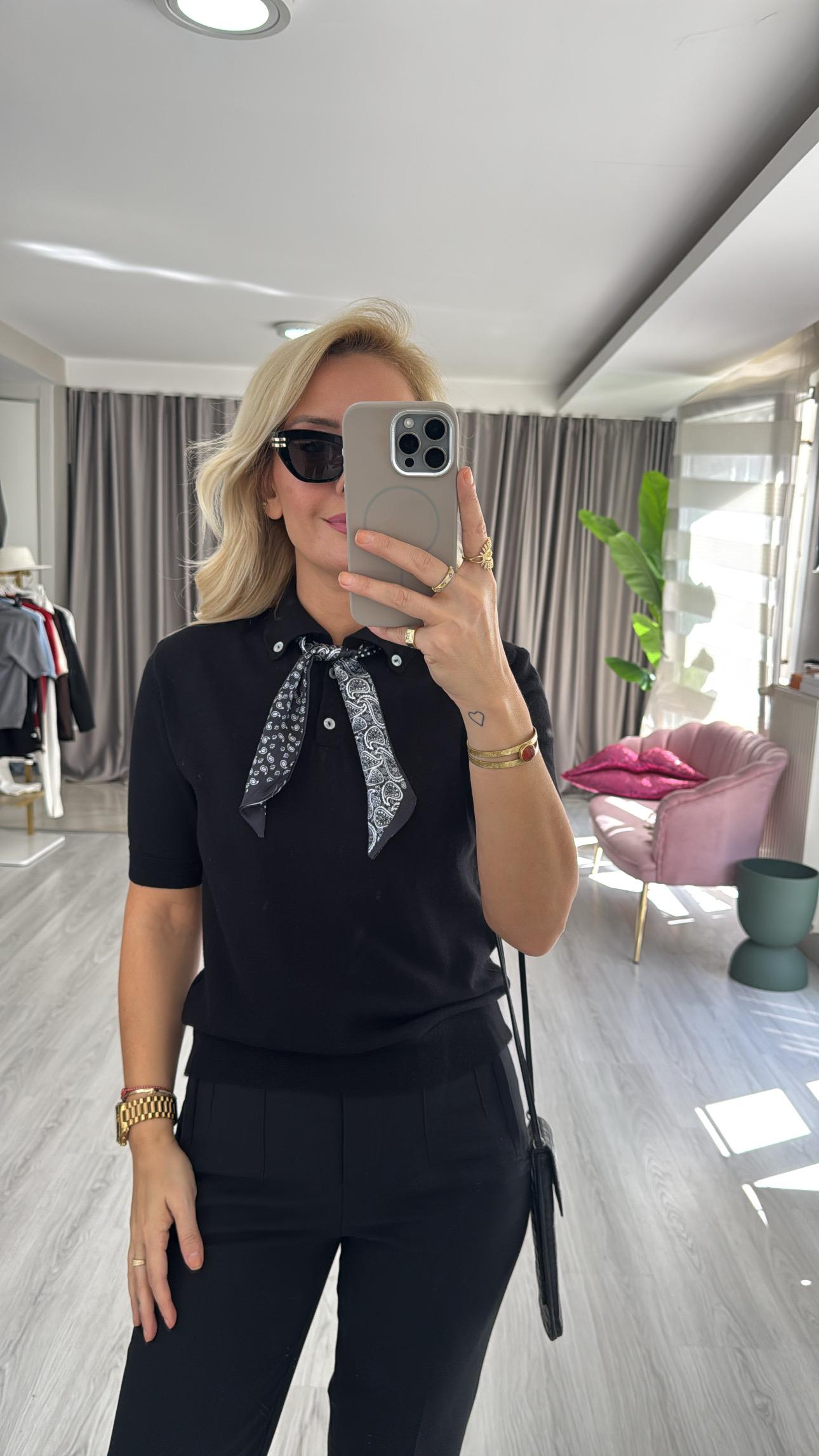 Premium Polo Yaka Fularlı Siyah Triko
