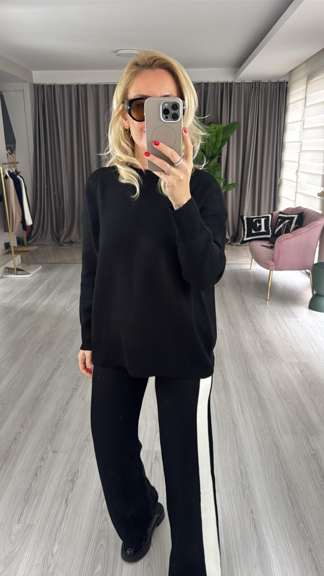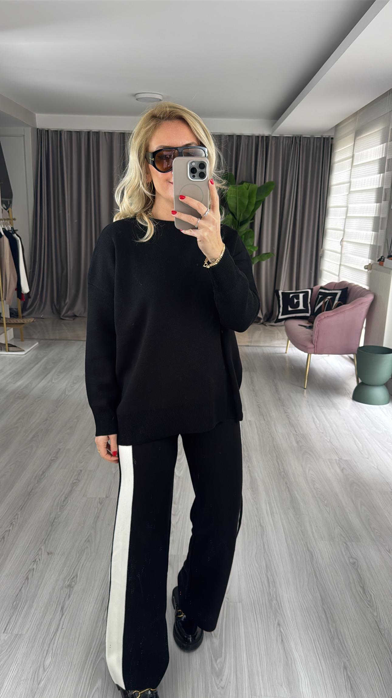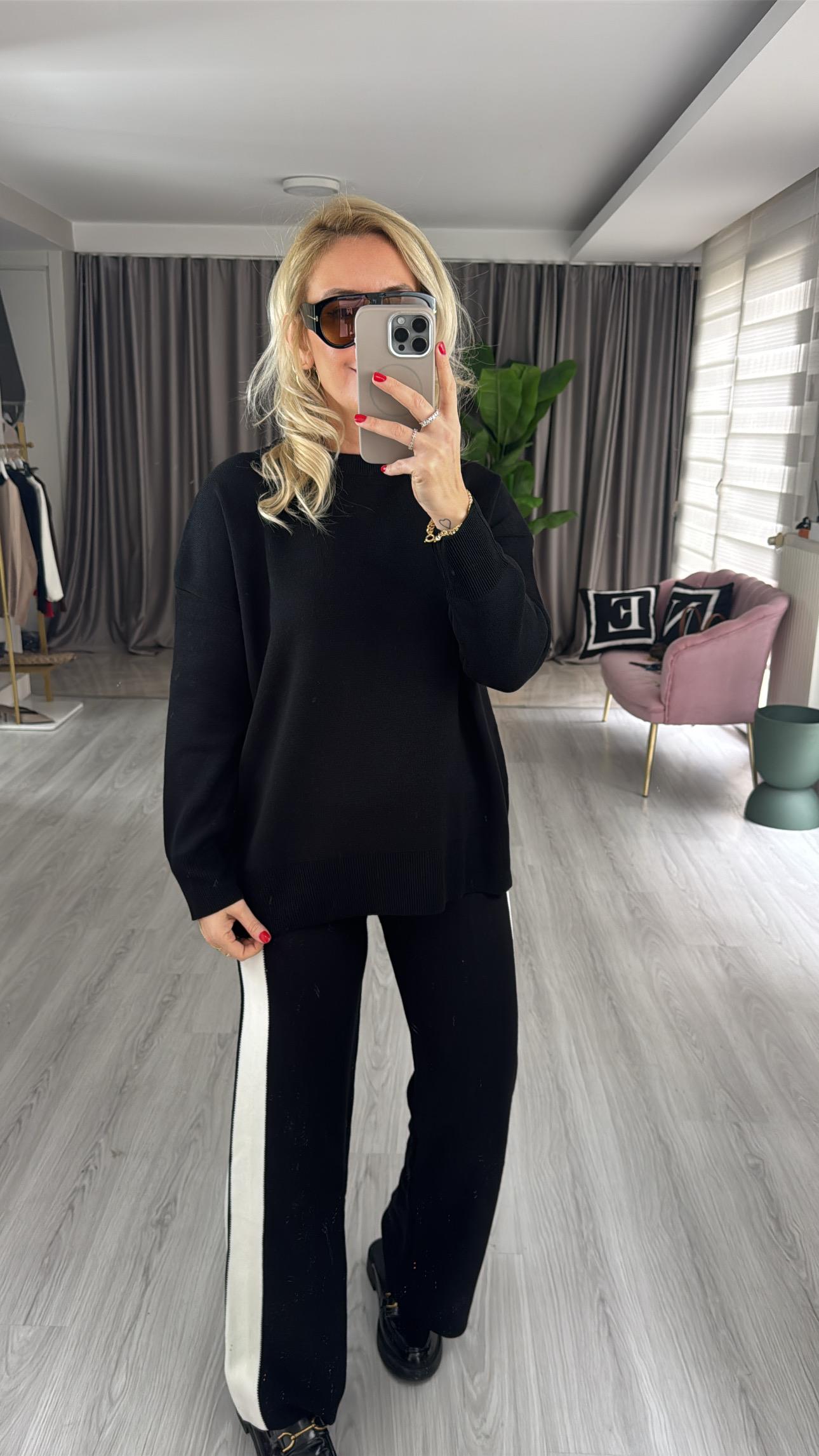 Premium Yanları Ekru Şeritli Siyah Triko Takım