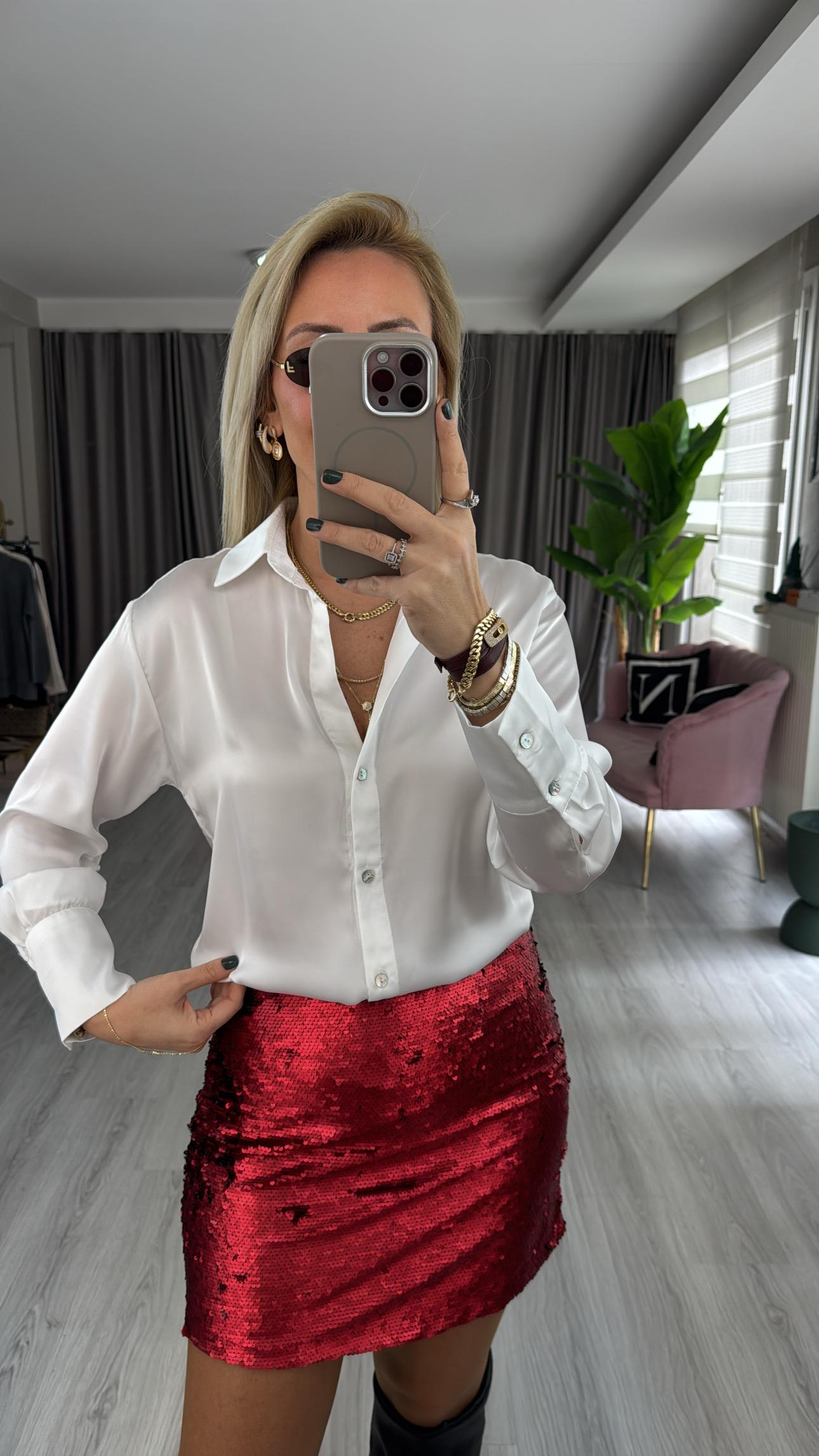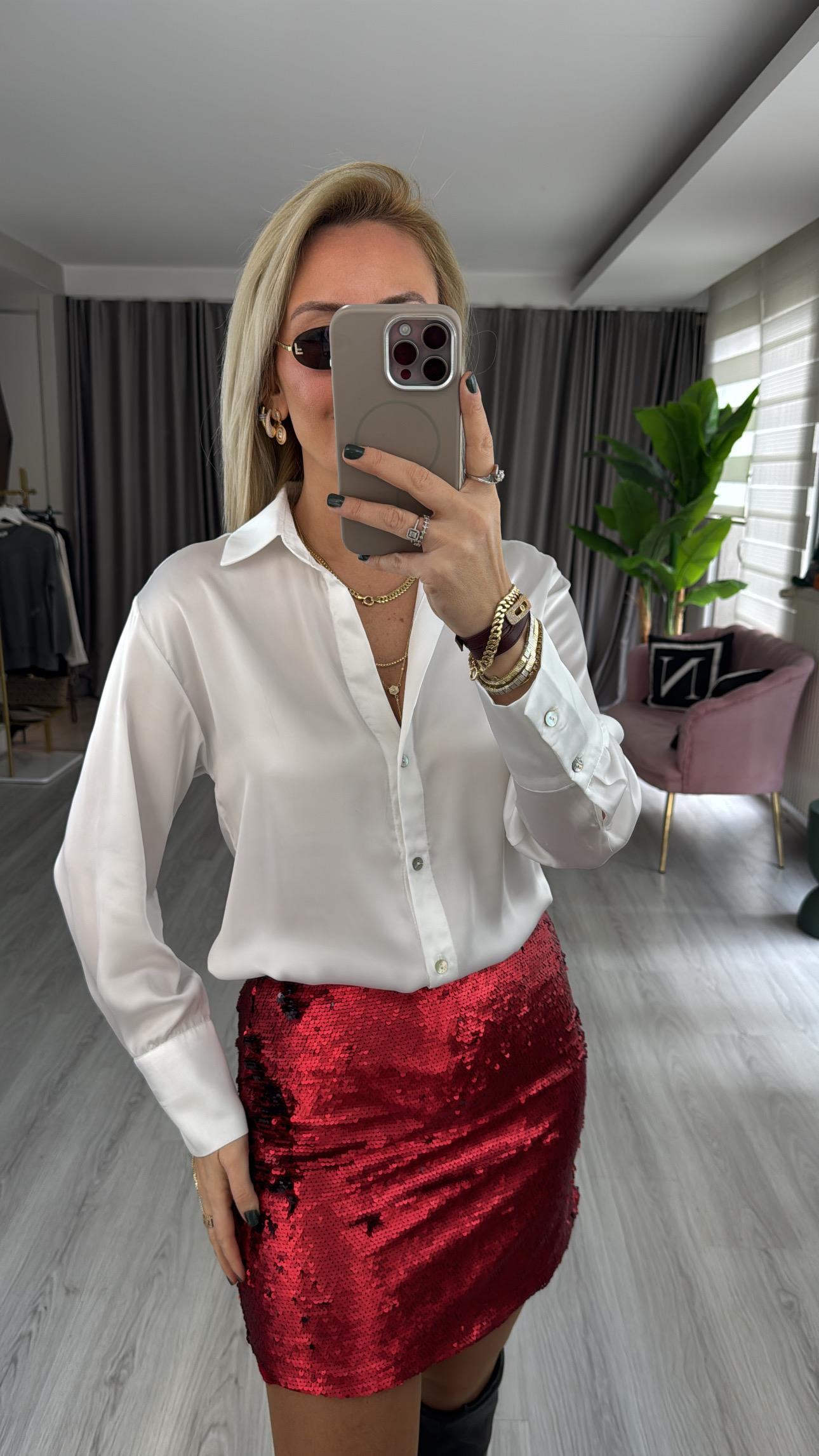 Sedef Düğmeli Ekru Saten Gömlek