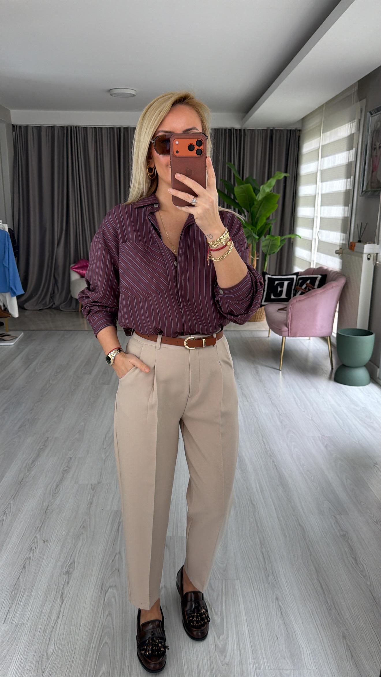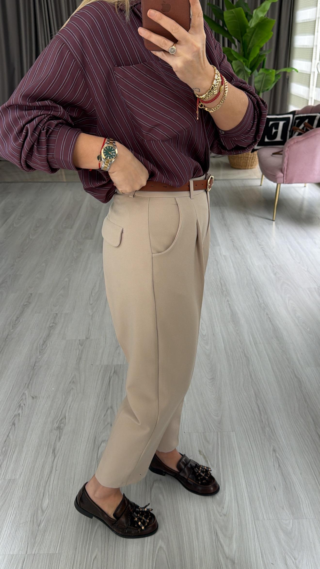 Taba Kemerli Likralı Beyaz Krep Pantolon