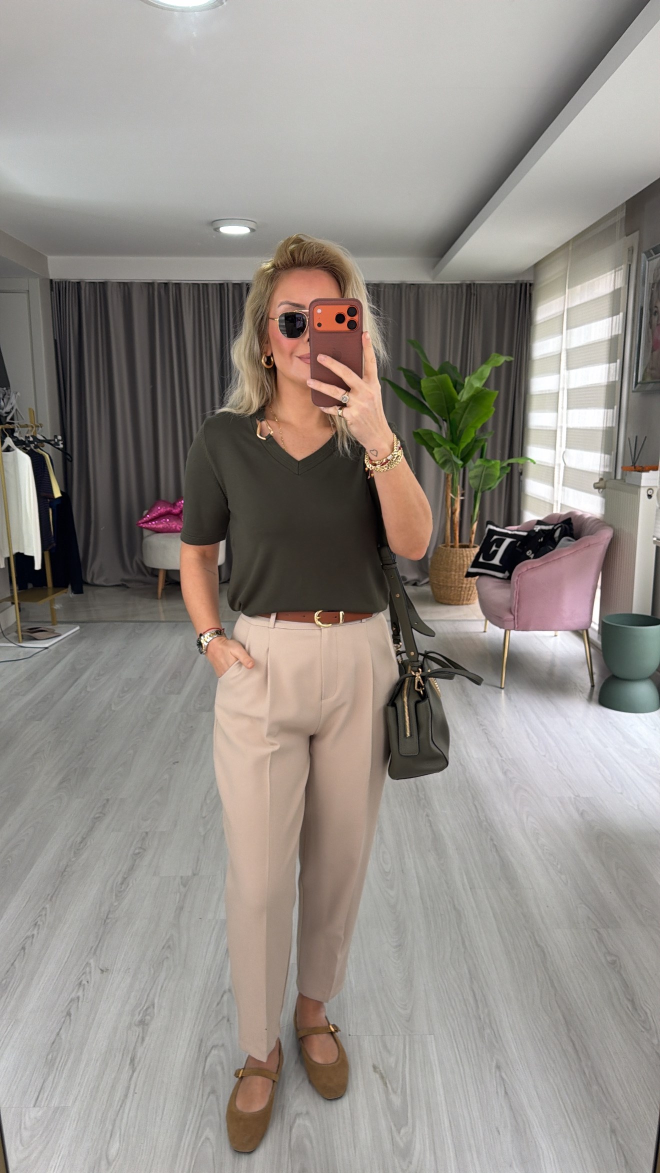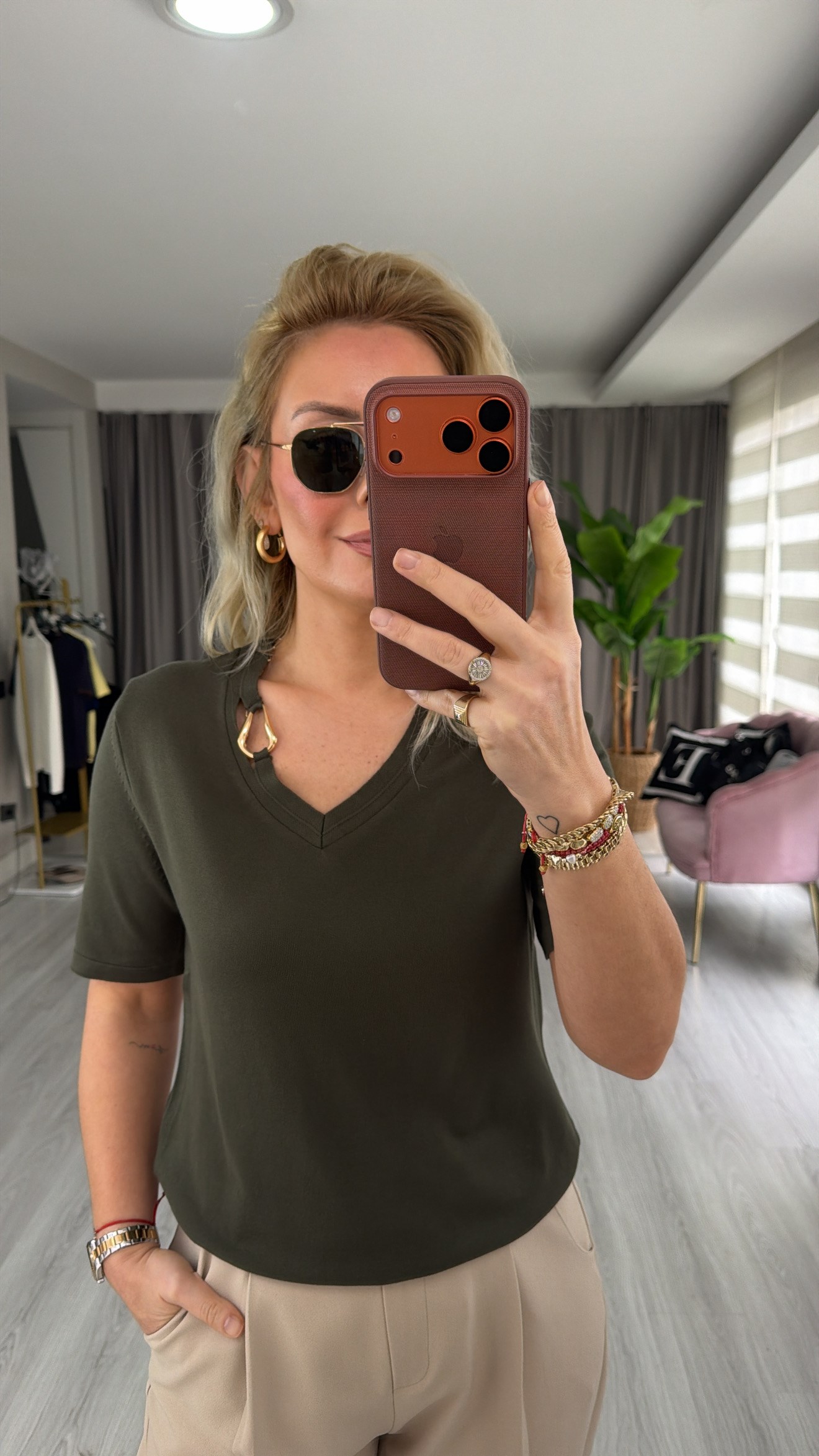 V Yaka Aksesuar Detaylı Haki İpek Dokulu Triko