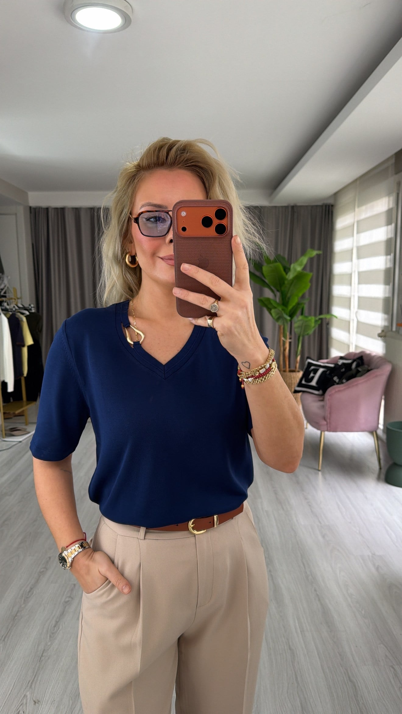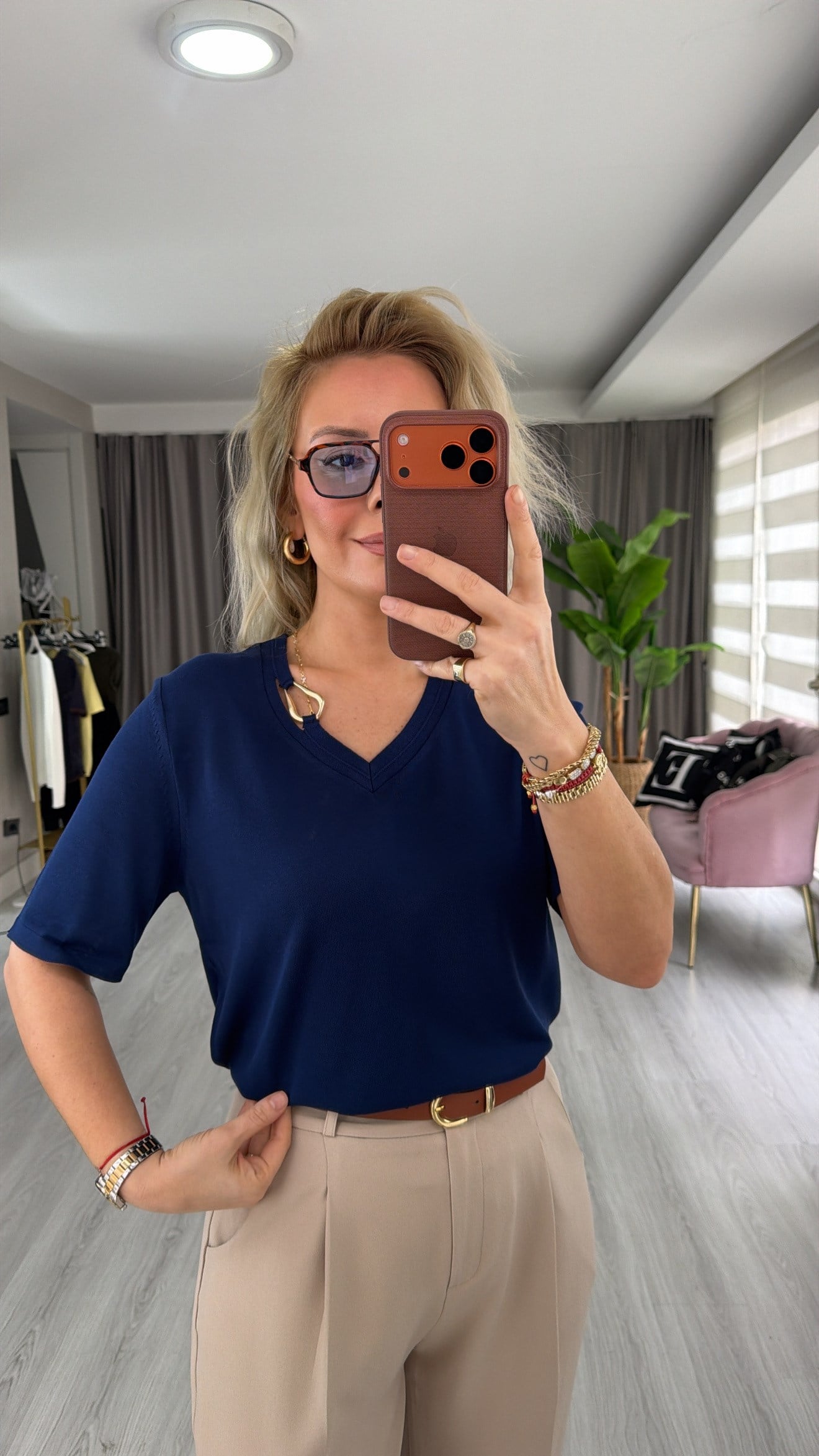 V Yaka Aksesuar Detaylı Lacivert İpek Dokulu Triko