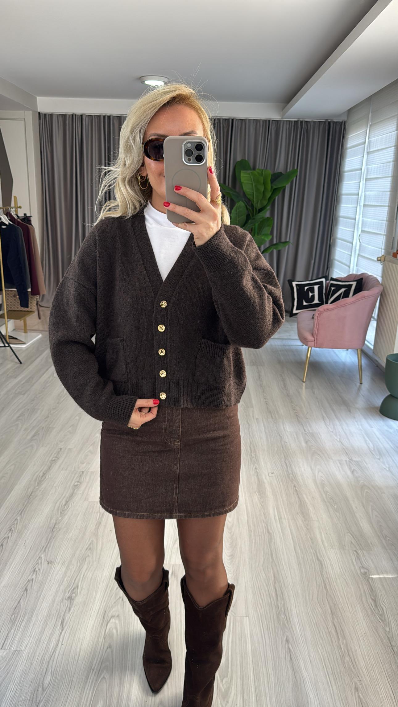 Dilvin V Yaka Gold Düğmeli Acı Kahve Triko Hırka