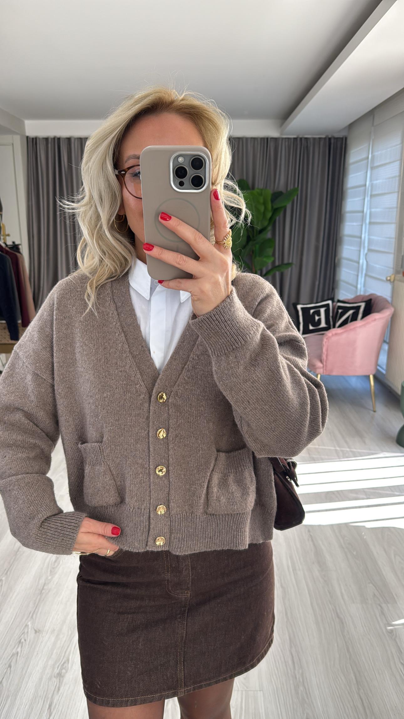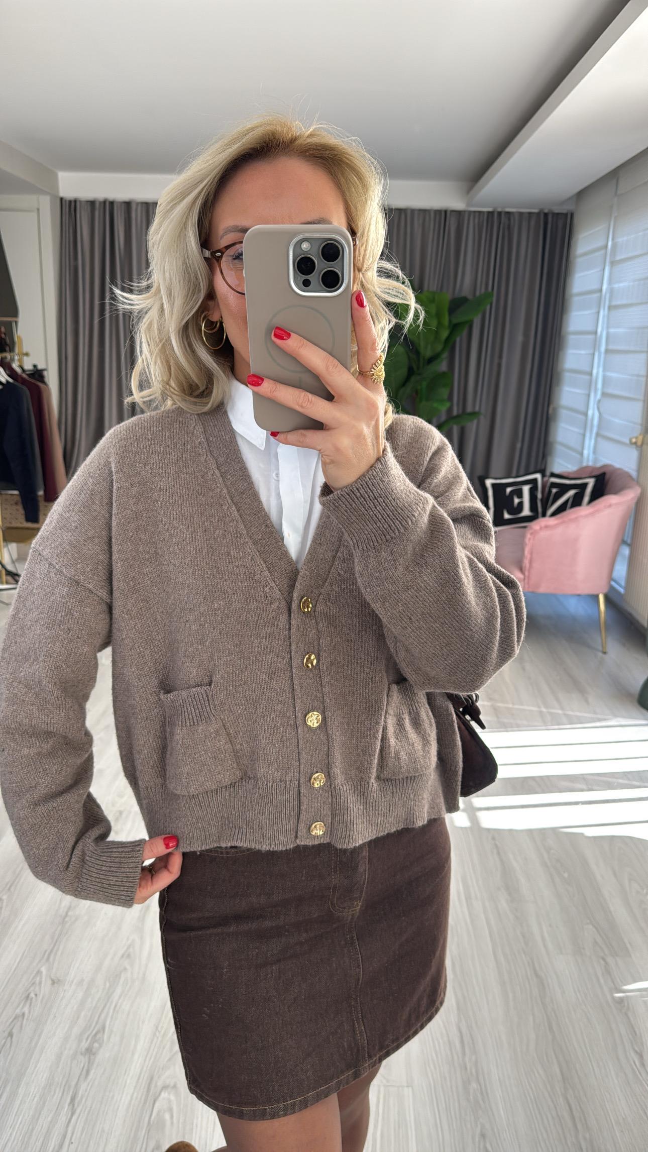 V Yaka Gold Düğmeli Cep Detaylı Vizon Triko Hırka