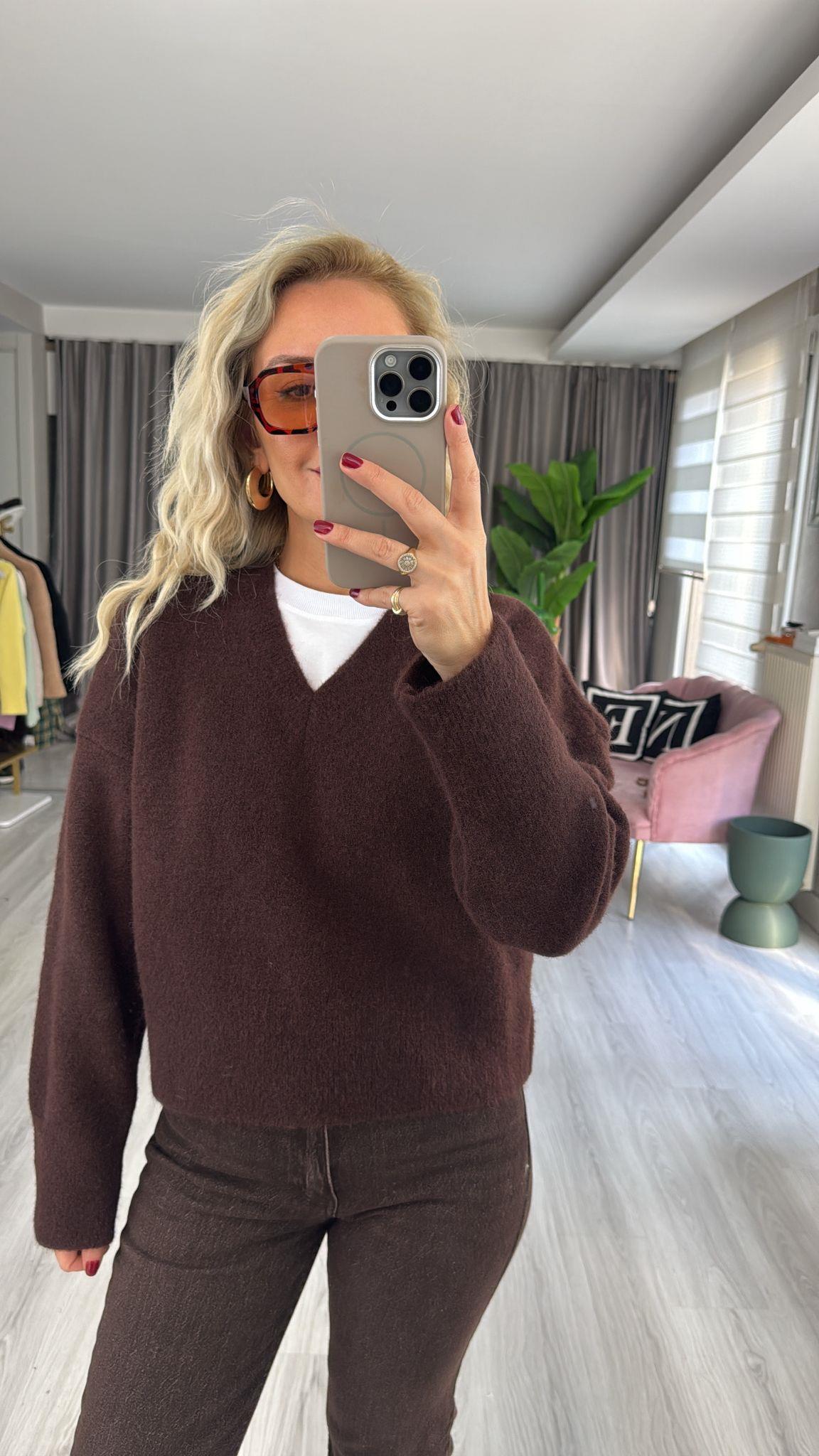 Dilvin V Yaka Yumuşak Dokulu Acı Kahve Triko Kazak