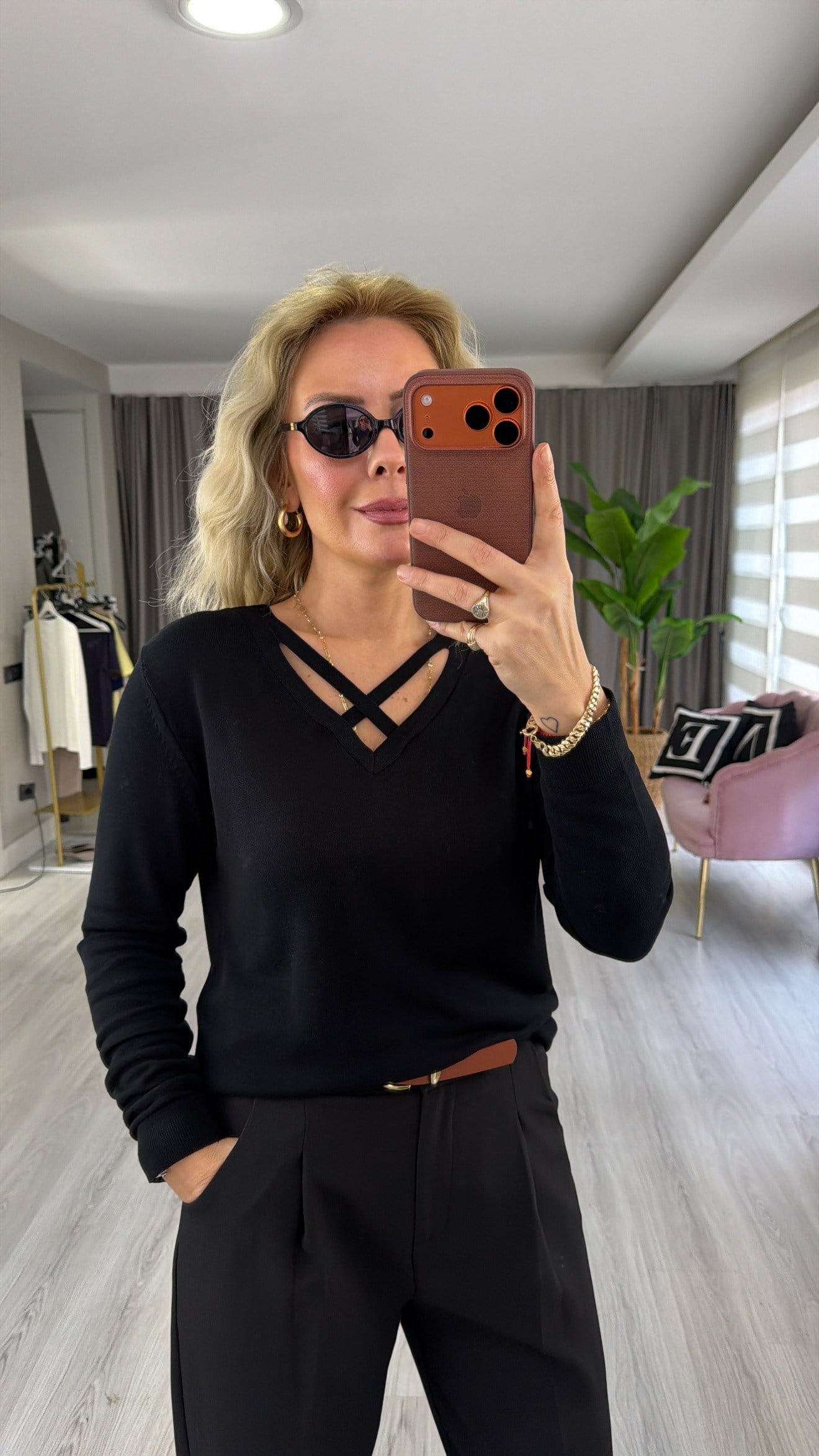 Yaka Detaylı Siyah İpek Dokulu Triko