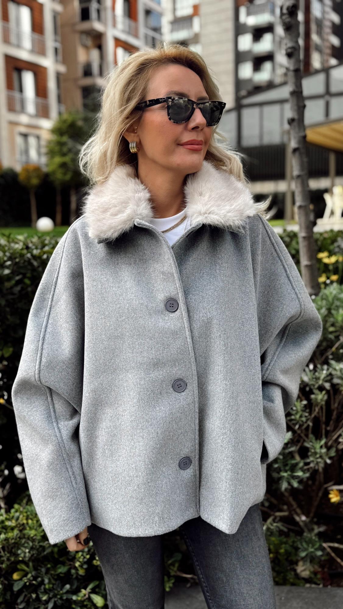 Yakası Çıkarılabilir Kürk Detaylı Gri Kaşe Kaban