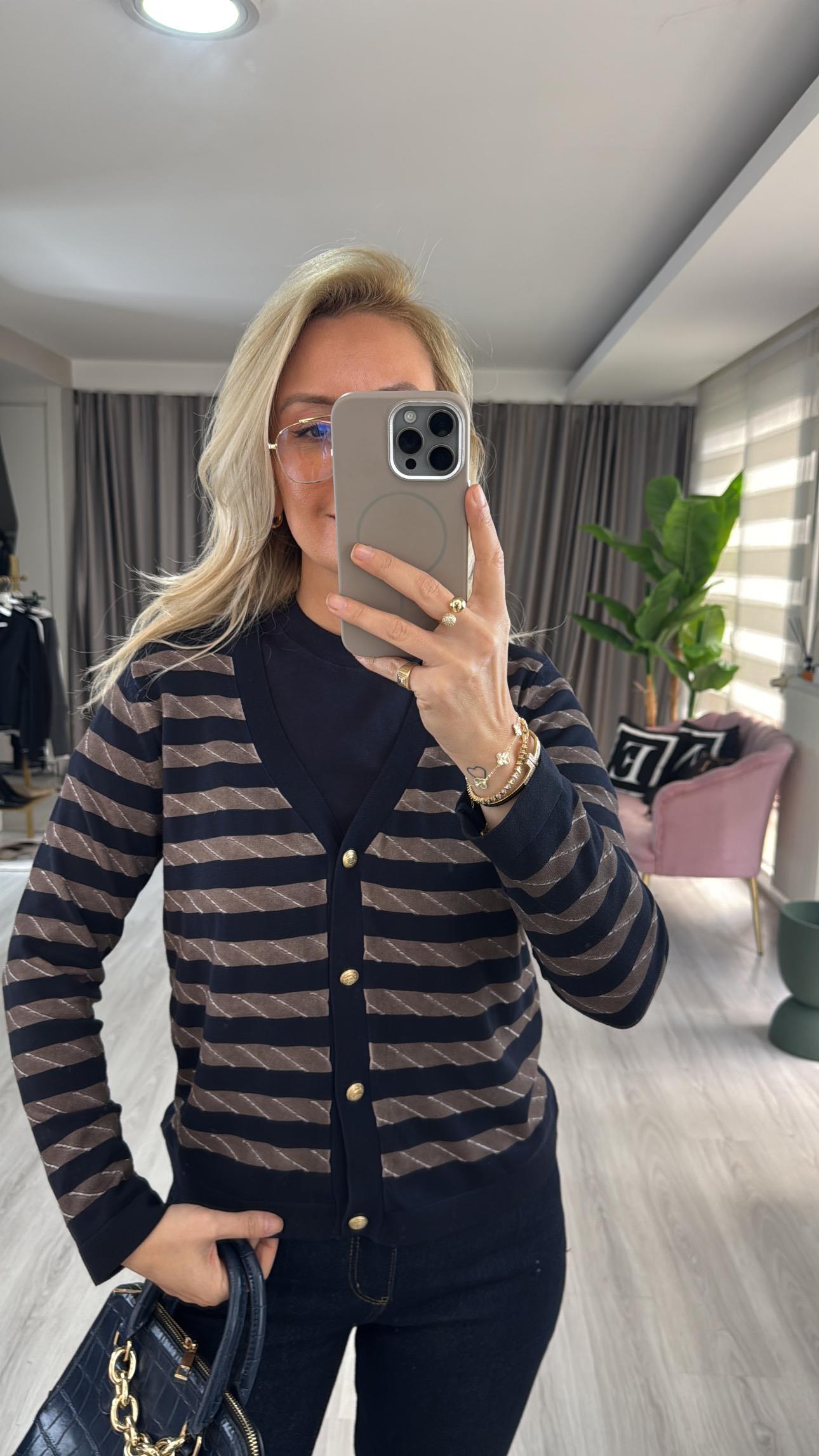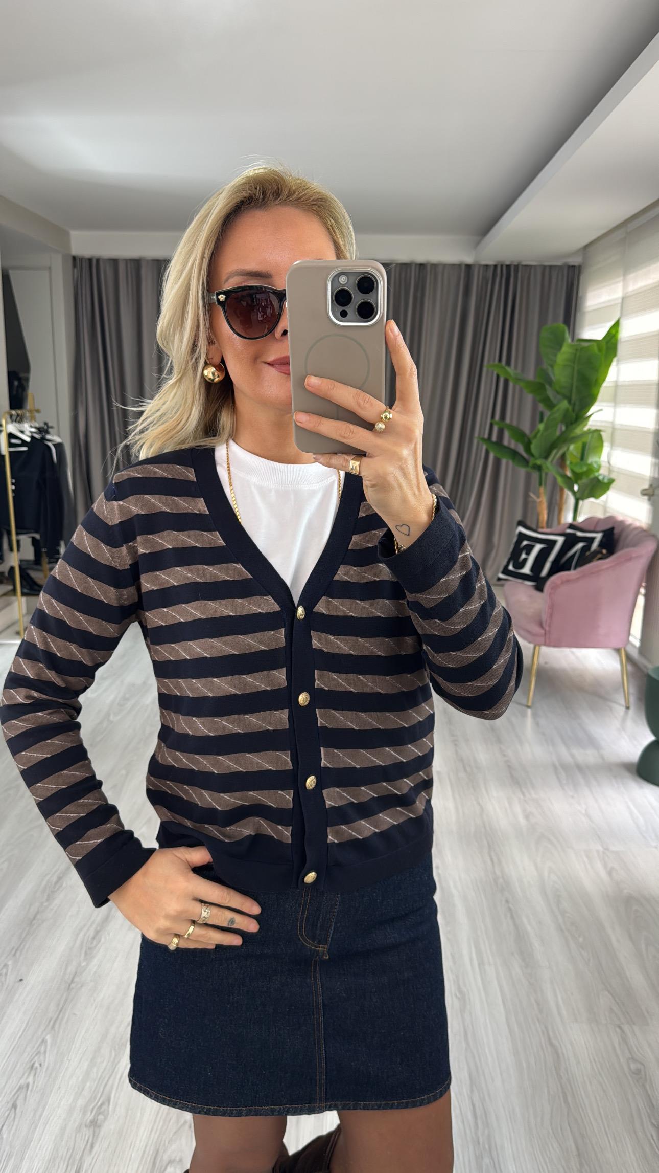 Yıkamalı Kahve Çizgili Lacivert Triko Hırka
