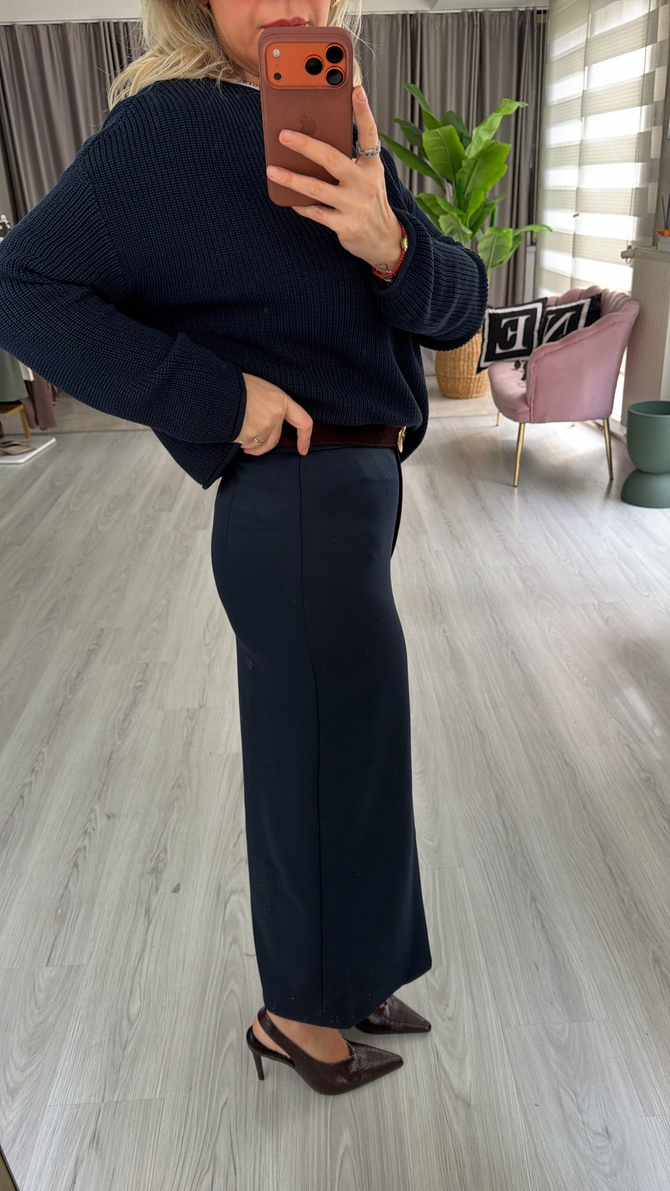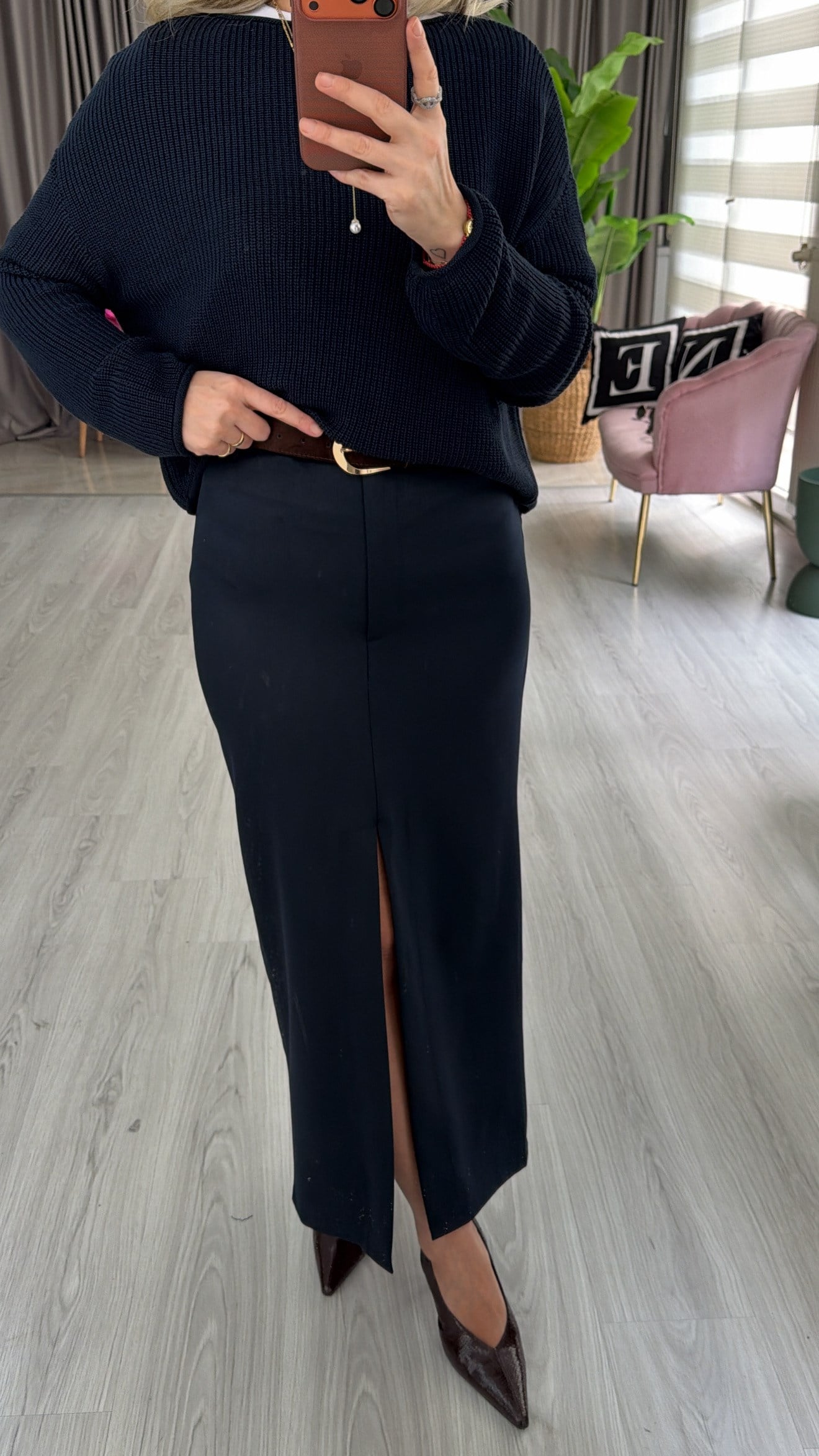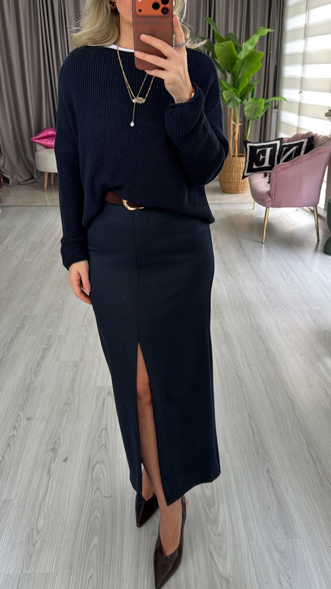 Yırtmaçlı Lacivert Midi Kalem Etek